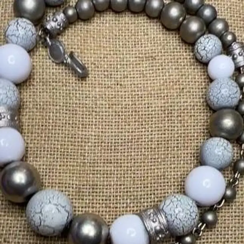 19" gray, silver, white and crackle beaded necklace