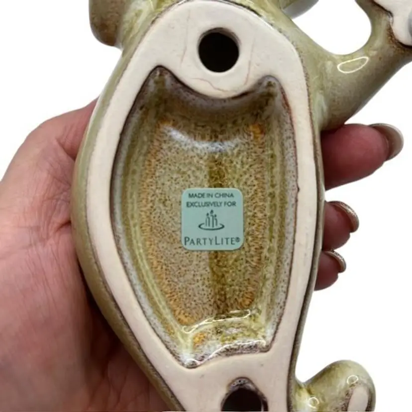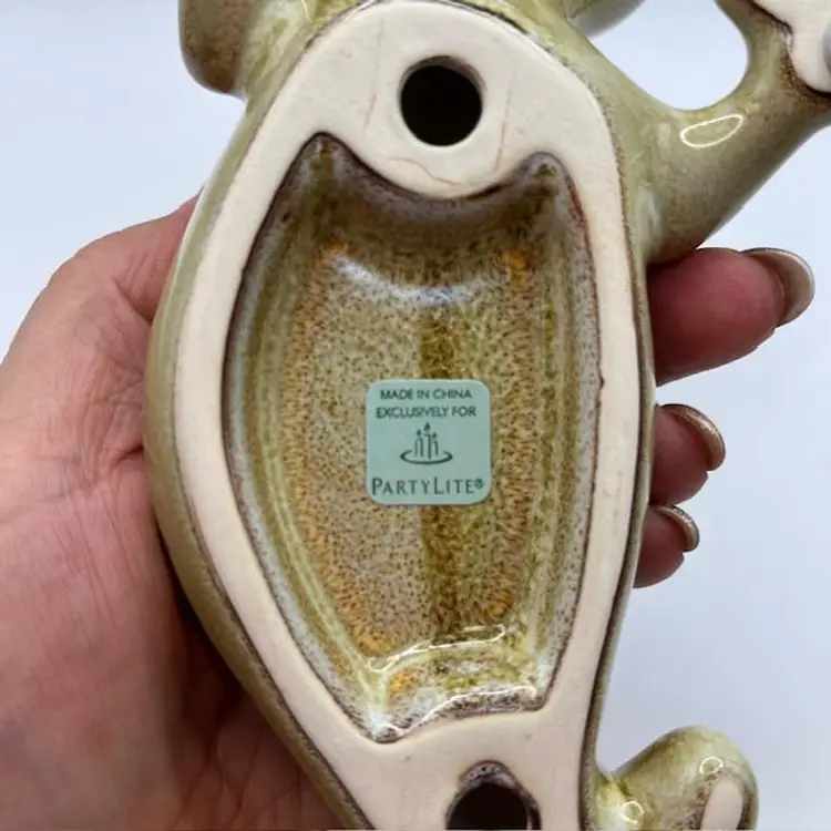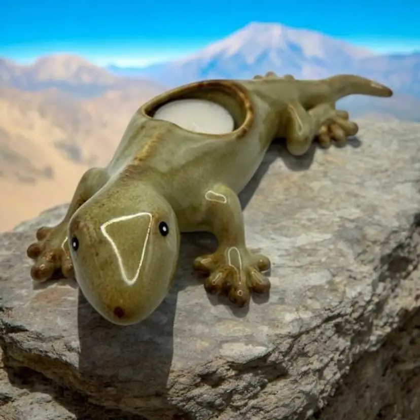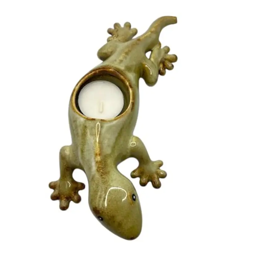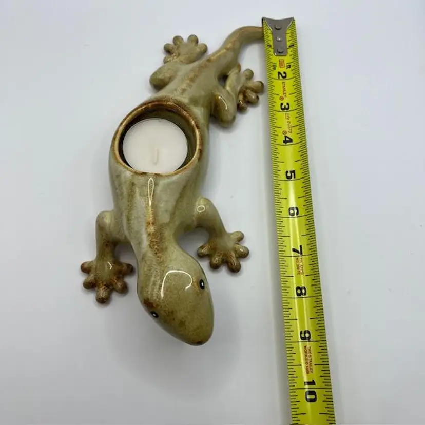 Charming lizard/gecko-shaped ceramic candle holder, perfect for adding a touch of whimsy to your decor. Holds a single votive candle.