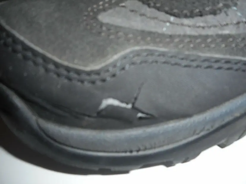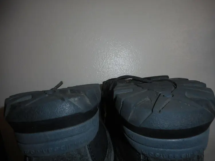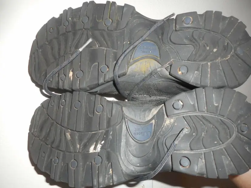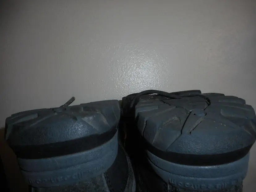 Little to no obvious wear on sole, these are marked waterproof, but the vinyl like covering on both toes has cracked - see second photo - the issue is similar on both shoes - it doesn't appear to have effected the shoe underneath, but that thin waterproof covering is cracked all along the toe of each shoe. Had these around for about 10 years. Otherwise they seem overall very nice - a decent pair of shoes that passes the twist test. As long as you aren't looking to go through water these should work for you.