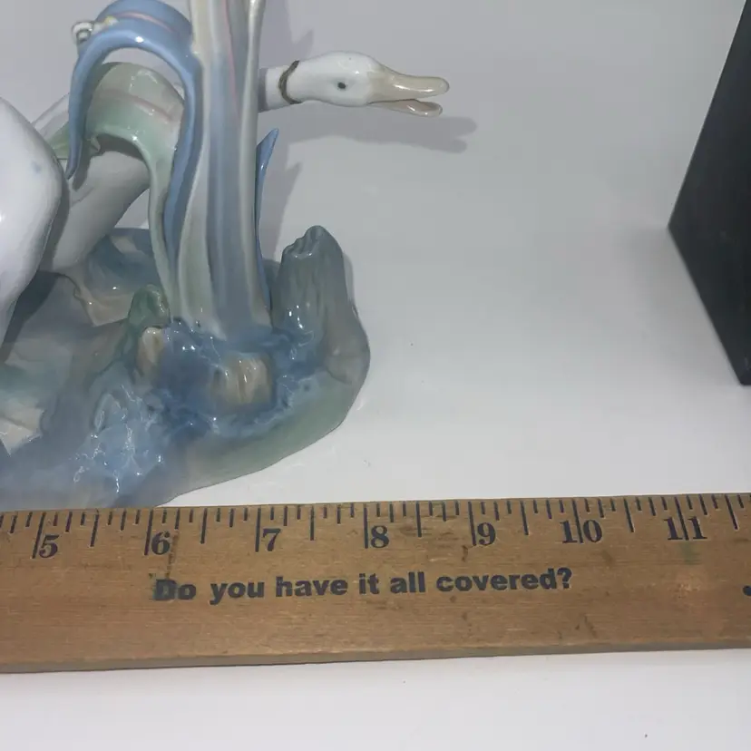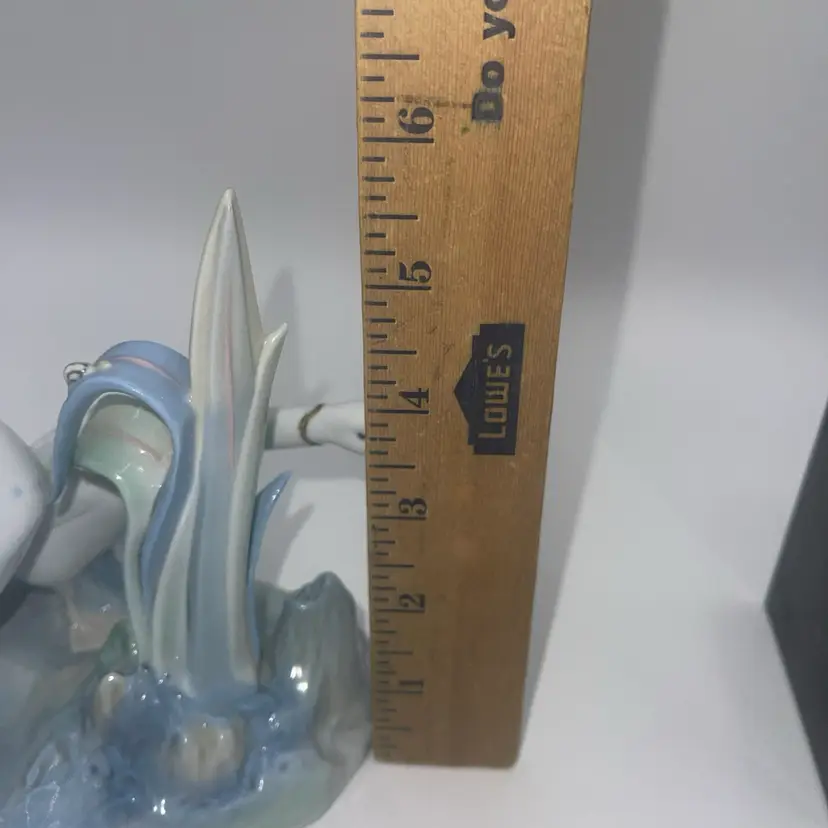 It measures approximately 8 1/4” x 5.75” you have three swans and there is a snail on the leaf blues and greens on the bottom. It is marked LLADRO Spain I do not have the original box, but it will be packaged for safe shipment. Thank you for looking.