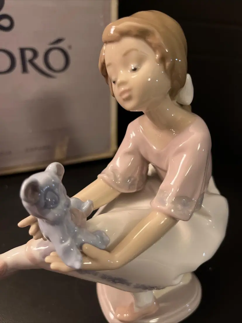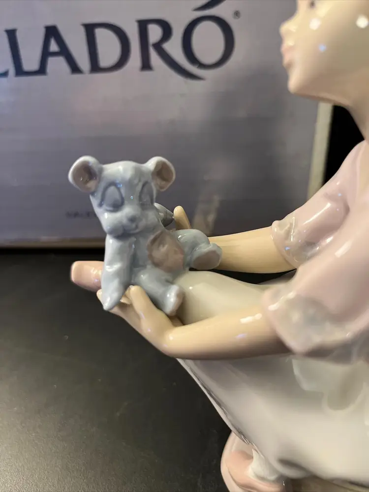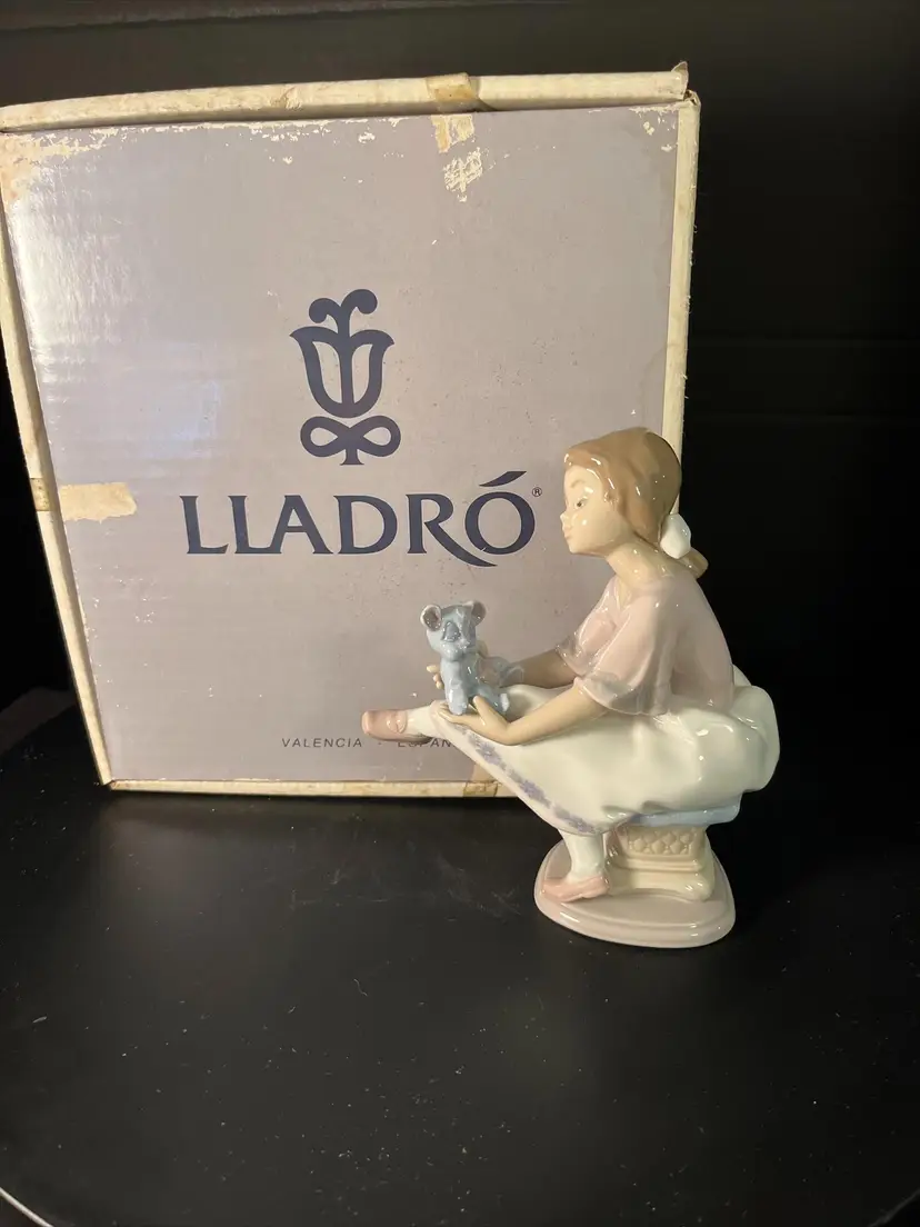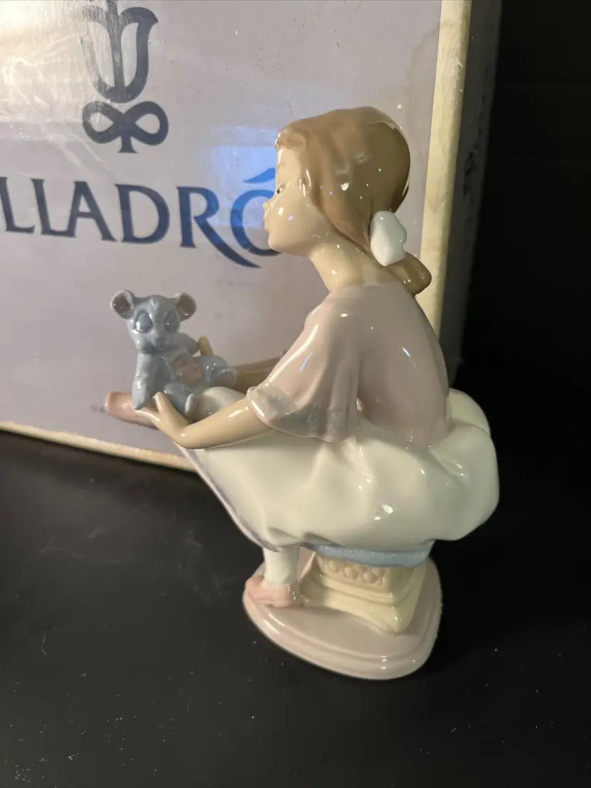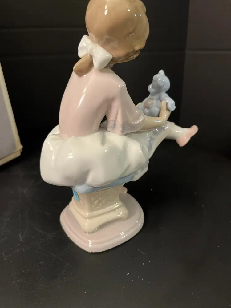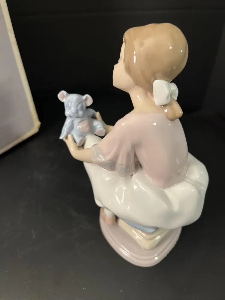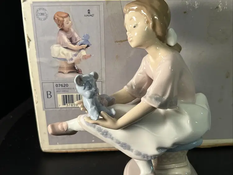 This Lladro figurine, #7620 "Best Friend", depicts a young girl with a blue teddy bear. It was manufactured in 1993 and has since been retired, making it a must-have for collectors. The porcelain figurine is medium-sized, measuring 6 inches in length, 6.25 inches in height, and 2.5 inches in width. The figurine is beautifully glazed and handmade, with intricate details that showcase the artist's skill. It comes with its original box and is in excellent condition. The item is perfect for any occasion and is sure to be a cherished addition to any collection.