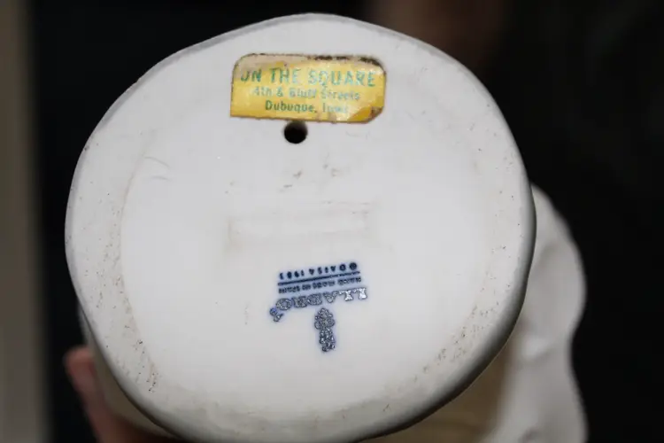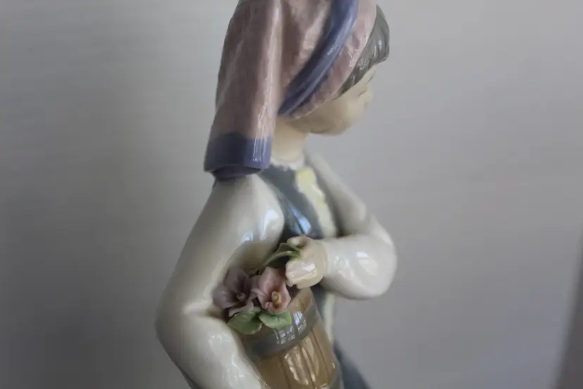 She is NOT in Pristine condition, hence the price. The one hand holding the bucket has a finger tip missing. You can see in the pictures. It is not noticeable when on display, only when closely inspecting. Also the bucket of flowers is missing the ones that go straight up out of the bucket. Unless you know the flowers should be there there is no visible damage.