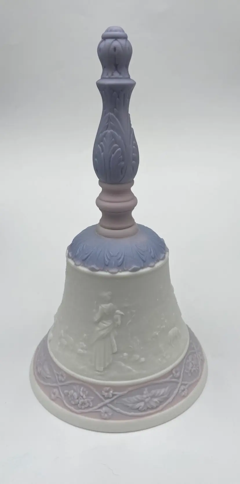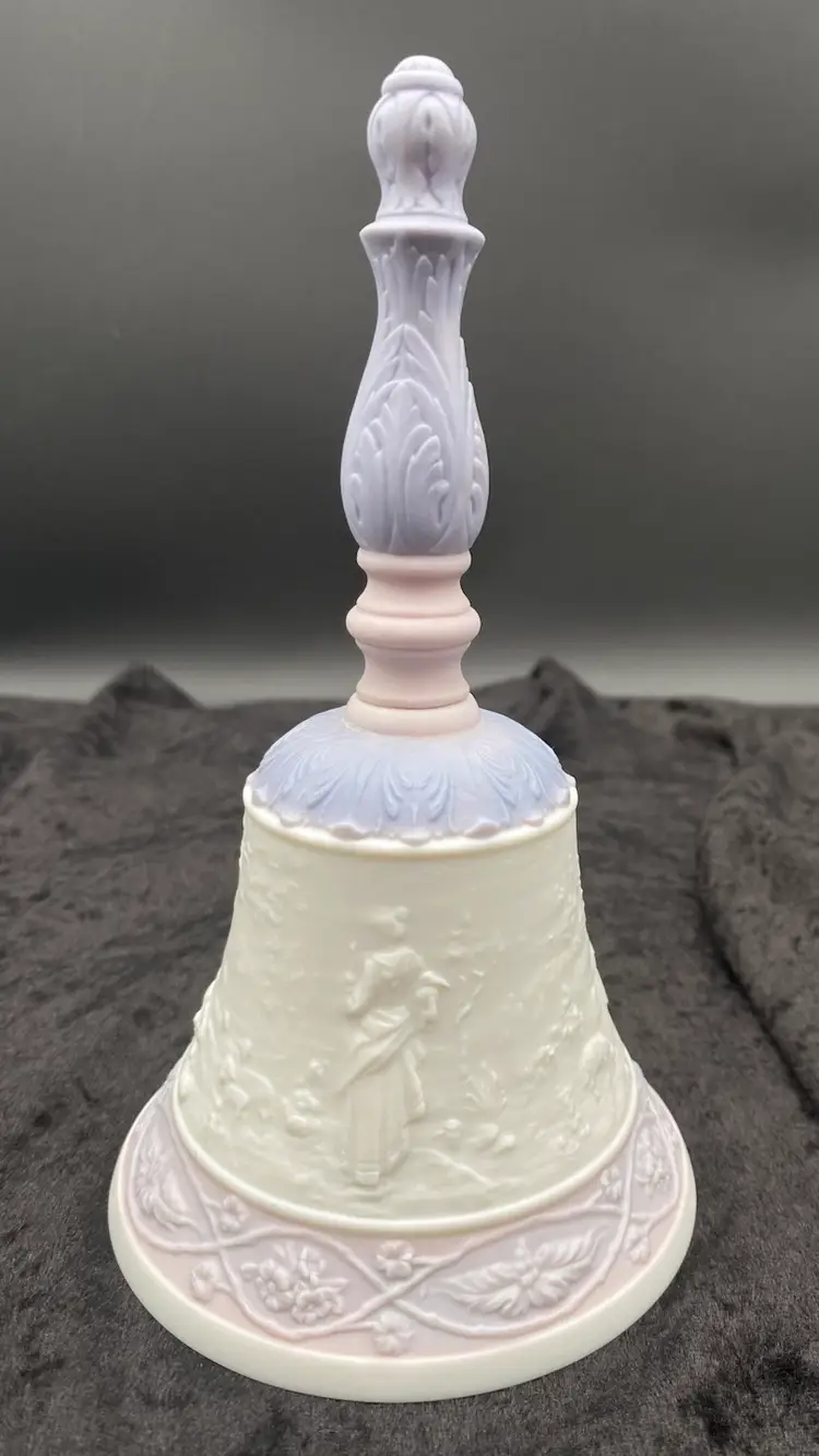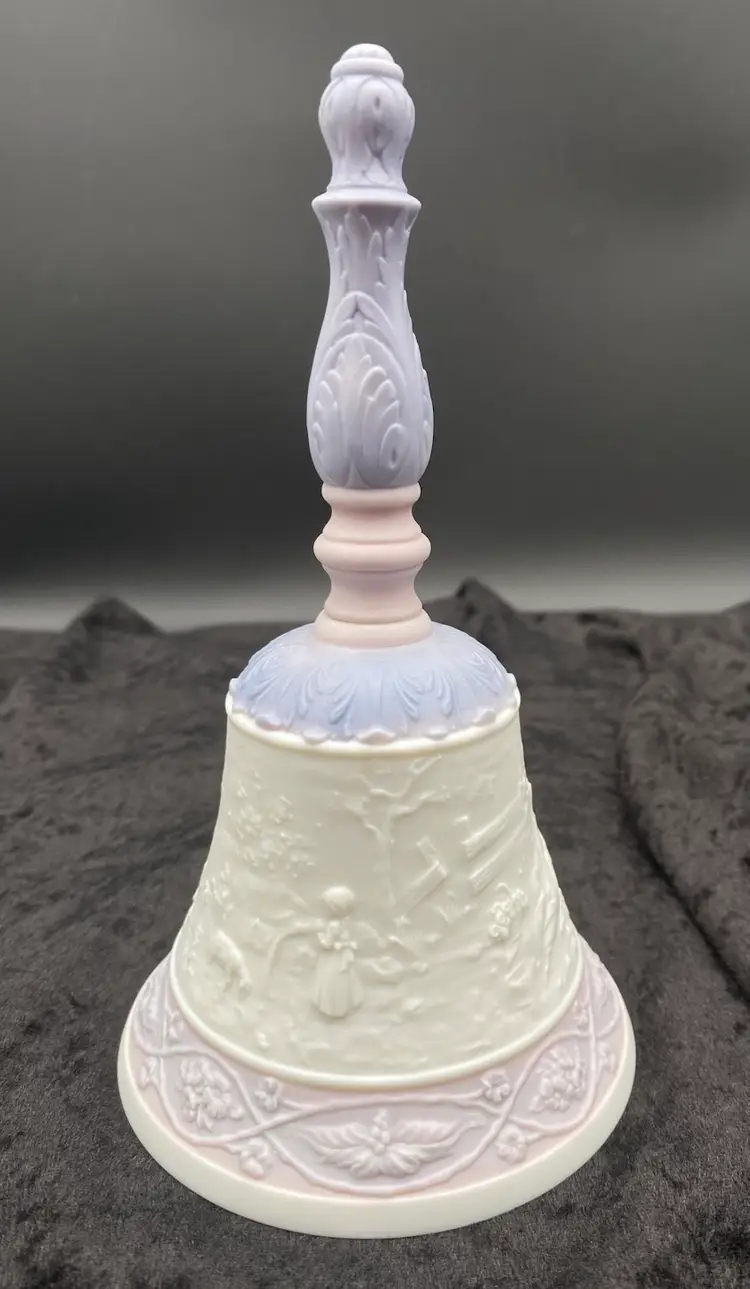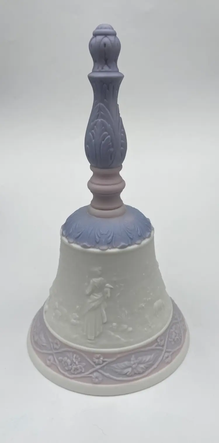 This Lladró Porcelain Bell "Eternal Love" from 1993 is a limited edition collectible, labeled #04154. Handmade in Spain, this traditional style bell features an embossed design of a courting couple in the countryside, the classic idyll in nature. The round bell, measuring 7 inches in height, showcases a soft white, pink and purple color scheme in a matte finish. The colors are lovely!