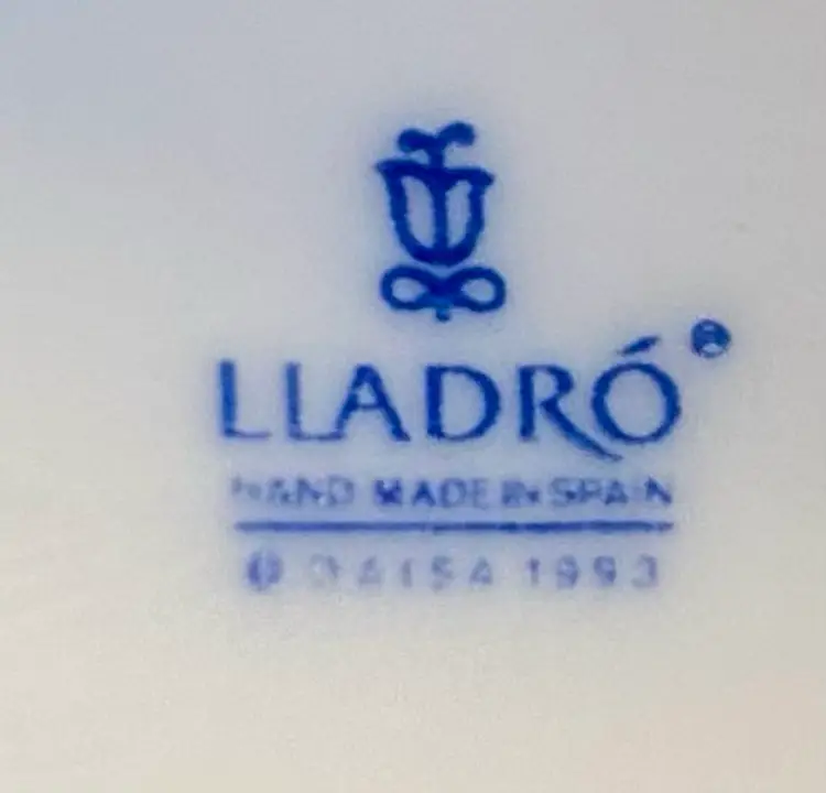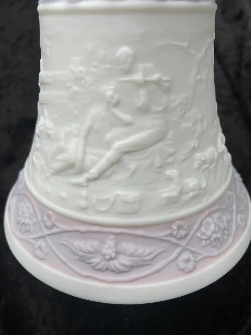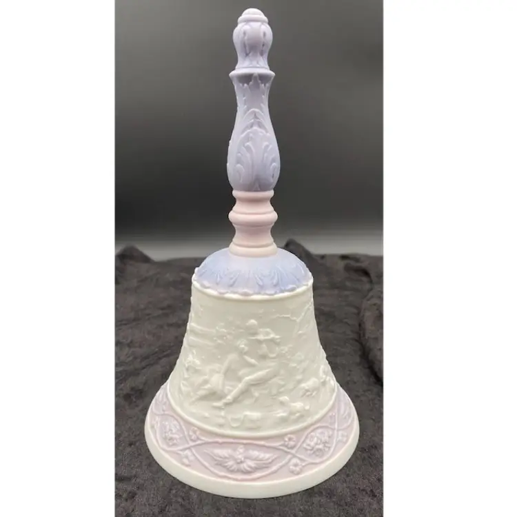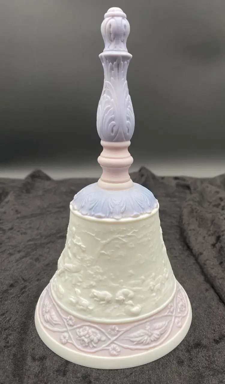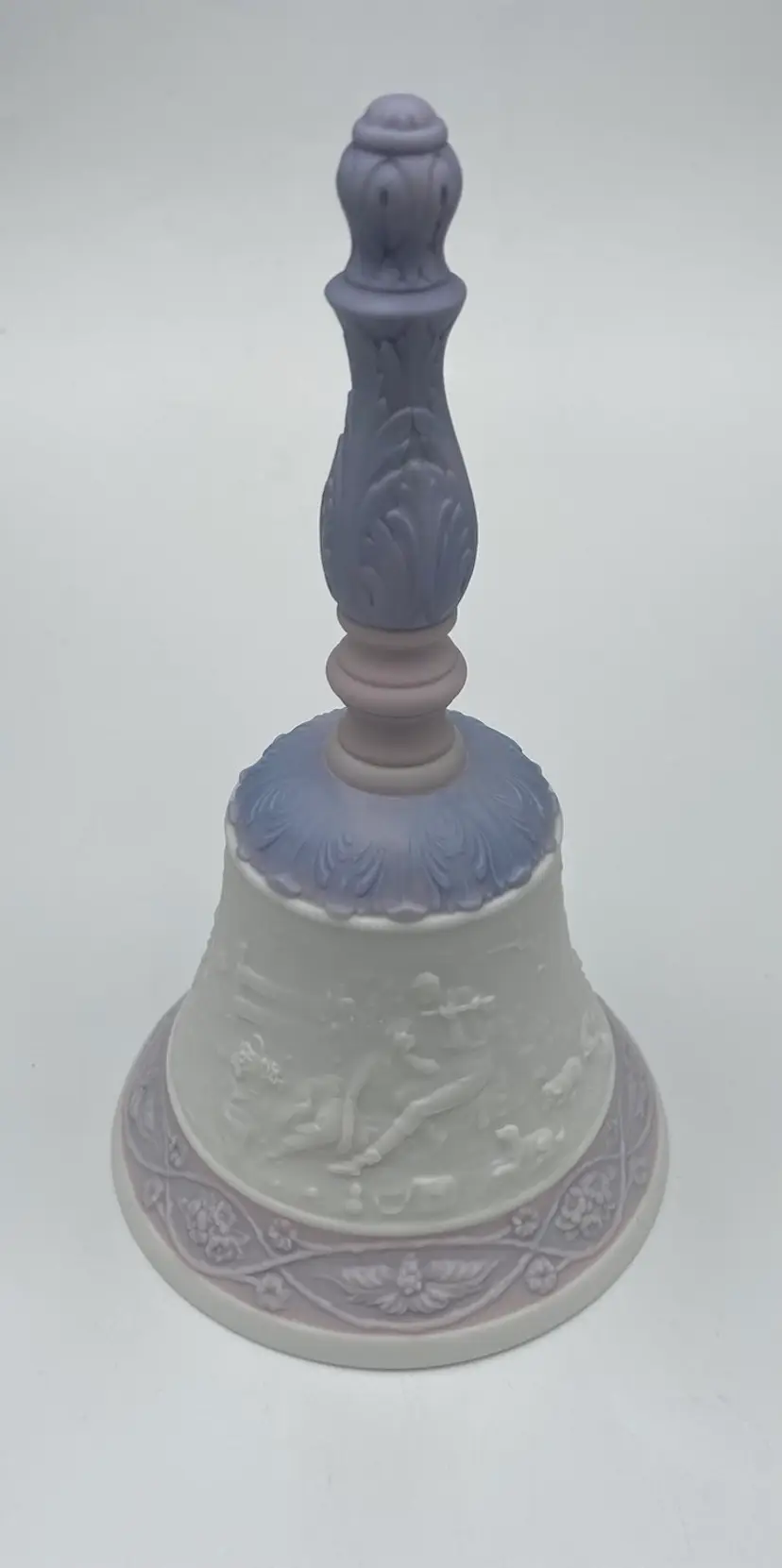 This Lladró Porcelain Bell "Eternal Love" from 1993 is a limited edition collectible, labeled #04154. Handmade in Spain, this traditional style bell features an embossed design of a courting couple in the countryside, the classic idyll in nature. The round bell, measuring 7 inches in height, showcases a soft white, pink and purple color scheme in a matte finish. The colors are lovely!