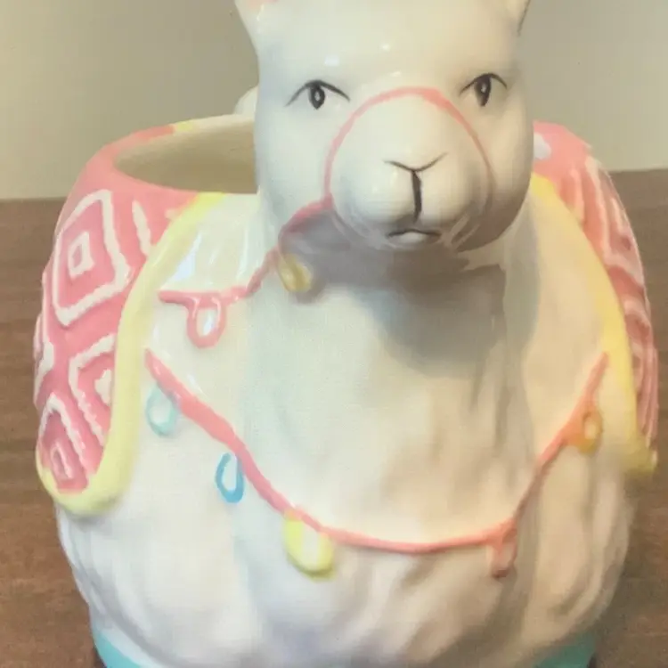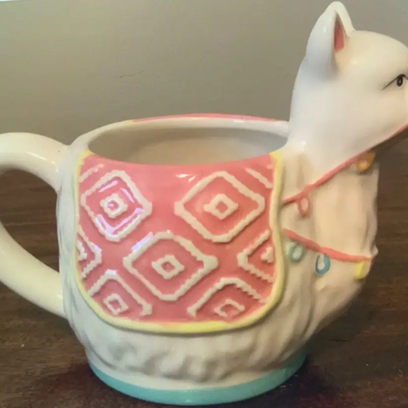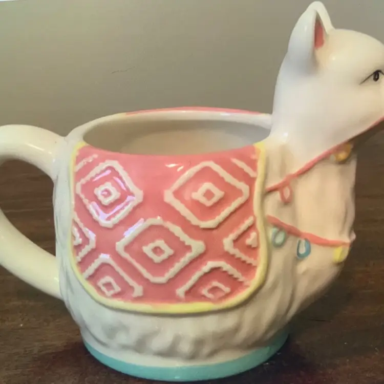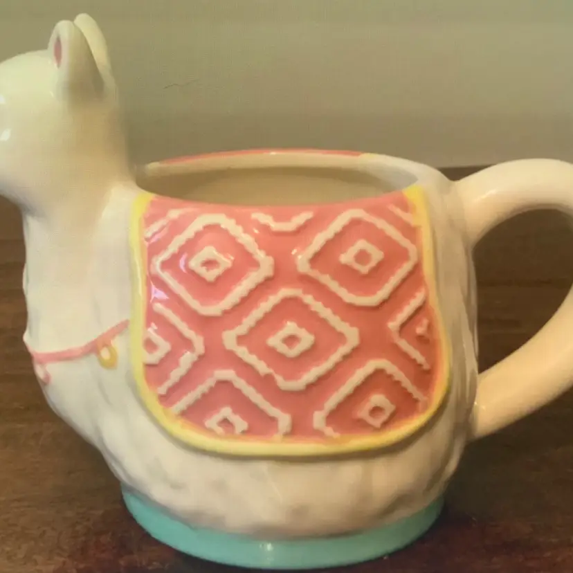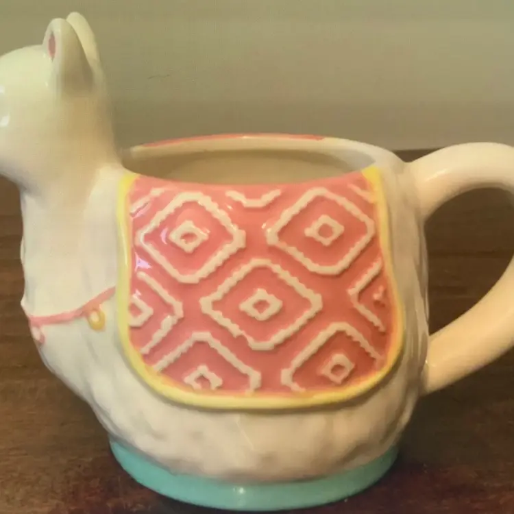 Llama tea cup coffee mug wearing saddle white pink yellow green 2016, made in China. No chips or cracks. This colorful Lluma coffee mug is perfect for any hot or cold beverage and is sure to brighten up your day. With its painted design and modern style, this ceramic and porcelain mug is both microwave and dishwasher safe, making it easy to use and clean. Measuring at 3.5” in height and 3.75” in width, this medium-sized mug has a capacity of 6oz. The mug is ideal for all occasions and is an original piece manufactured in China by Dei. Weighs 1lb.