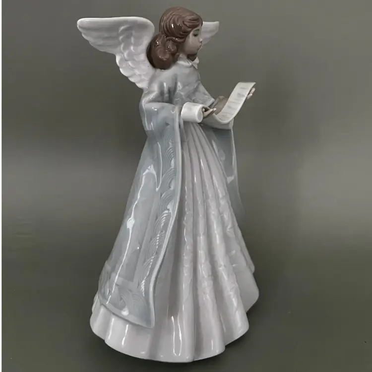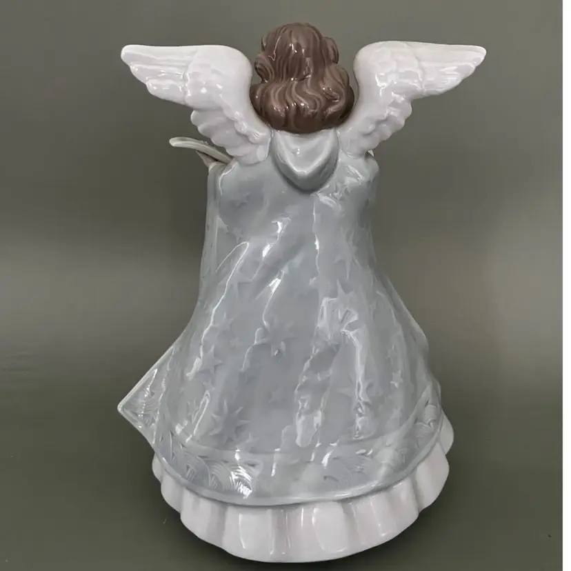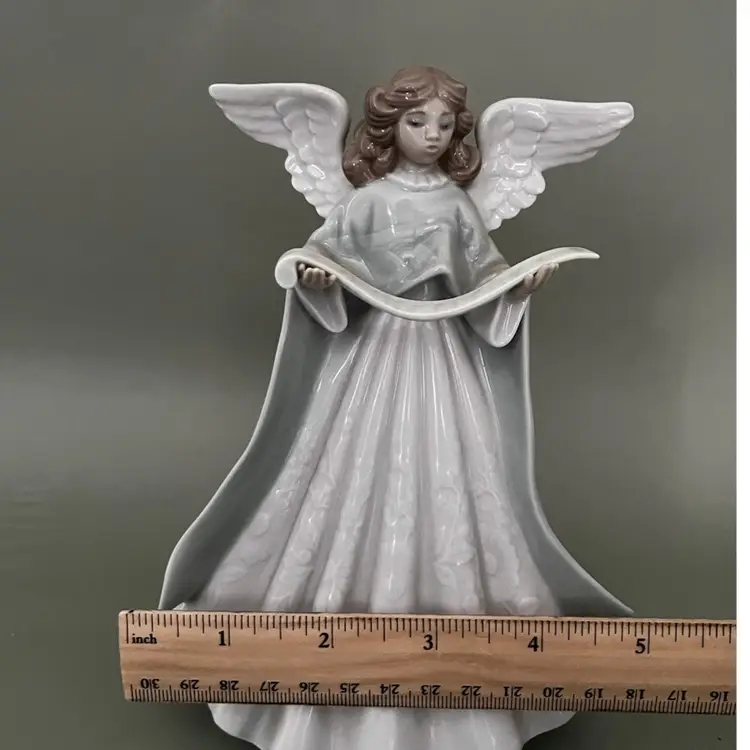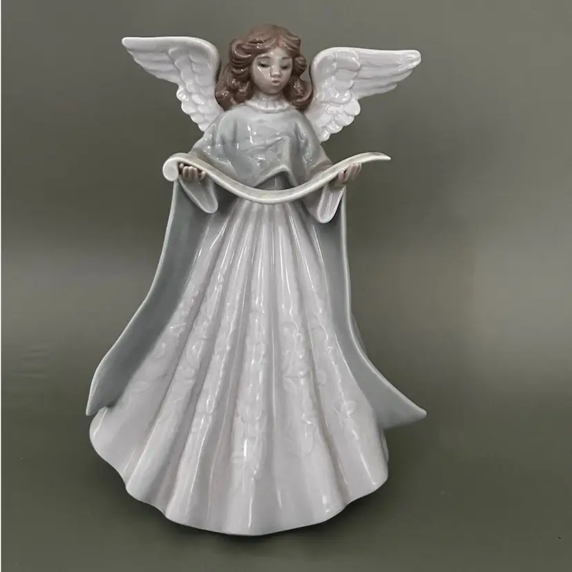 This Lladro figurine from 1990 features a small, multicolor porcelain Angel Navidad Music Tree Topper. The scroll pattern and Spanish style make it a charming addition to any room, especially at Christmas time. This limited edition collectible is a retired piece from the Lladró brand, adding uniqueness and nostalgia to your decor. Made in Spain, this glossy finished figurine captures the theme of Angel and Music perfectly, making it a special item for collectors of decorative sculptures and figurines.