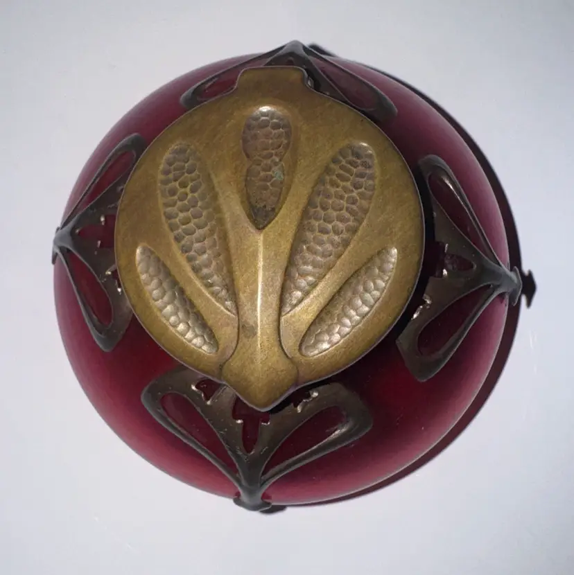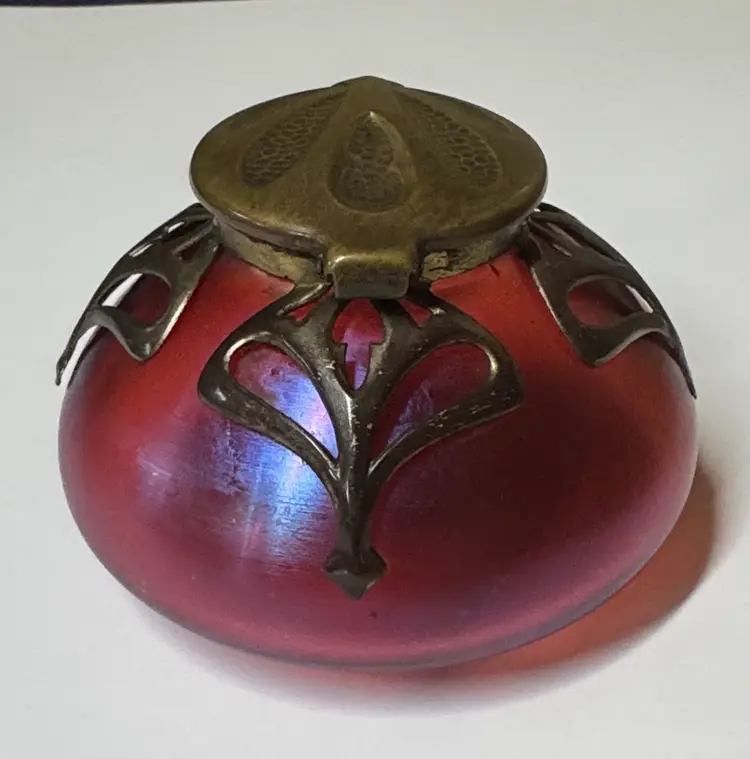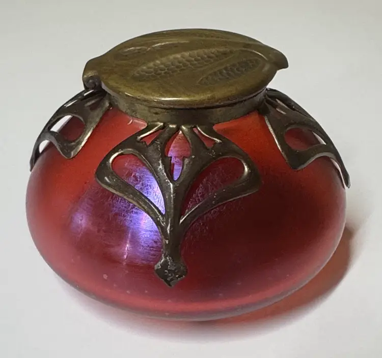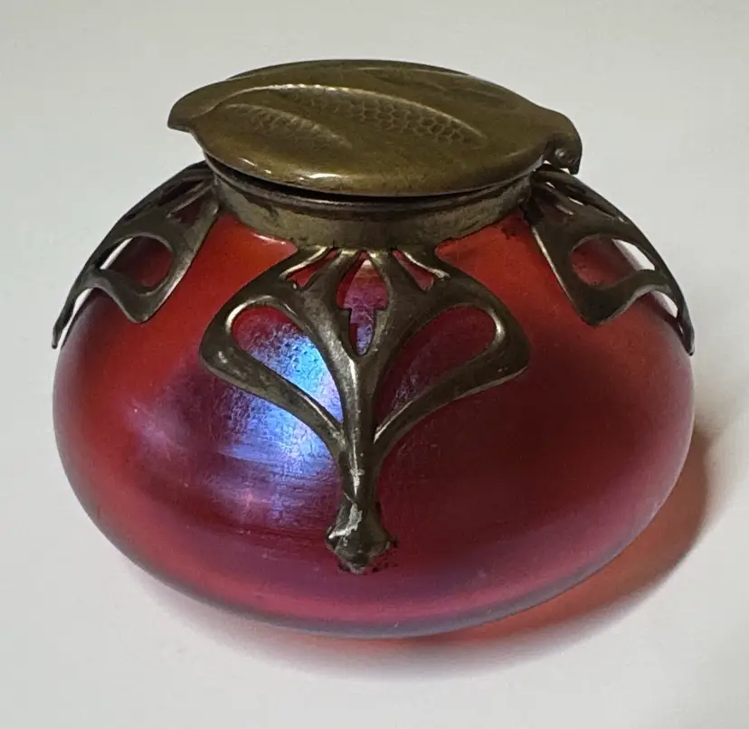 Elegant red glass jar with intricate bronze lid design. Perfect for decor or storage. Loetz/Kralik Art Nouveau Iridescent Glass Inkwell Made In Germany Hinged brass top with ornate brass collar About 4” diameter 1.5” diameter opening 3” tall Excellent condition with no breaks or chips Beautiful (135411262510)