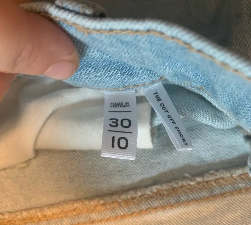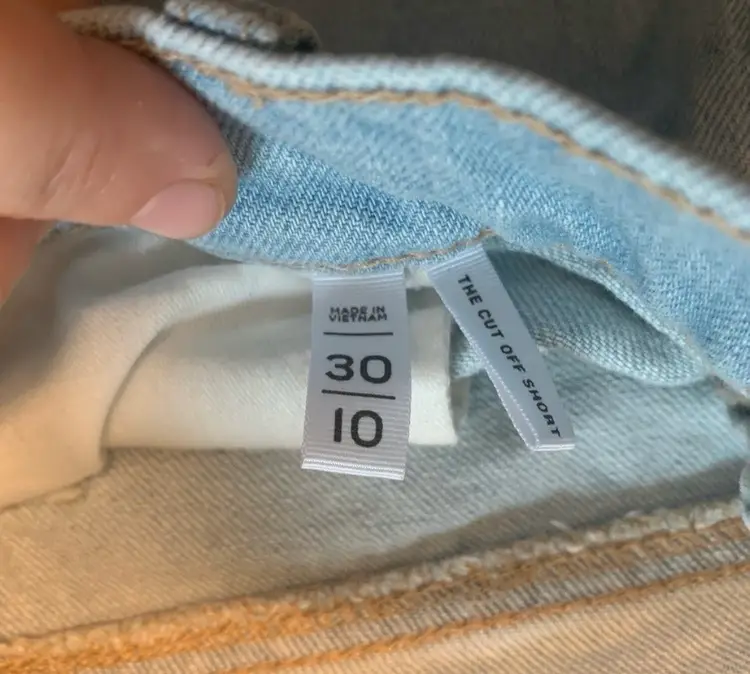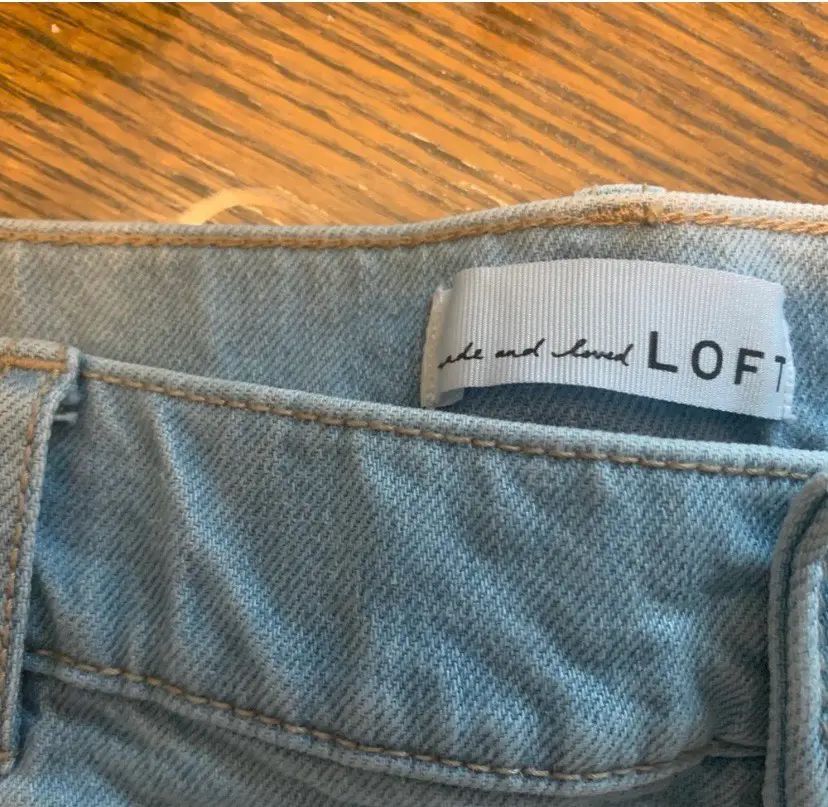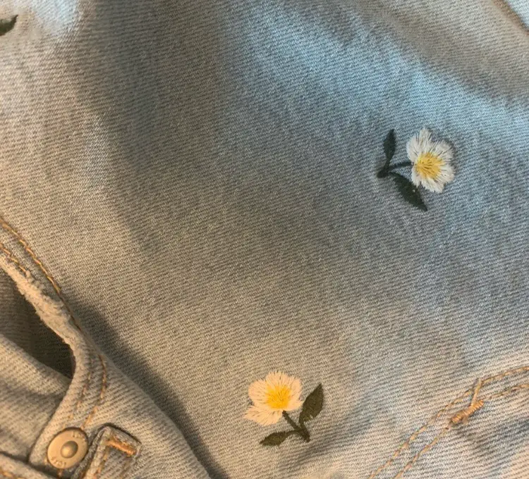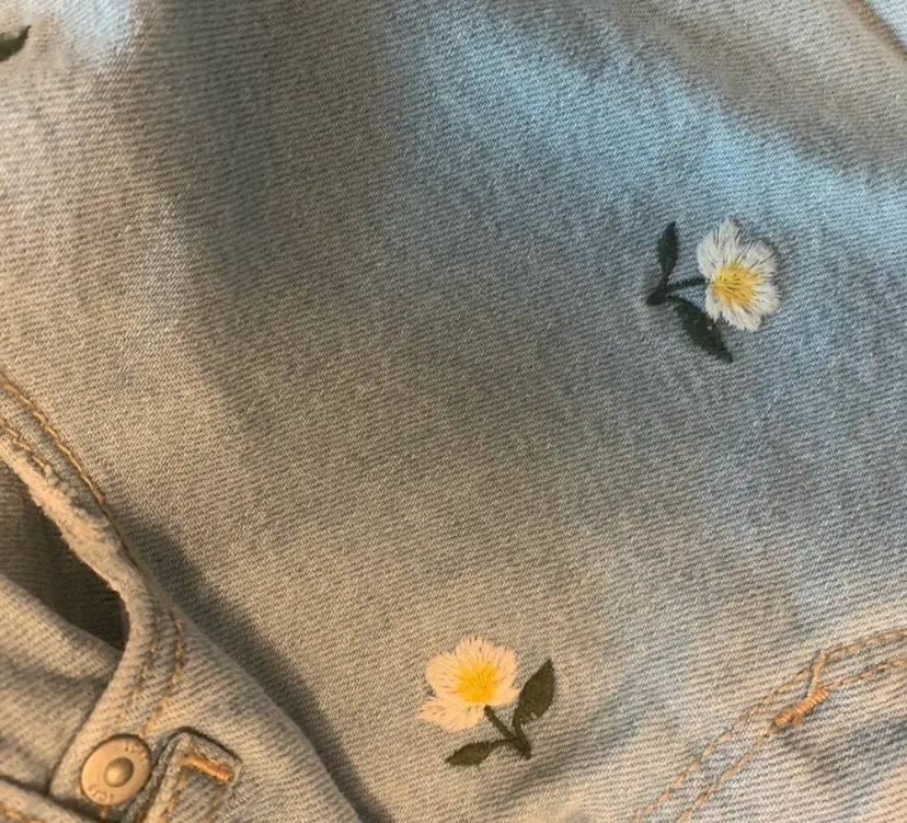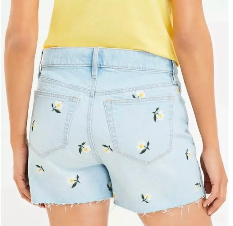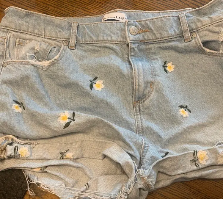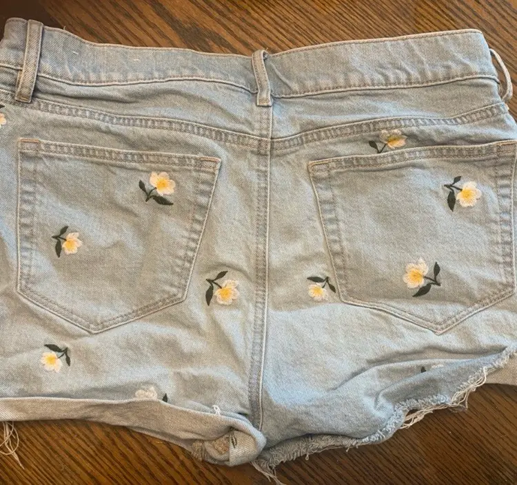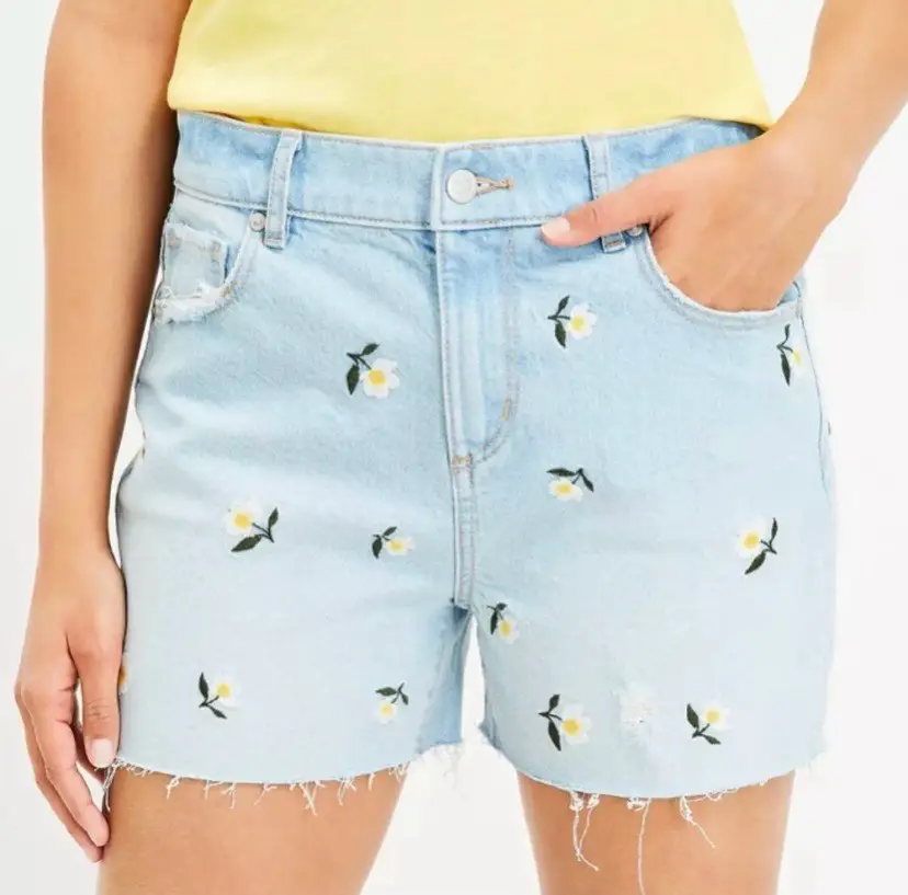17” waist. Light wash denim shorts with floral embroidery and distressed hem. Retails originally for $99.85 CDN and on sale for $64.06. 99.85 and on sale for $64.06 CDN.