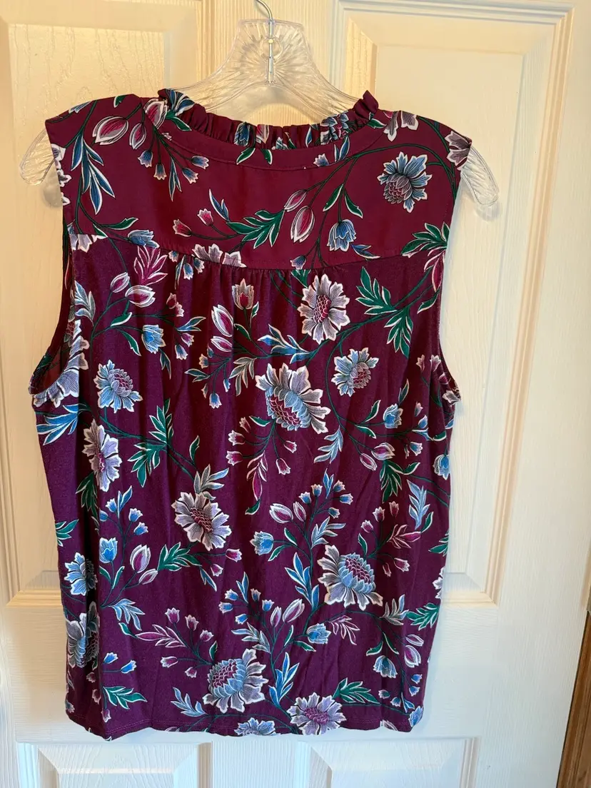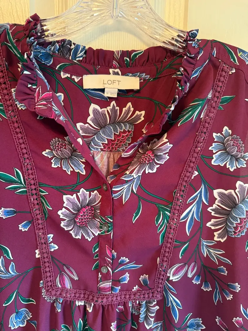 This stylish blouse from LOFT features a sophisticated tie front and a chic mandarin collar. Purple flowered loft. size medium Measurements: 19 inches pit to pit from shoulder to the bottom of the shirt is 23 3/4 inches.