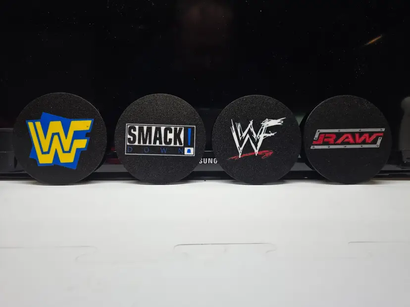 This is a 4 pack of coasters with a WWF Theme. Coasters are 4 inches in diameter, 1/8" thick, and have a cork backing. These are 3d Printed using PLA filament.