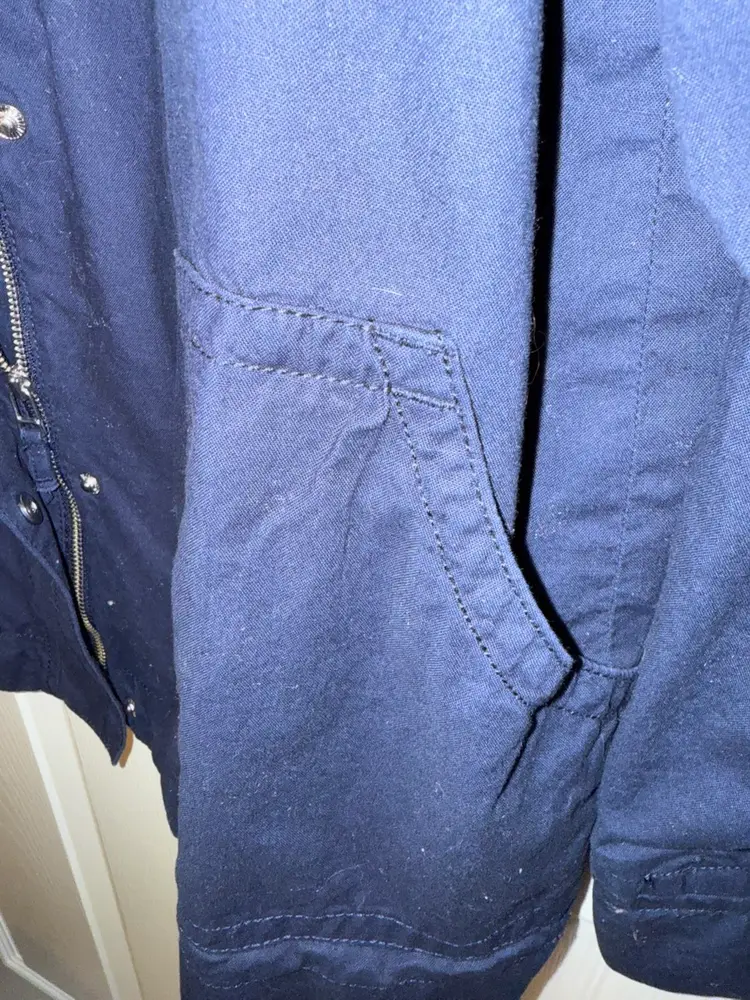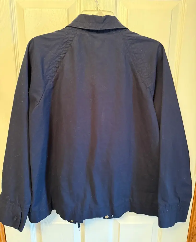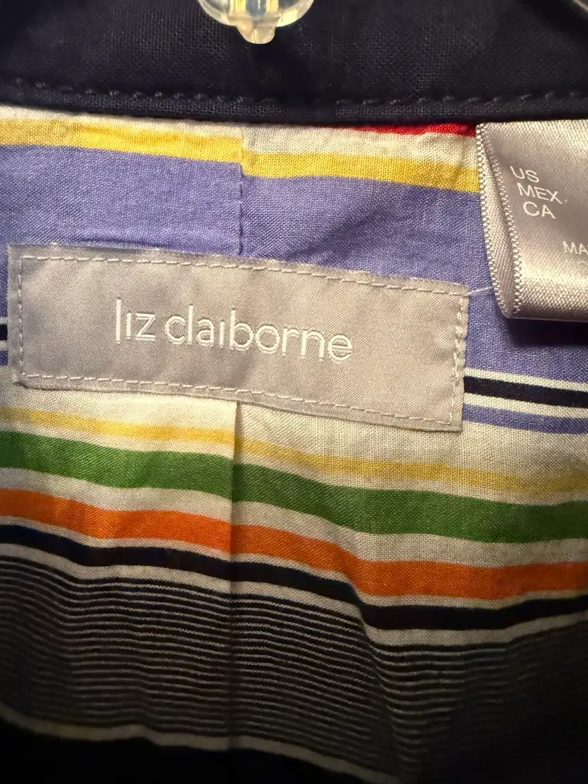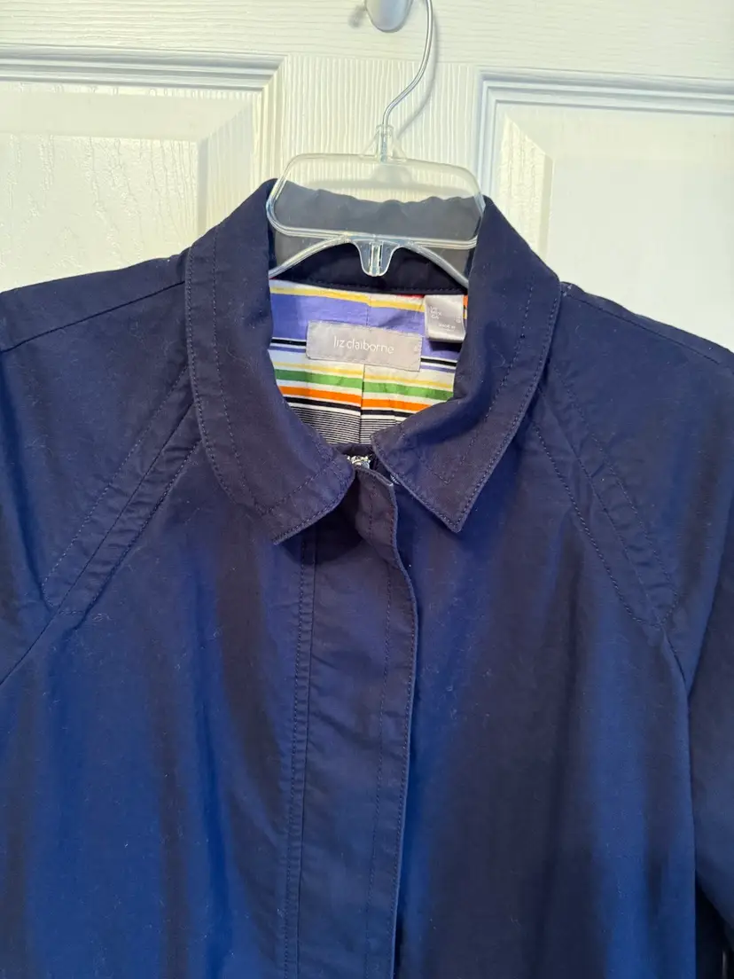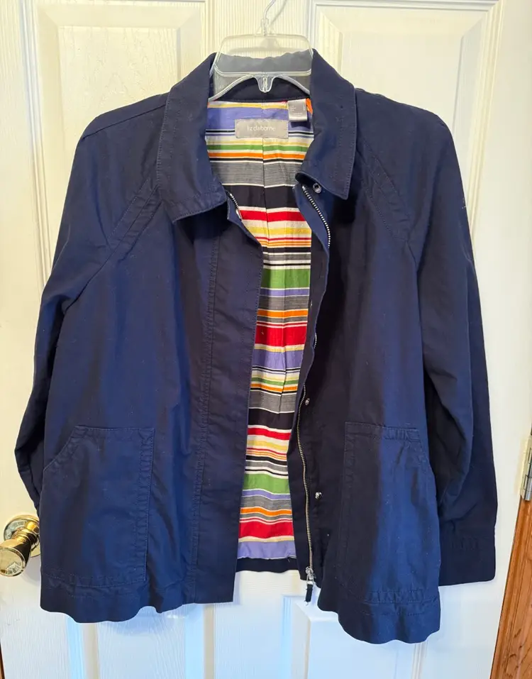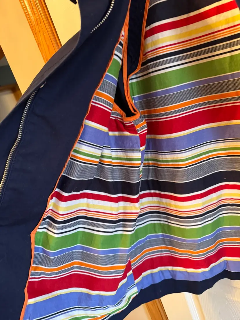 Stylish navy jacket featuring a colorful striped lining. Perfect for casual outings. Size large. And excellent condition no stain no tear no holes a great jacket for casual or dress wear. The inside is beautiful striped colors set the coat off.