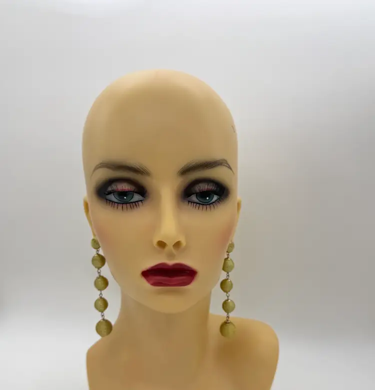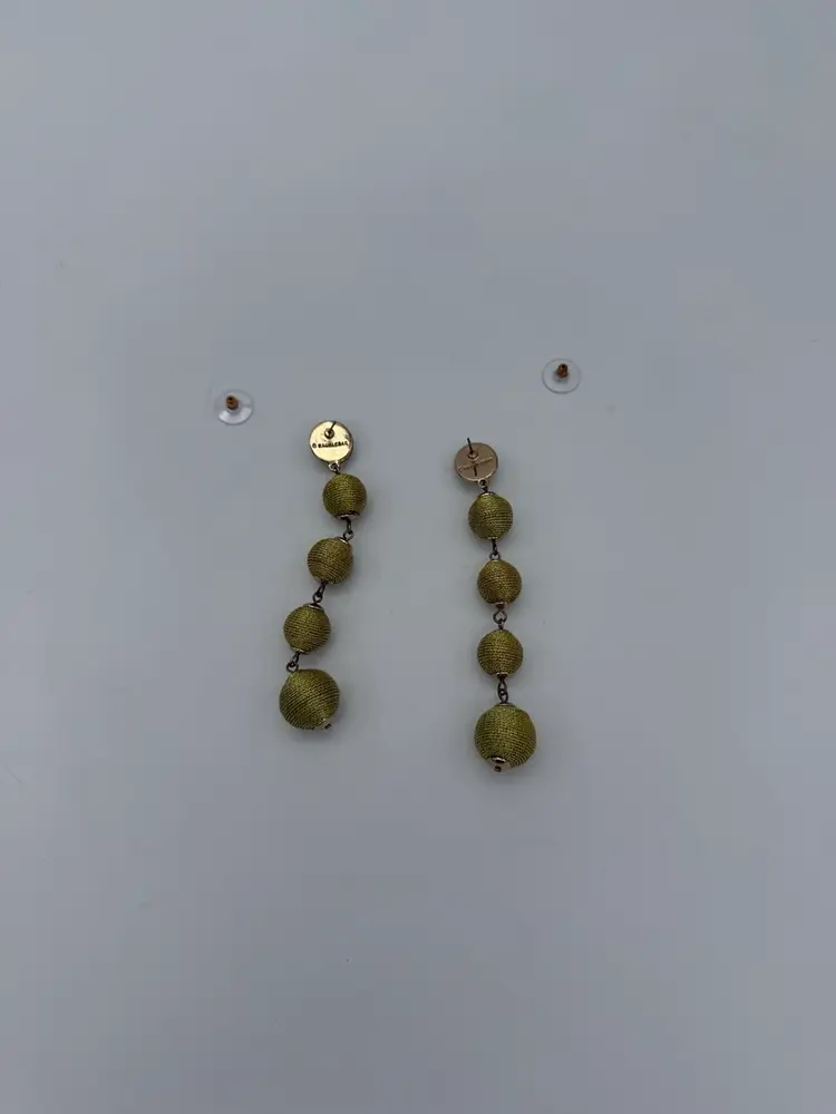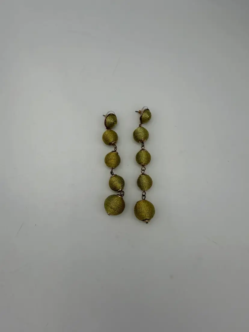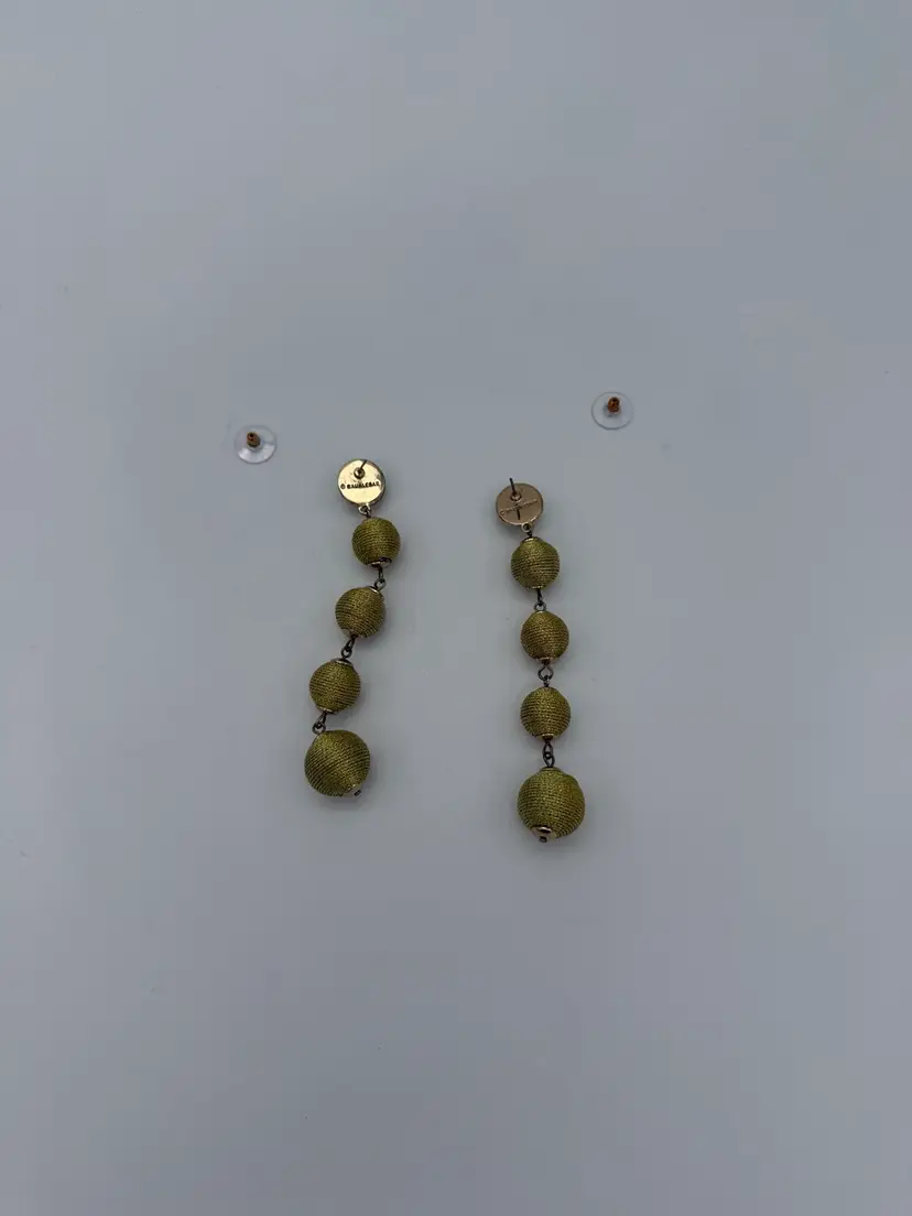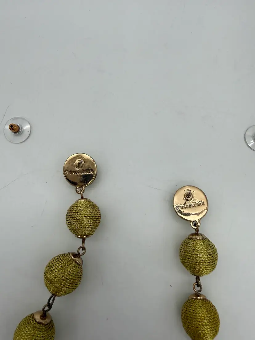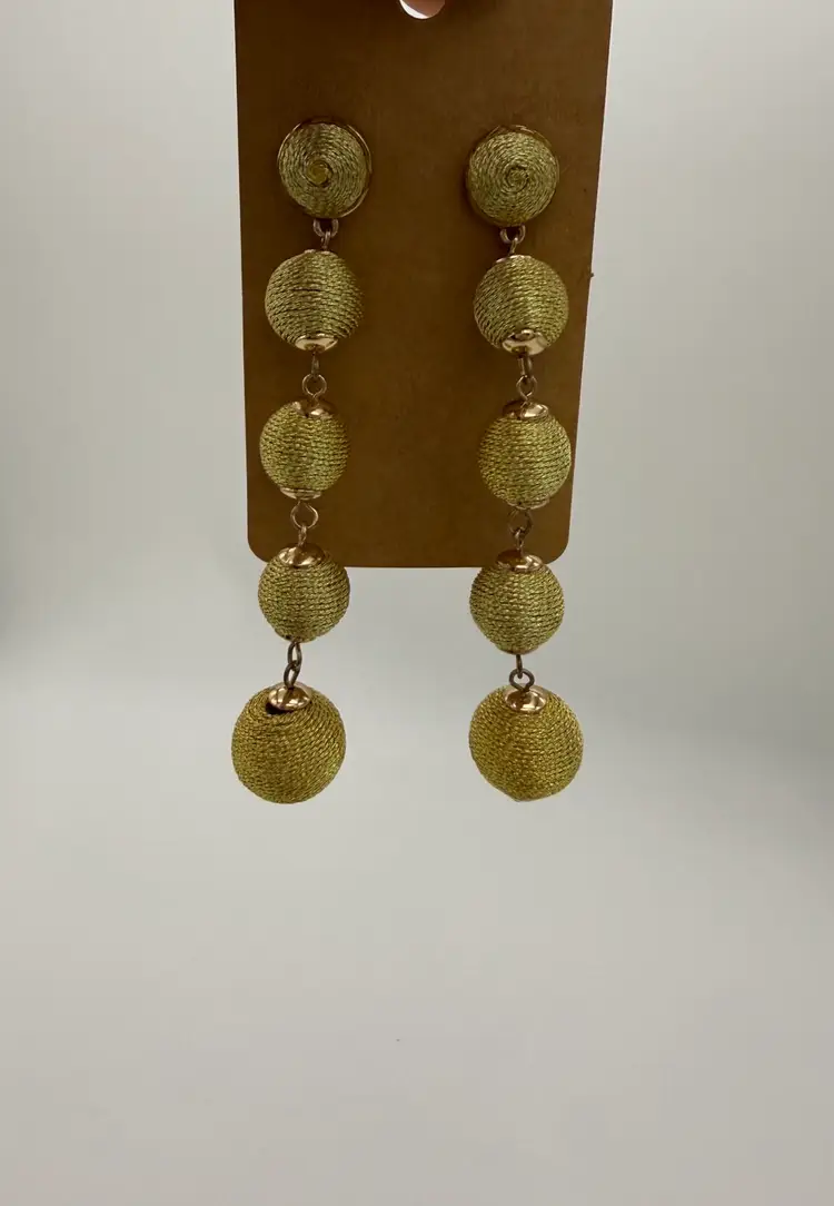 These Long Graduated BAUBLEBAR Gold Metallic Threaded Ball Statement Earrings are a vintage-inspired piece of jewelry that features a round graduated shape approximately 11 - 14mm, and a butterfly closure. The earrings are signed by the brand BaubleBar and are made of thread, metal, and enamel materials. They have a gold color and a length of 3.5 inches, making them perfect for any occasion due to their beautiful and artistic design. The tension setting style and dangle/drop style add a touch of elegance to the earrings, making them a stylish addition to any fashion ensemble.