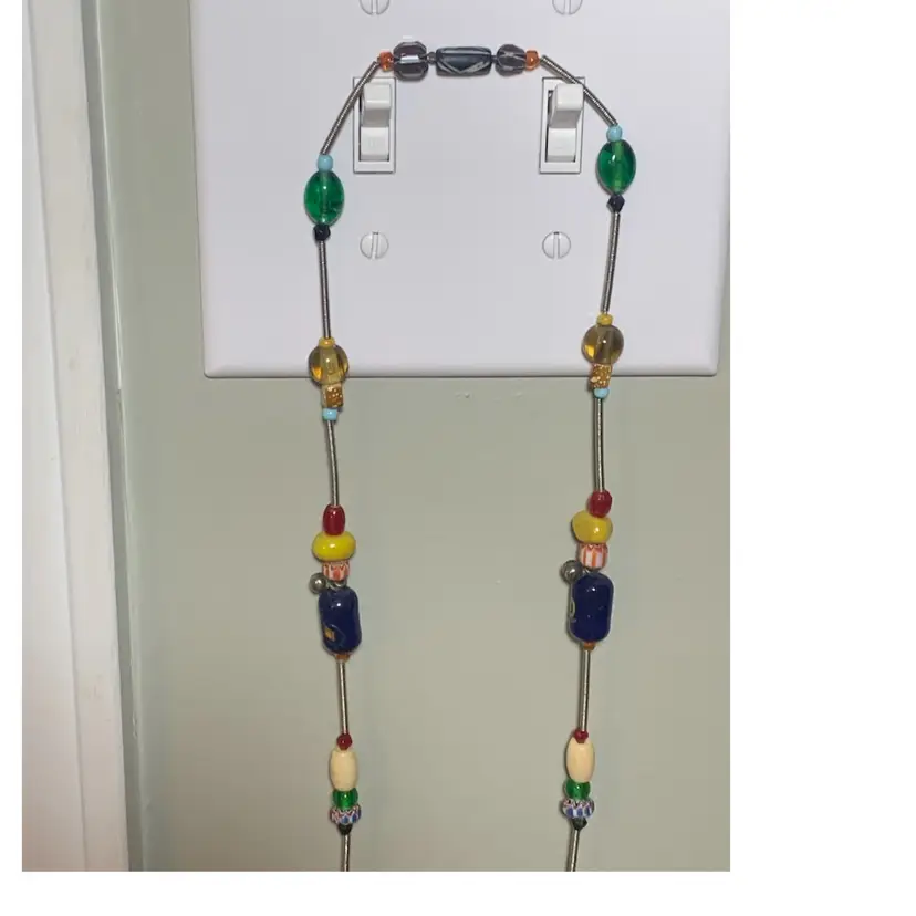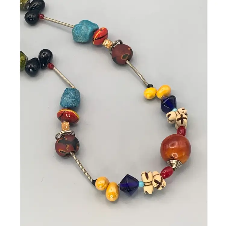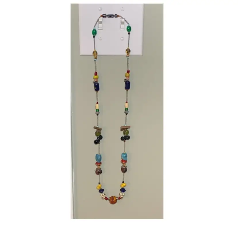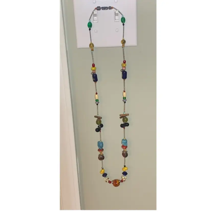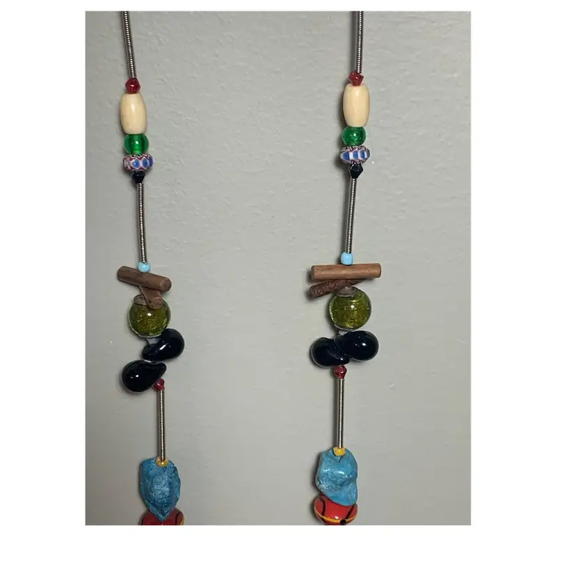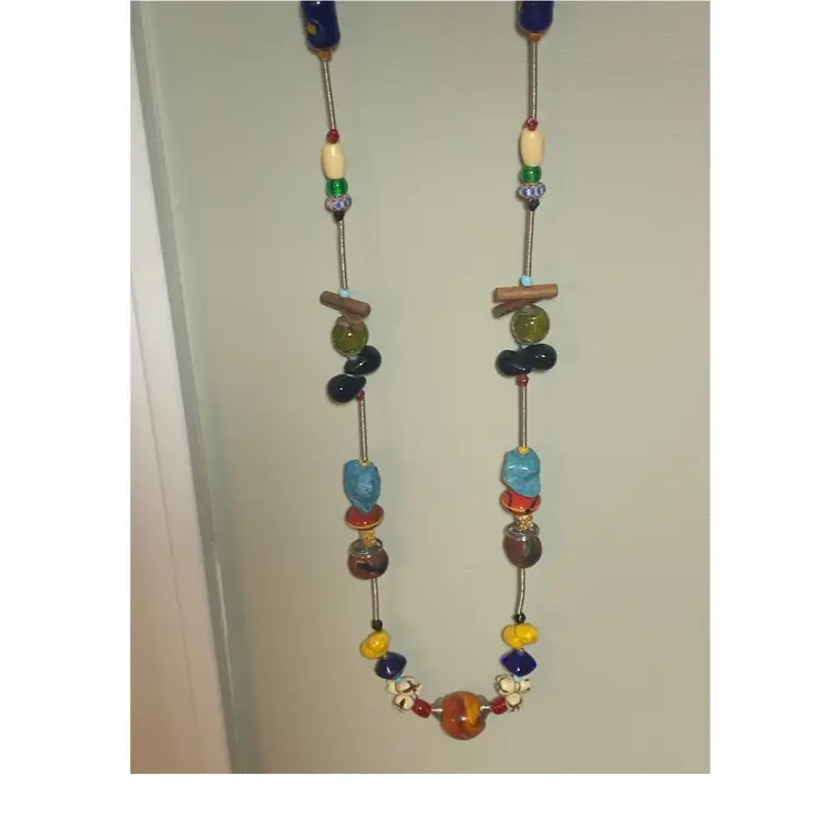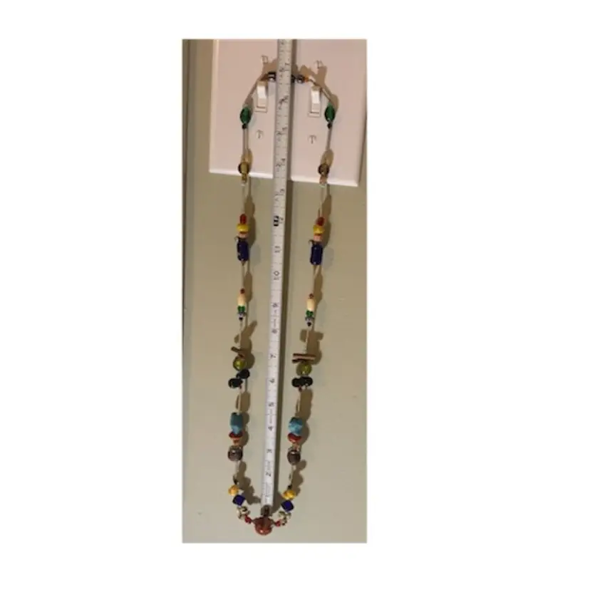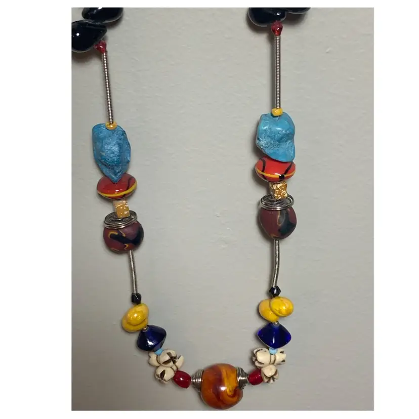 Several unique and interesting beads on this long necklace. On a coiled wire strand. Drop is approximately 17 inches so I would guess this necklace is 34/35 inches long. Please see all photos for details and measurement. I am happy to answer any questions. As always, thank you for checking out my listings.