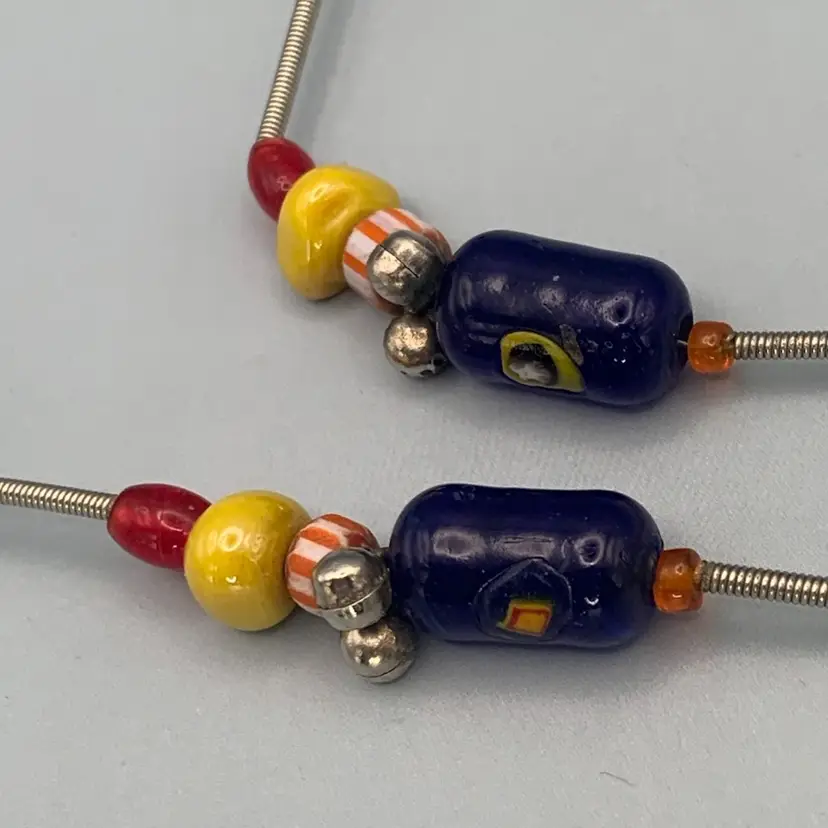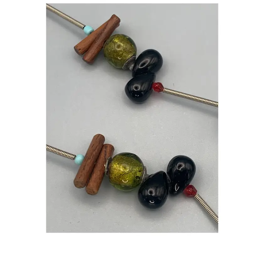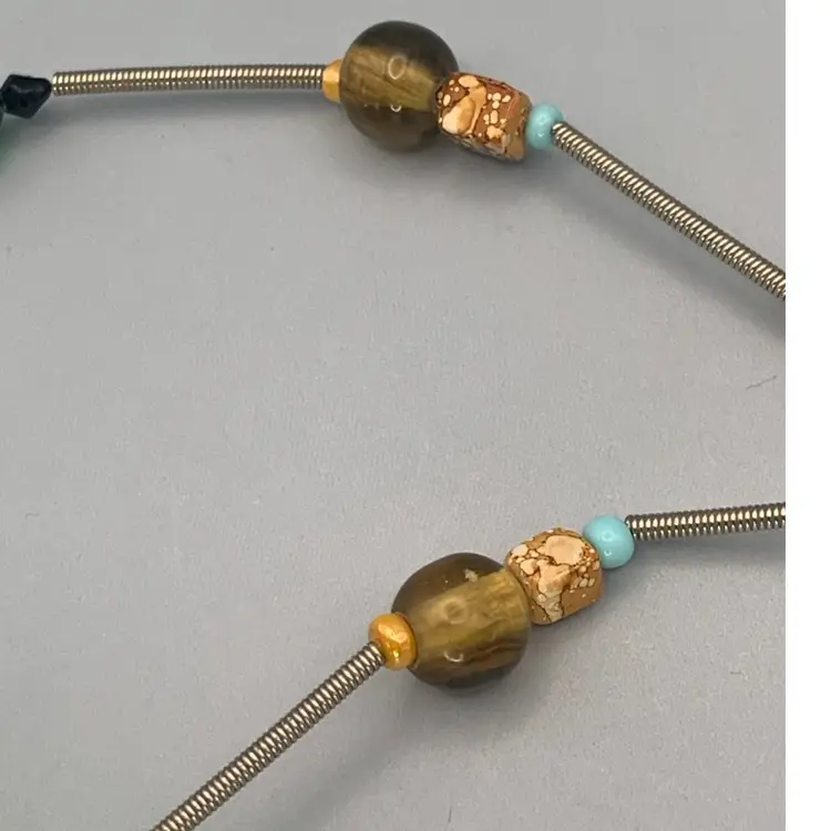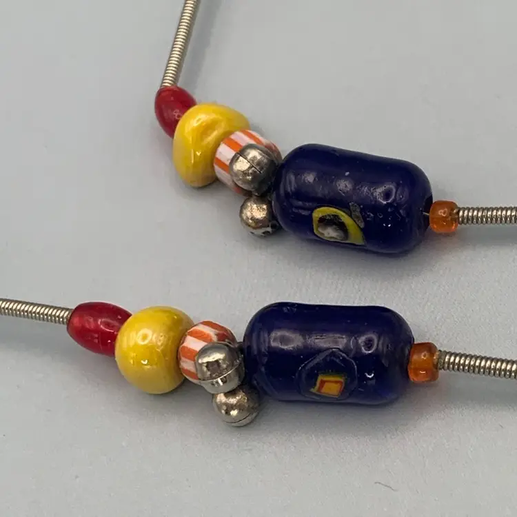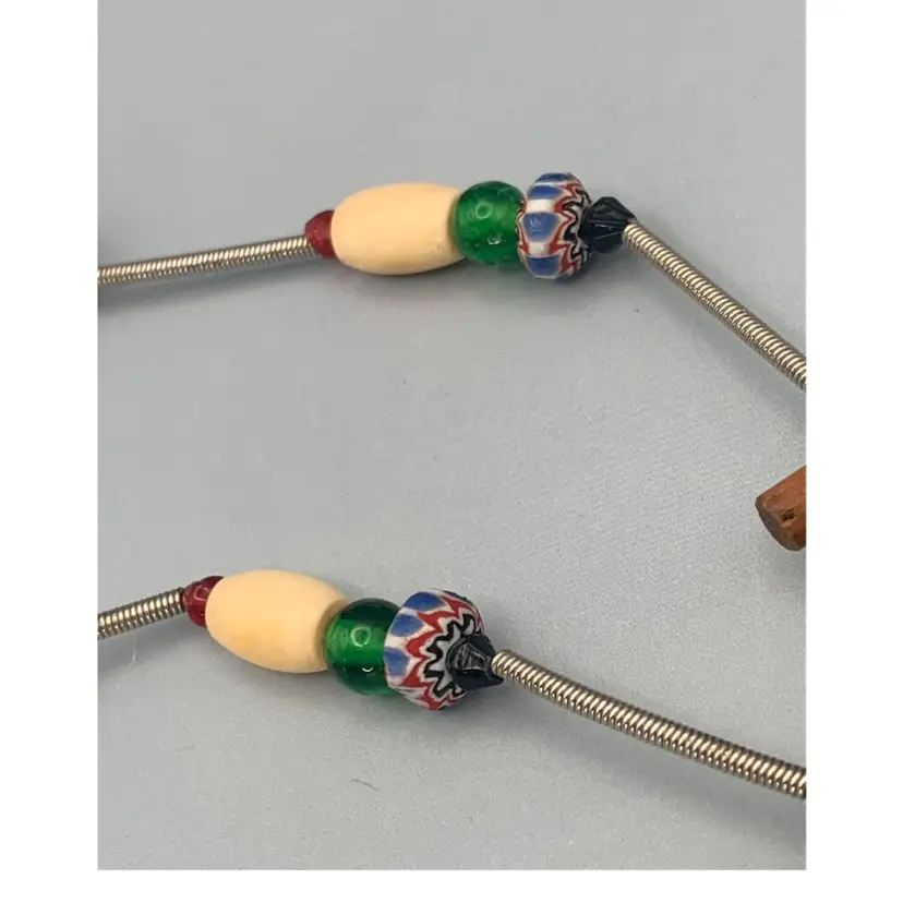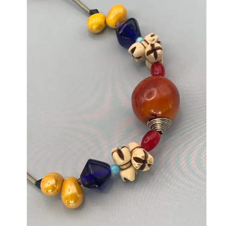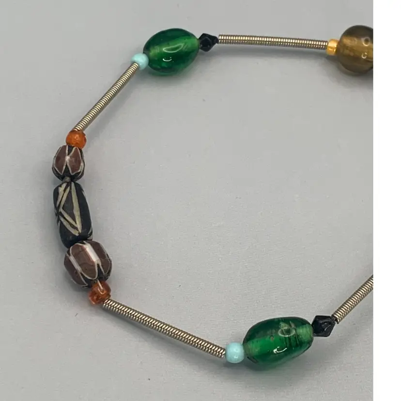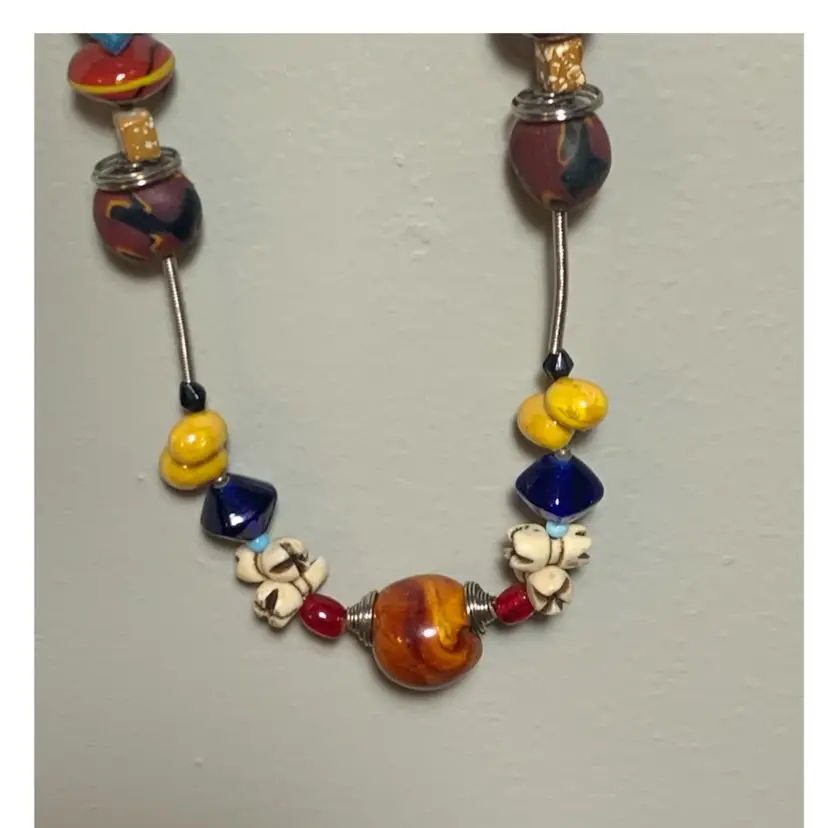 Several unique and interesting beads on this long necklace. On a coiled wire strand. Drop is approximately 17 inches so I would guess this necklace is 34/35 inches long. Please see all photos for details and measurement. I am happy to answer any questions. As always, thank you for checking out my listings.