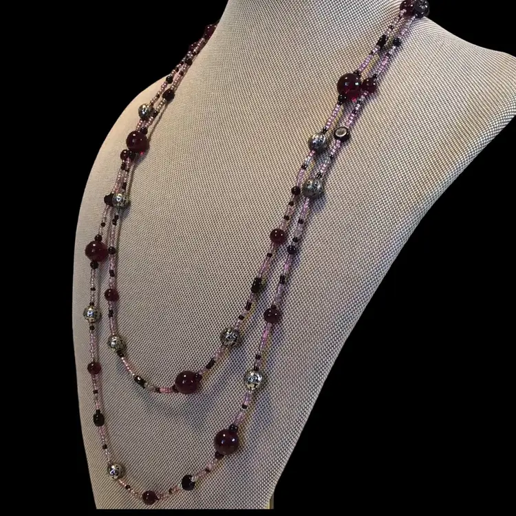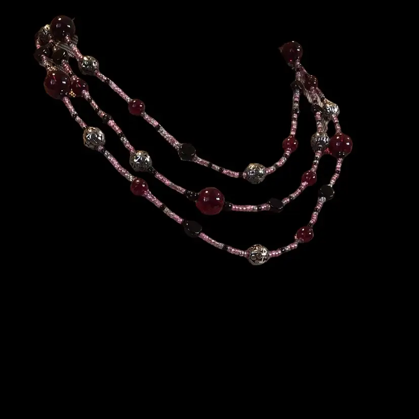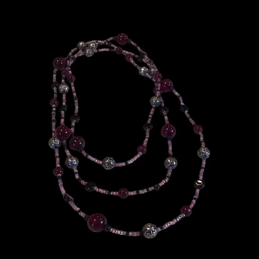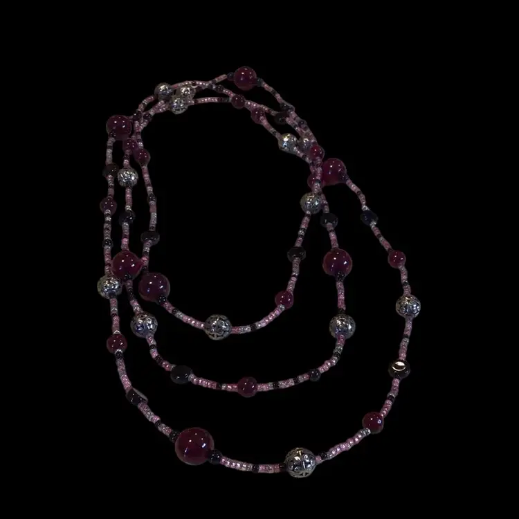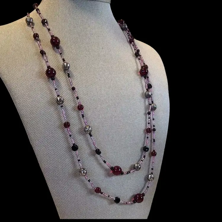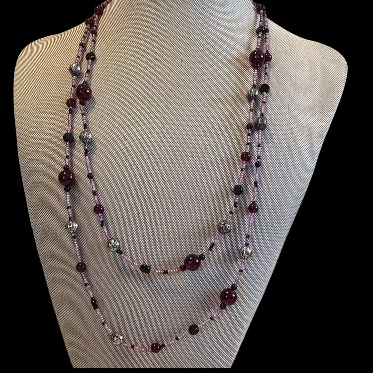Shades of pink & wine & black with silver tone glass beads, very long 48". #152
