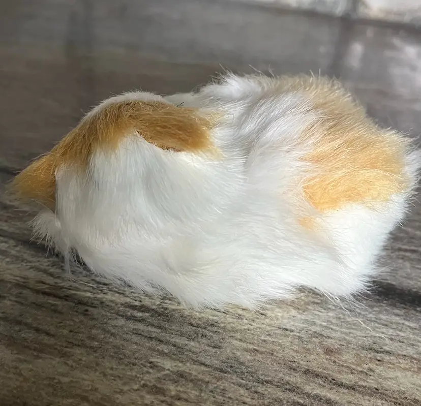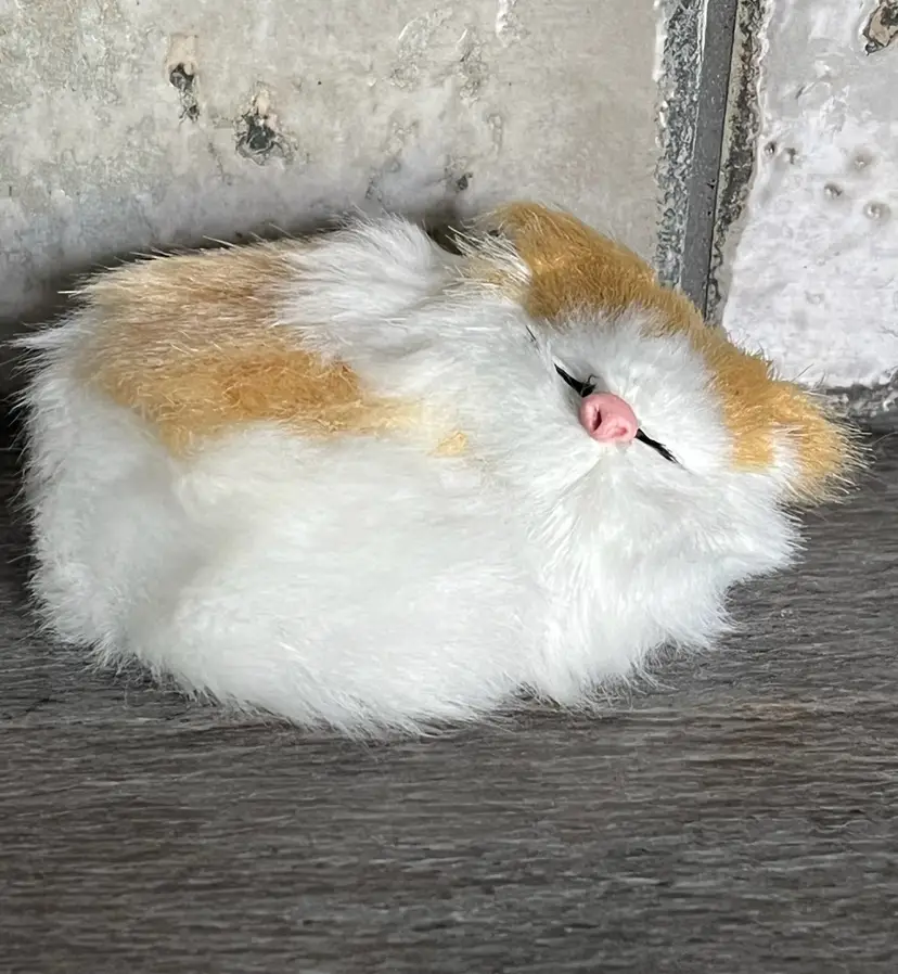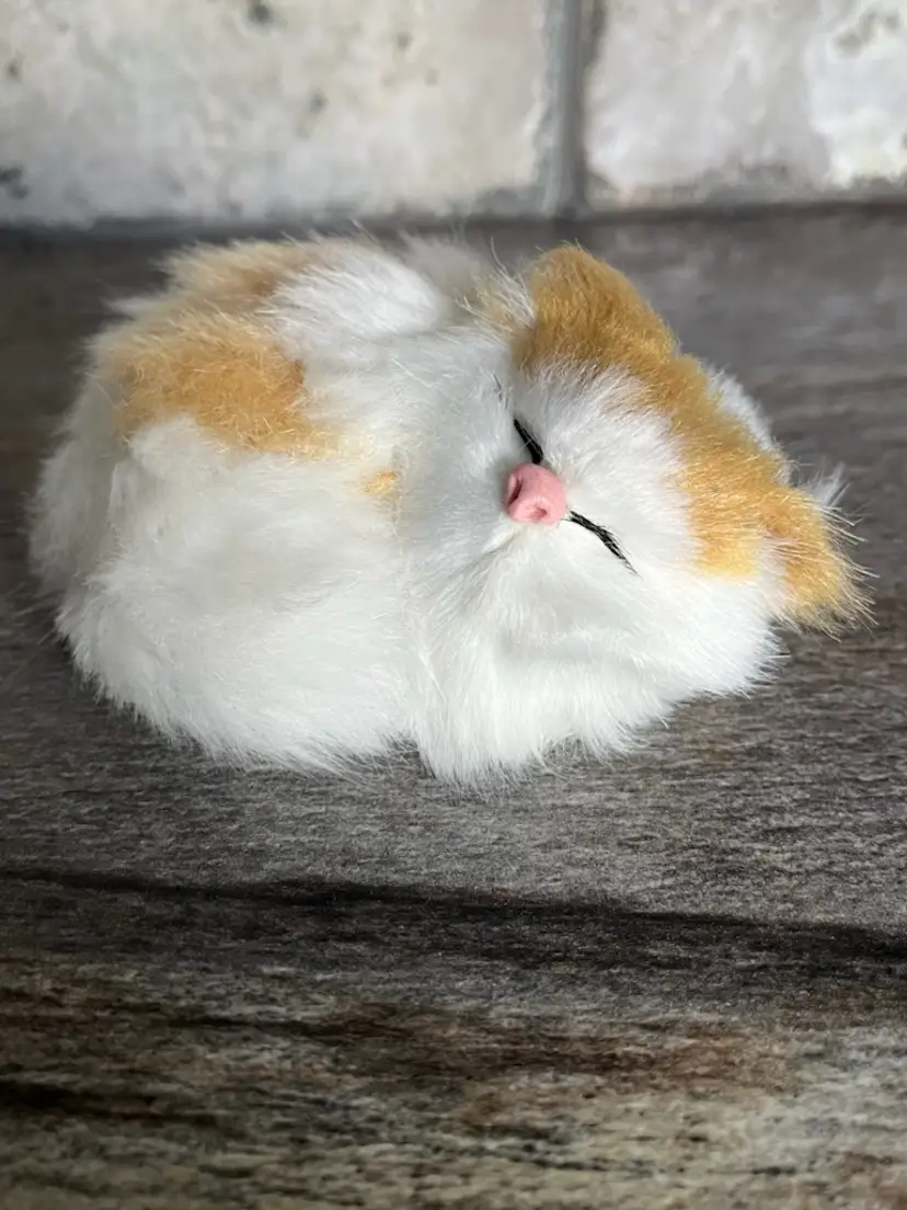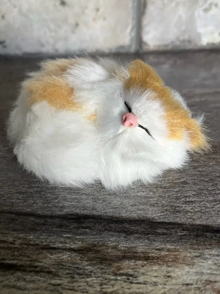 A darling faux fur sleeping kitty. Orange and white. Faux fur. Approximately 1 3/4 inches tall, 2 1/2 inches wide and 3 1/2 inches long.