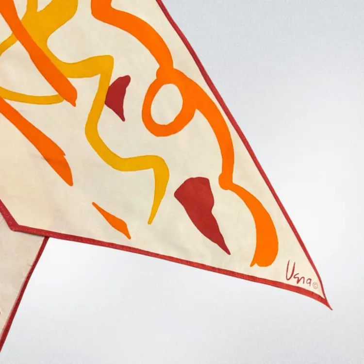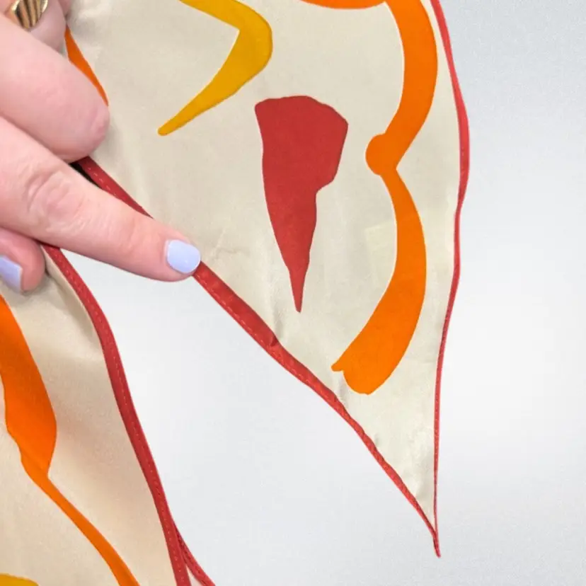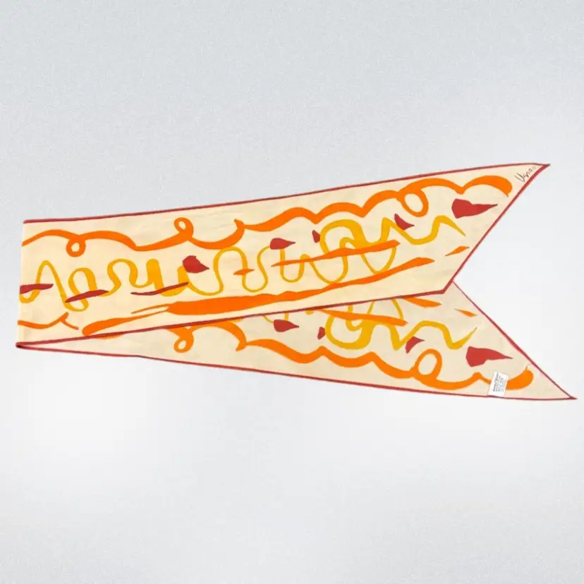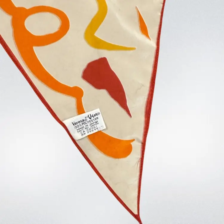 Approximately 64 inches long and 7 inches wide. This Vera scarf features an abstract array of orange, red and yellow shapes. It has the original tag which indicates it was made in Japan and is Polyester. There are some very faint stains on one end of the scarf. A great addition to your collection!