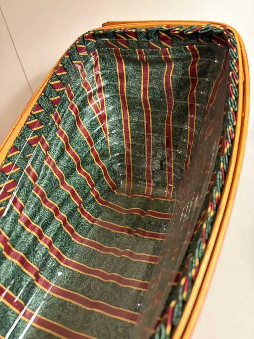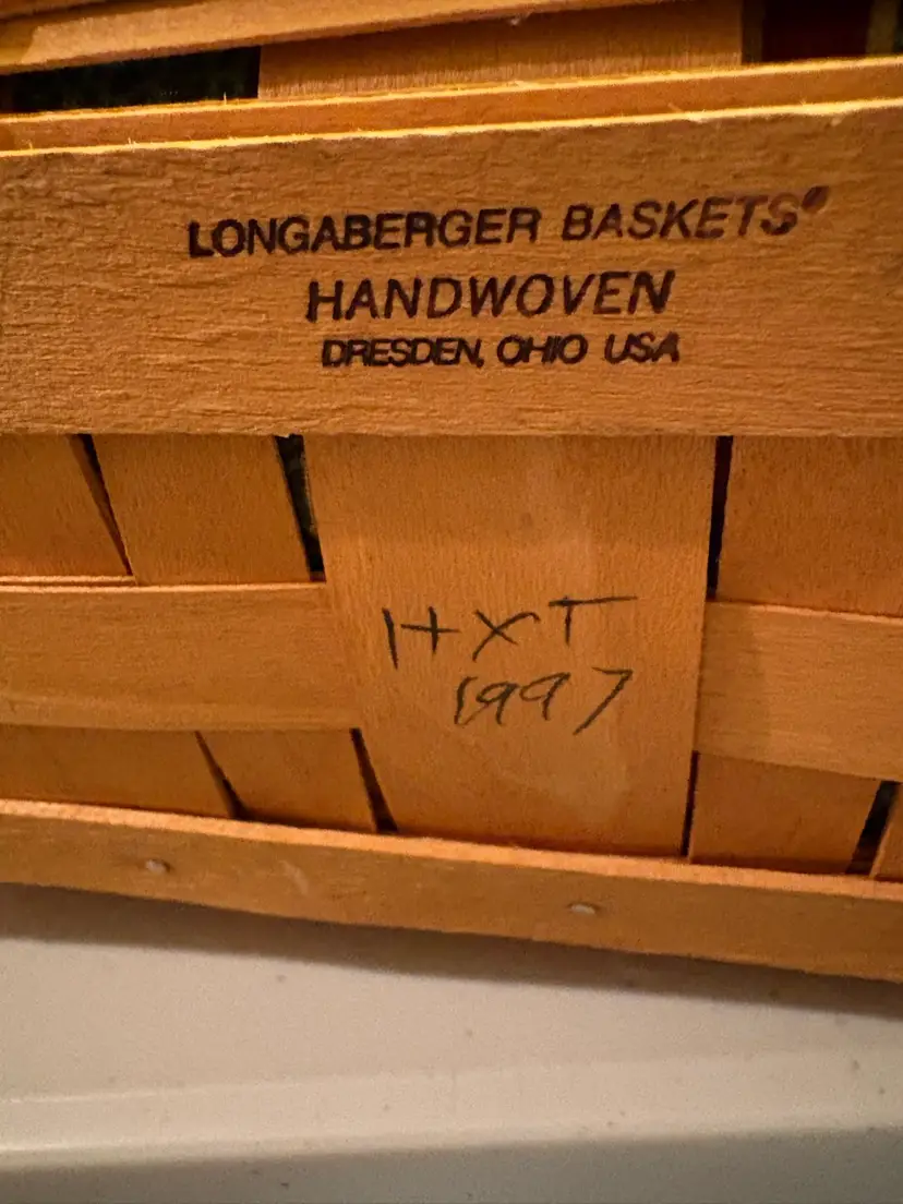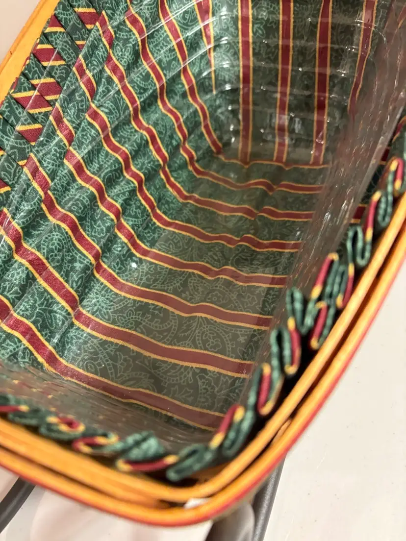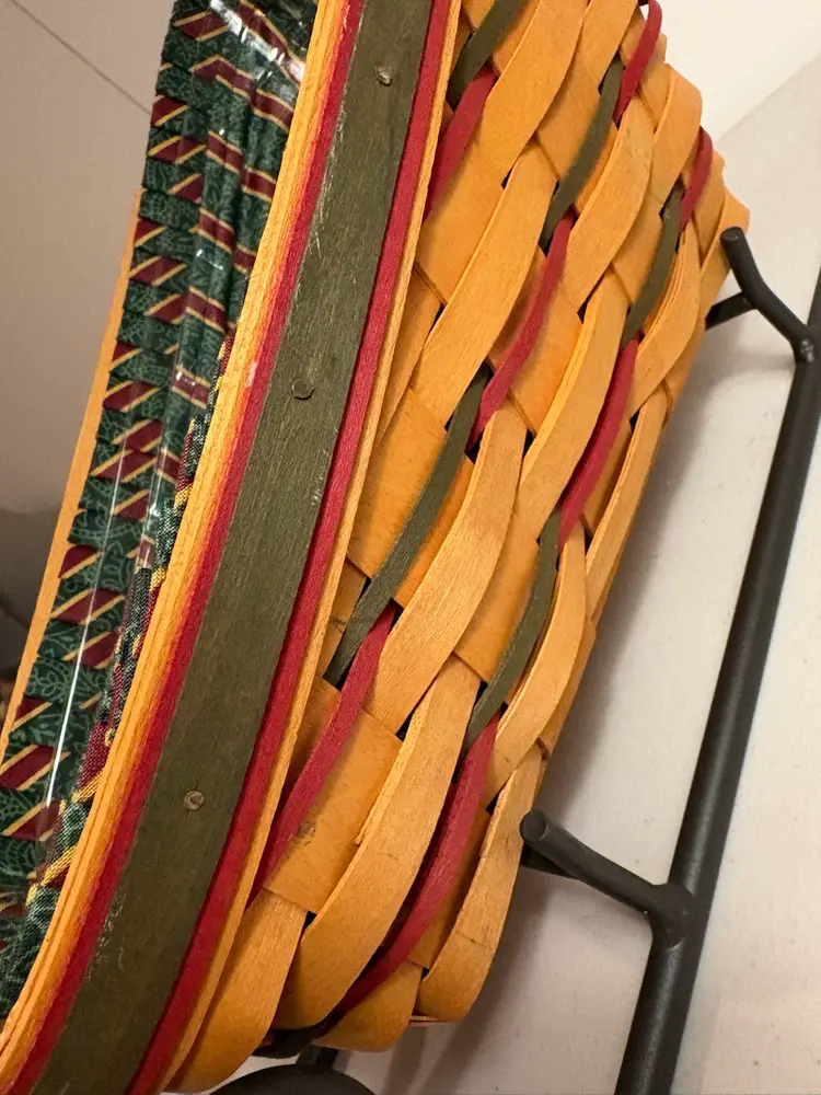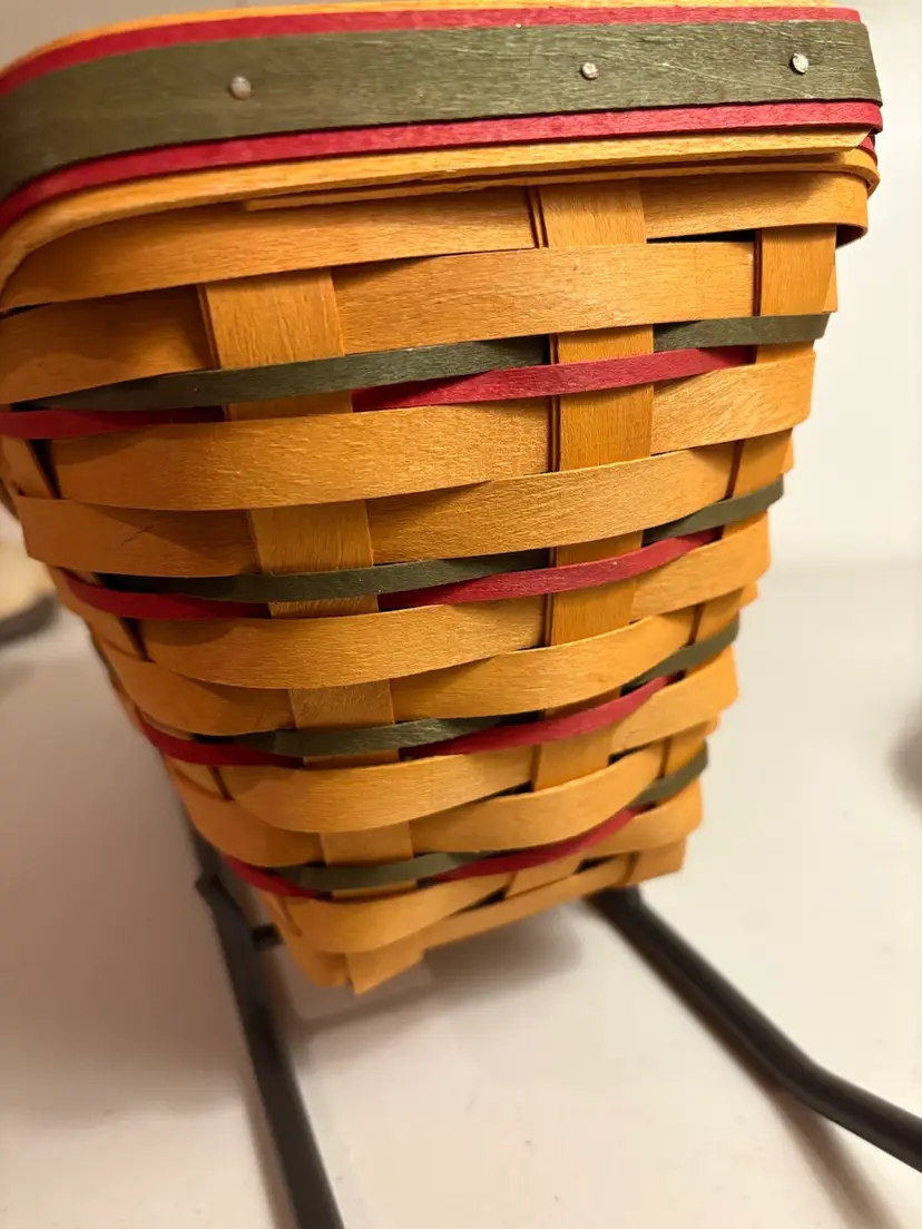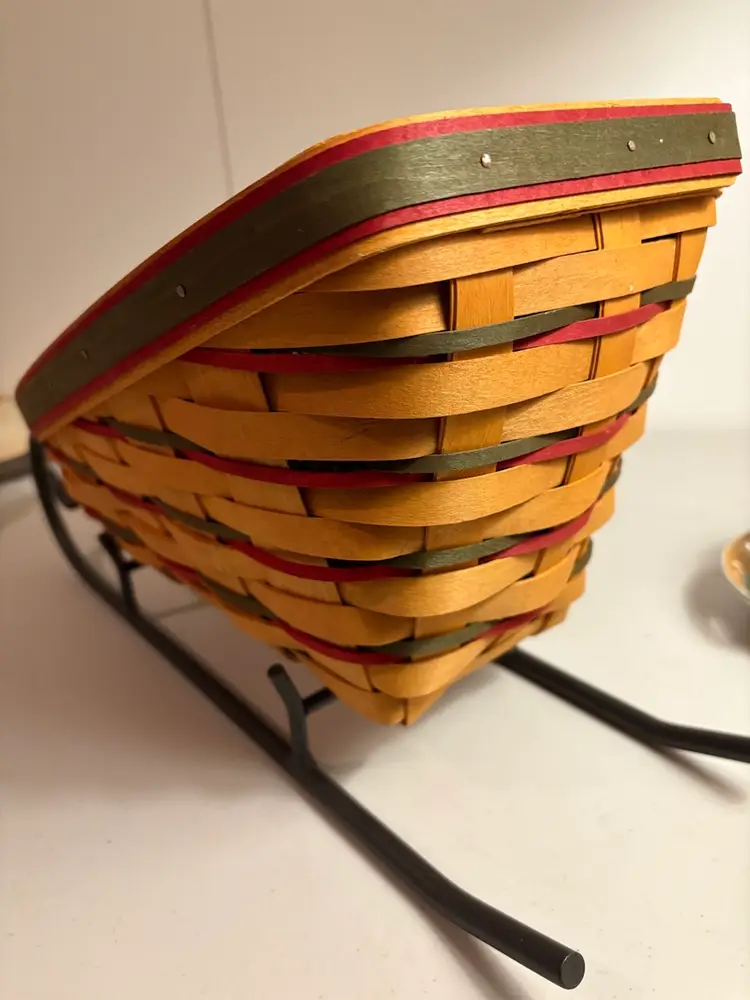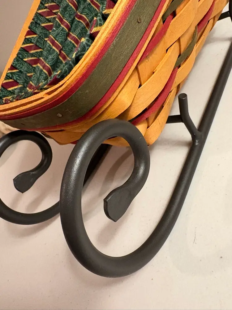 Longaberger 1997 Large Holiday Sleigh Basket Combo, Wrought Iron Sleigh Runners. The Longaberger 1997 Large Holiday Sleigh Basket Combo is a unique hand-woven wooden basket designed for Christmas celebrations. It features wrought iron slleigh runners, a stained finish, and a multicolor woven pattern. This large basket, measuring 13 inches in length, 8 inches in height, and 7.5 inches in width, is a handmade collectible from the late 20th century. Perfect for any room in the home, this original Longaberger piece is a timeless and festive addition to any Christmas decor