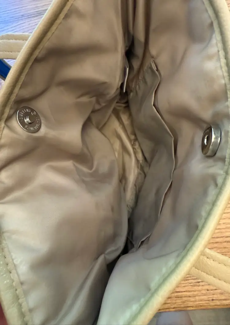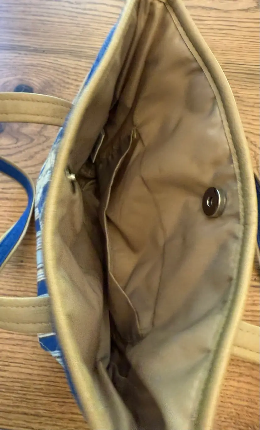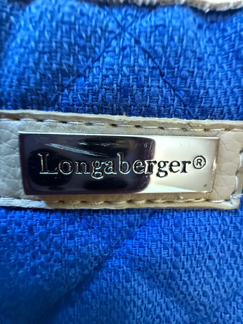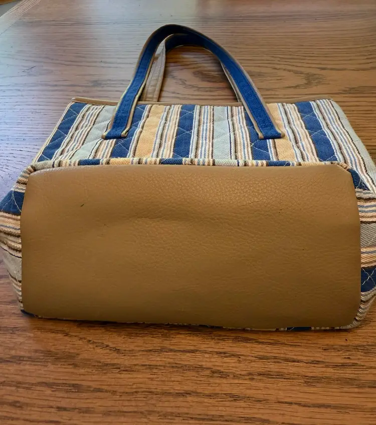 This Longaberger tote bag showcases a sophisticated blue and tan striped design, perfect for adding a touch of elegance to your daily ensemble. Crafted with durable materials, it features a structured rectangular shape and double handles for easy carrying. Ideal for both casual outings and resort wear, this tote combines style and functionality seamlessly. Perfect for any occasion. Measurements.: pit to pit from the shoulder to the bottom of the top is 23 inches is 17 inches. Excellent condition. Logan burger small handbag bottom measurement is 4 inches high by 7 3/4 inches wide. The purse itself is 9 inches high with strap included. It is 16 1/4 inches high. The width is 11 inches. It has a front Velcro shot pouch the entire length of the purse Inside there is a pocket snap closure.