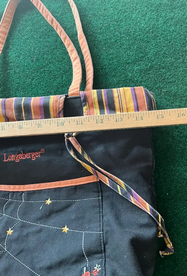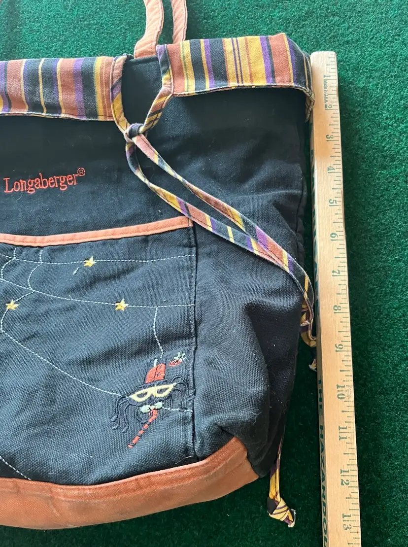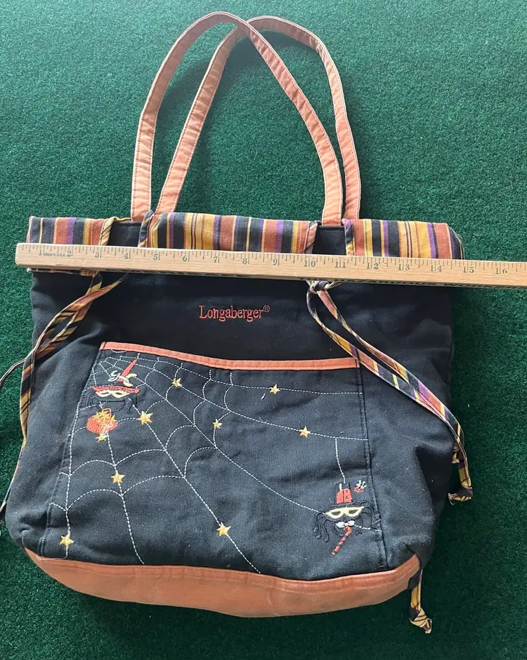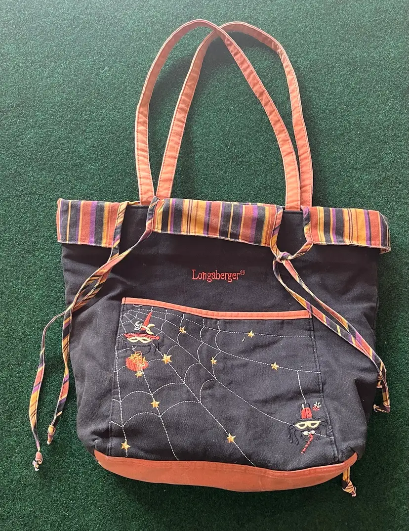 The Longaberger Halloween Totebag is a medium-sized tote and features a black exterior with orange accents and an embroidered spider web design, perfect for a casual Halloween occasion. The tote has a broken black zipper closure, but it is lined, lightweight, packable, and washable. With double handles shoulder strap drop. Enjoy a bit of festive Halloween as you go about your day!