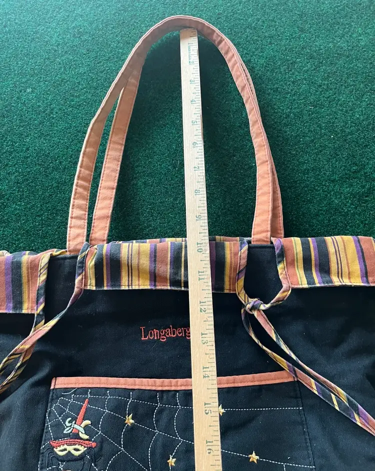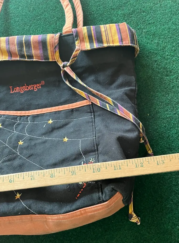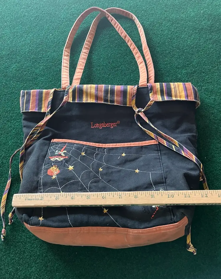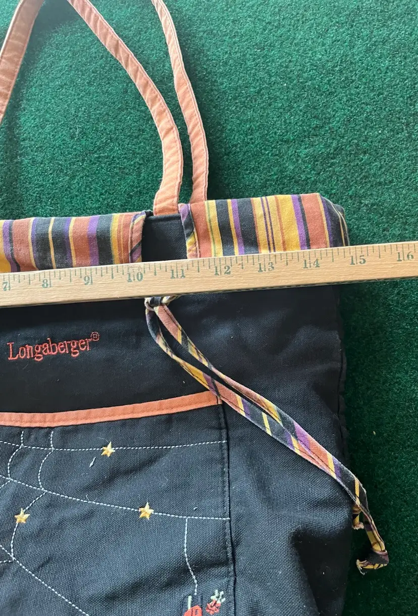 The Longaberger Halloween Totebag is a medium-sized tote and features a black exterior with orange accents and an embroidered spider web design, perfect for a casual Halloween occasion. The tote has a broken black zipper closure, but it is lined, lightweight, packable, and washable. With double handles shoulder strap drop. Enjoy a bit of festive Halloween as you go about your day!