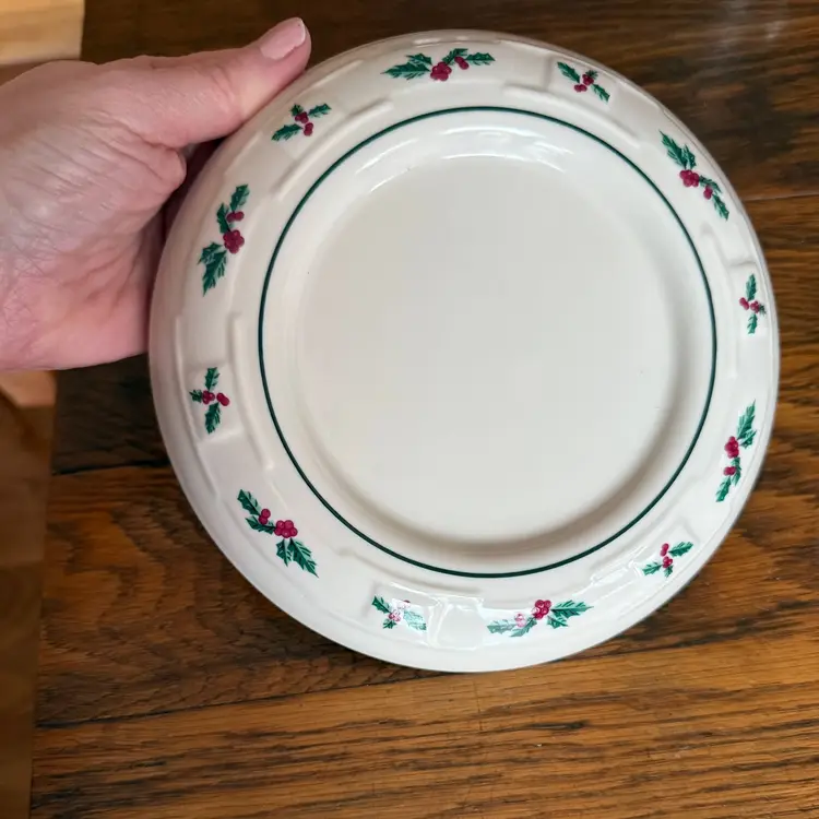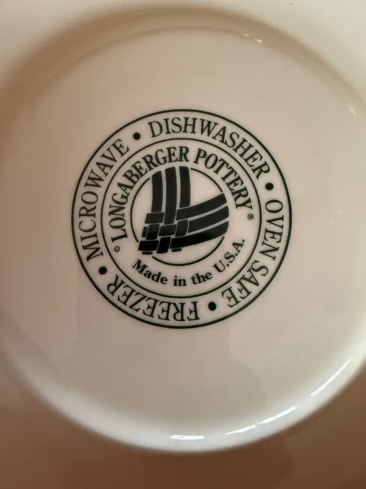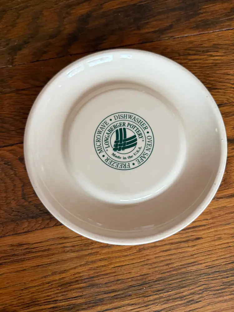 MEASUREMENTS Diameter: 7 inches Material: Longaberger Pottery Pattern: Holly (holly leaves & red berries) Color: Ivory with green trim Mark: Longaberger Pottery backstamp