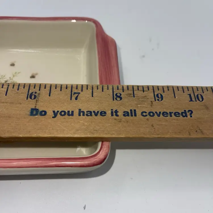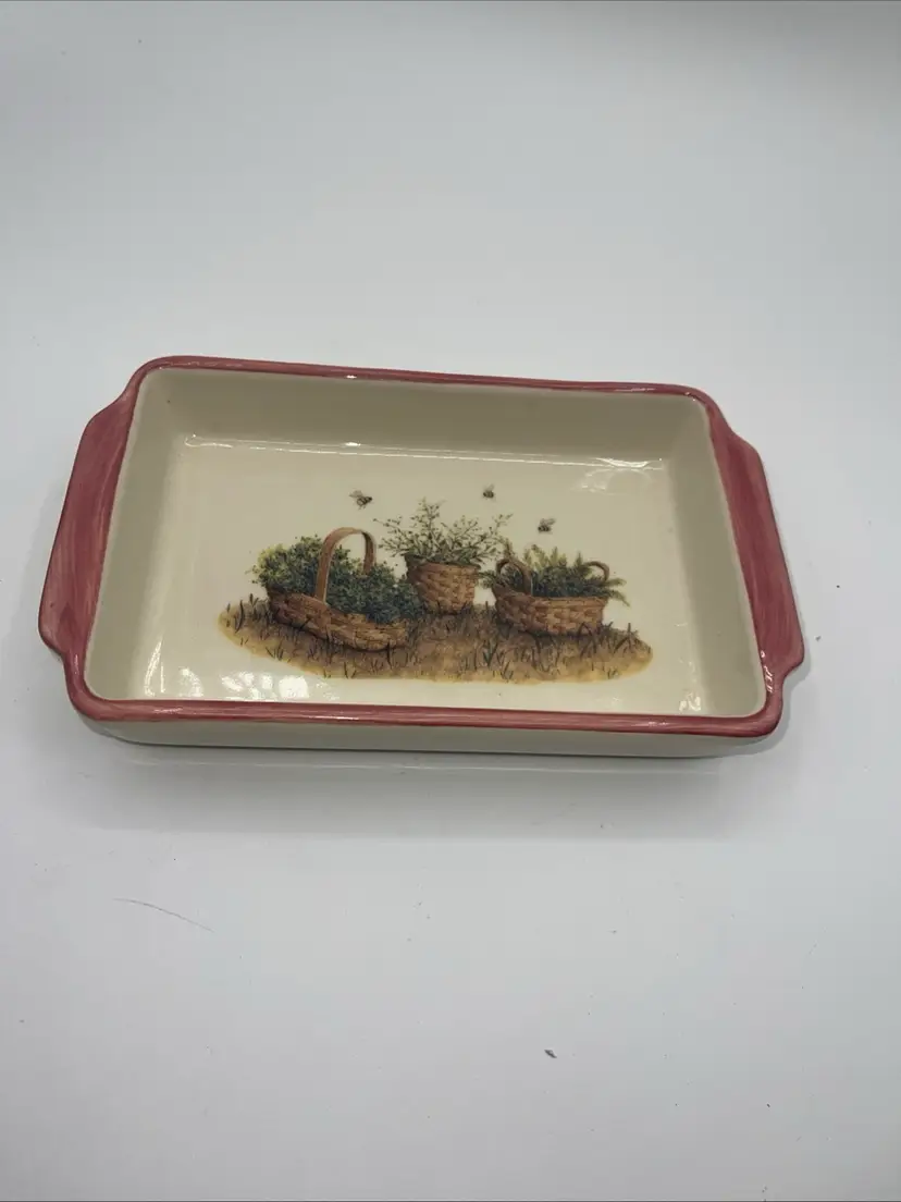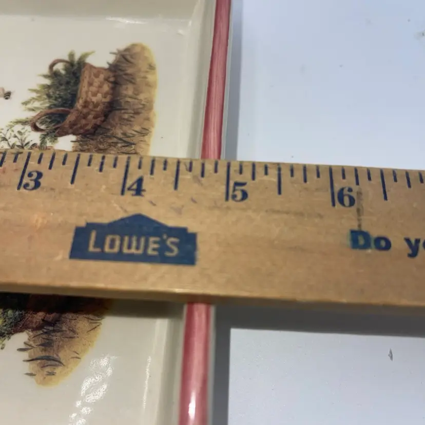 It’s approximately 8” x 5” inside it has baskets with honeybees. There’s no chips or cracks. The rim is a light pink color. Thank you for looking. Ask any questions you may have.