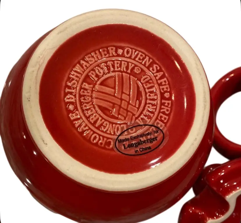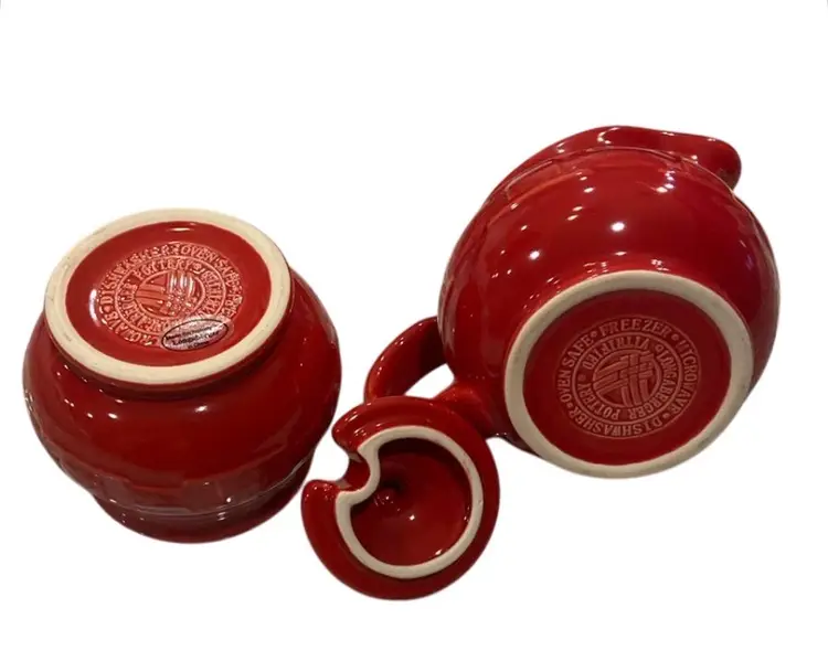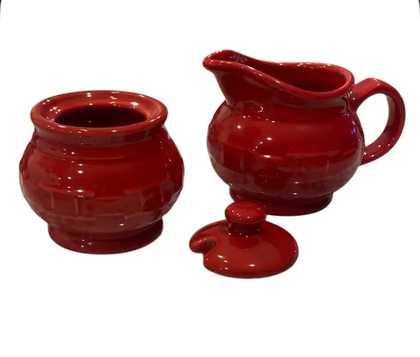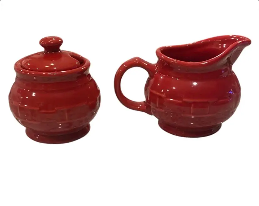 The Longaberger Pottery Woven Traditions Tomato Red Creamer & Sugar Bowl with Lid Set is a traditional ceramic set made in the United States. This original set includes a creamer, sugar bowl with lid, and features a woven pattern in a paprika color. Perfect for collectors or those looking to add a touch of elegance to their kitchen or dining room, this Longaberger set is a timeless piece that brings a sense of craftsmanship and quality to your home.