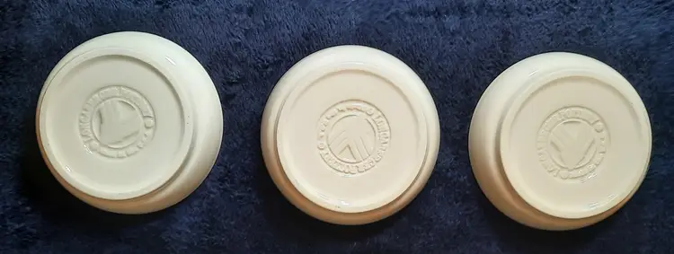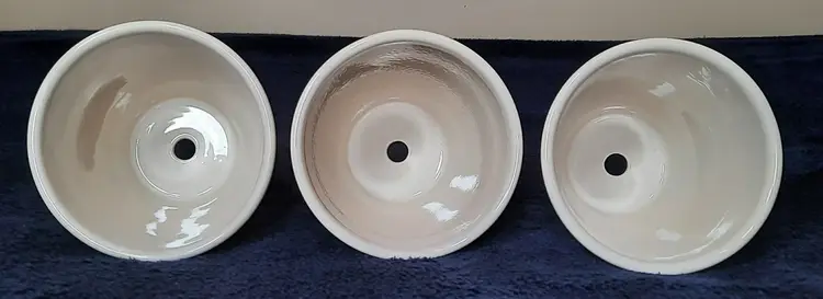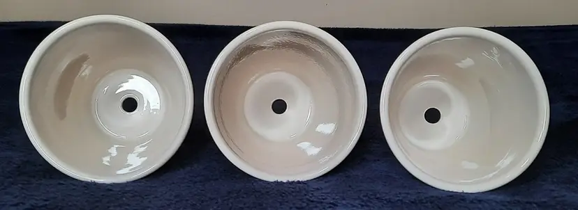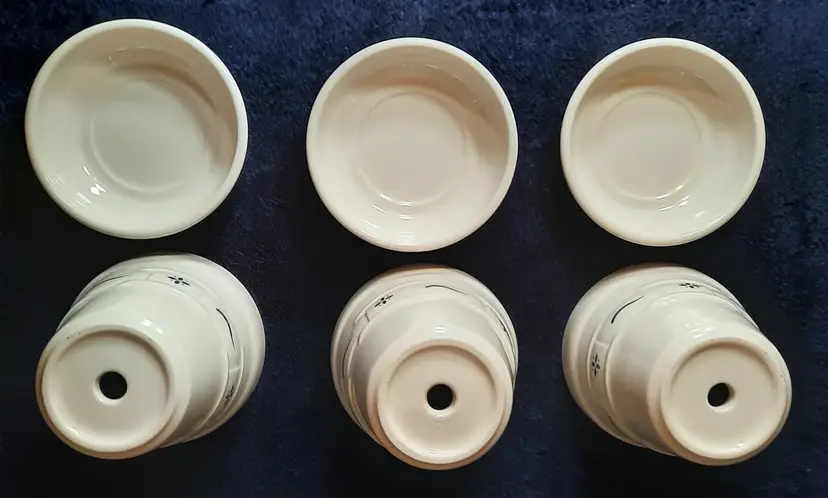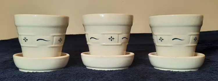 Vintage Longaberger Pottery Woven Tradition Classic Blue Flower Pot & Saucer 4” set of 3. The flower pot is approximately 4 5/8 inches tall and 4 3/8 inches wide. Made of pottery and features an embossed weave pattern with blue flower and line accents. These pots look like new. No chips, cracks or crazing. Made in U.S.A. This pattern is discontinued.