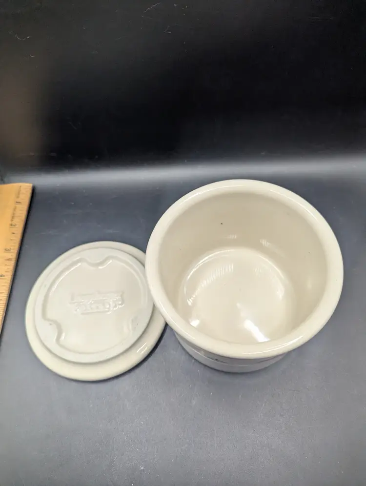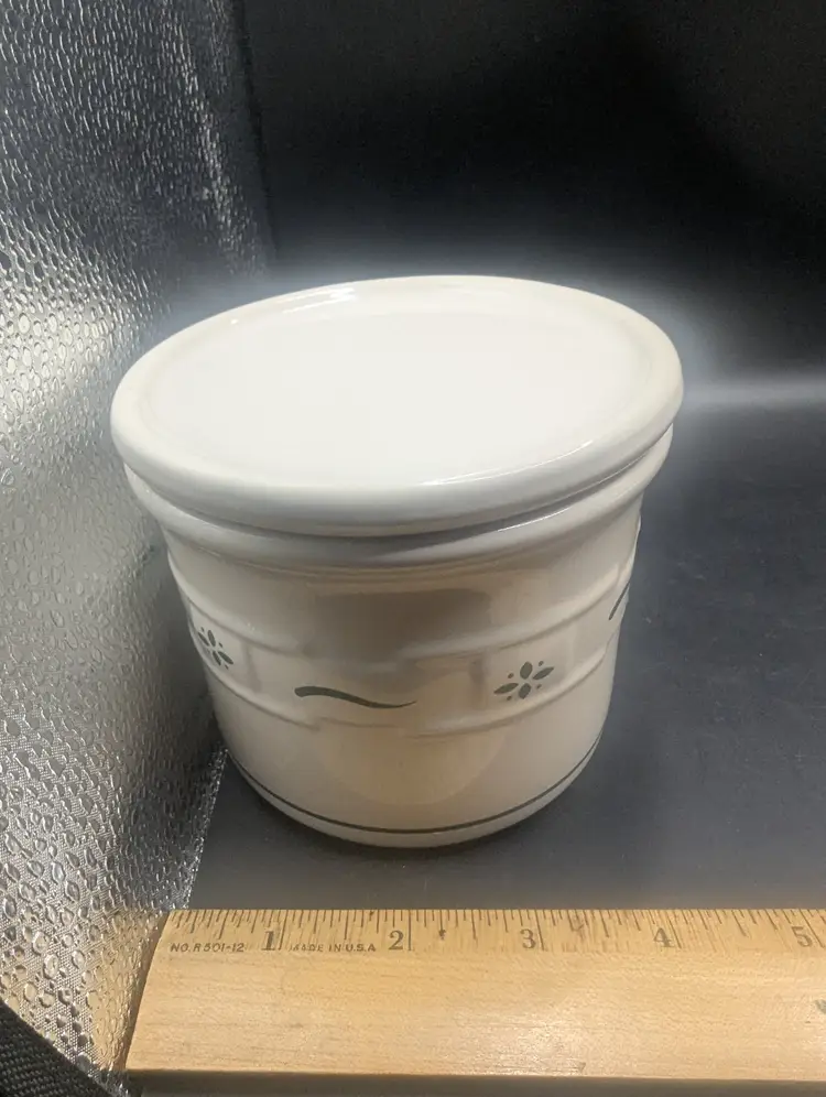 This is a lovely Longaberger Woven Trad Pottery GREEN Pint Salt Crock with Lid/Coaster~USA. It measures 4.5 inches in diameter and stands 4 inches tall. No chips or cracks. Please see all pictures for condition and measurements. I do have a matching Paprika Woven Traditions pint crock as well.