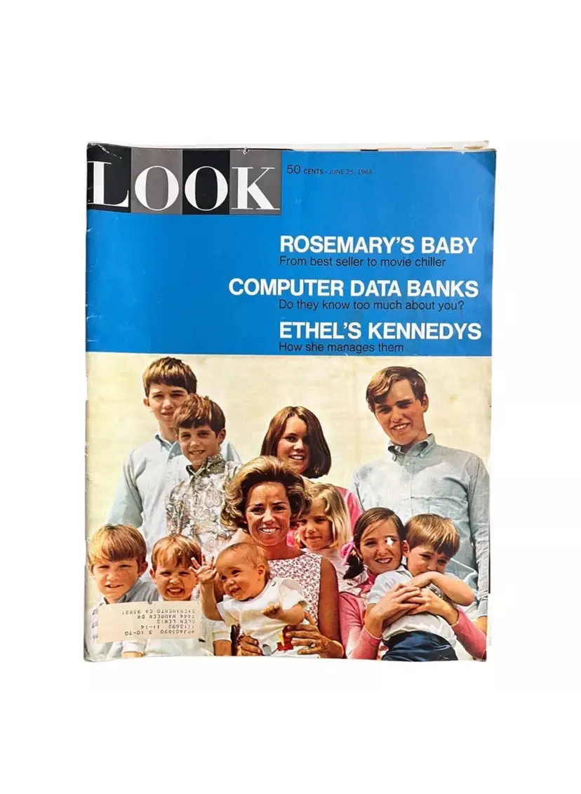 This issue of Look Magazine from June 25, 1968 features a plethora of interesting articles and features. Highlights include coverage of Ethel Kennedy's family, RFK Jr., and the controversial topic of computer data banks. Additionally, readers can enjoy insightful commentary on the novel "Rosemary's Baby" and the latest trends in news and history. This edition is a must-have for collectors and enthusiasts alike.