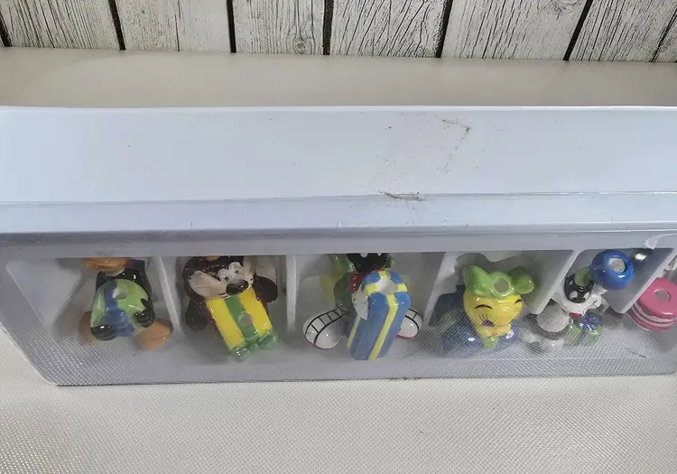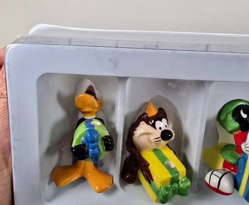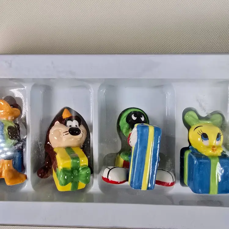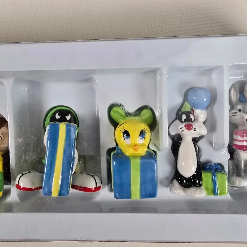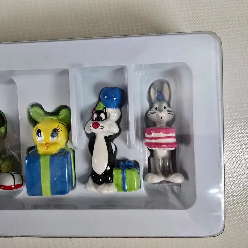 Celebrate with classic cartoon fun using this vintage set of 6 ceramic Looney Tunes birthday candle holders. Featuring beloved characters like Bugs Bunny, Tweety, and Daffy Duck, each holder doubles as a whimsical cake topper boxed and ready to add retro charm to any party. Set of 6 ceramic candle holders with Looney Tunes characters Includes original box with vintage Warner Bros branding Doubles as fun cake toppers or collectible party decor Perfect for birthdays, collectors, or nostalgic celebrations
