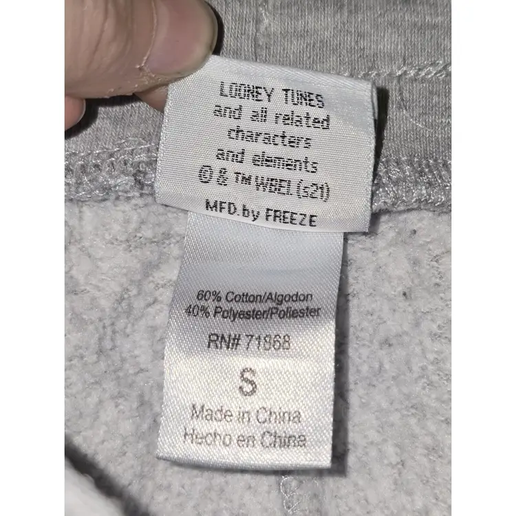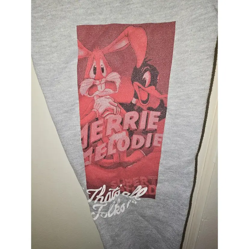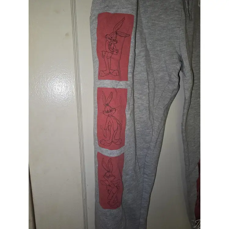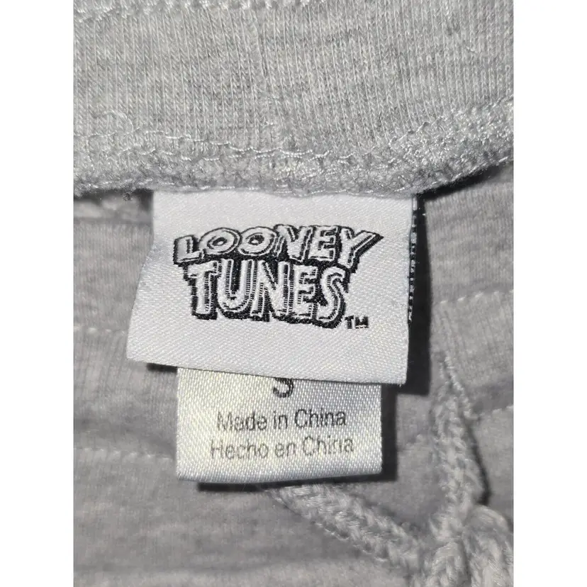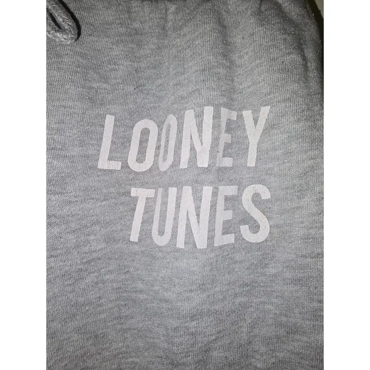 Preowned. Looney Tunes Gray Sweat Pants Lightweight Small Jogging Bugs Bunny Daffy Duck. Has some lint and loose threads from storage. Has a small stain on right leg below the graphic and on the back left leg. Has a small snag on the left leg next to graphic. Graphics have some cracking. Made in China. Mens size small.