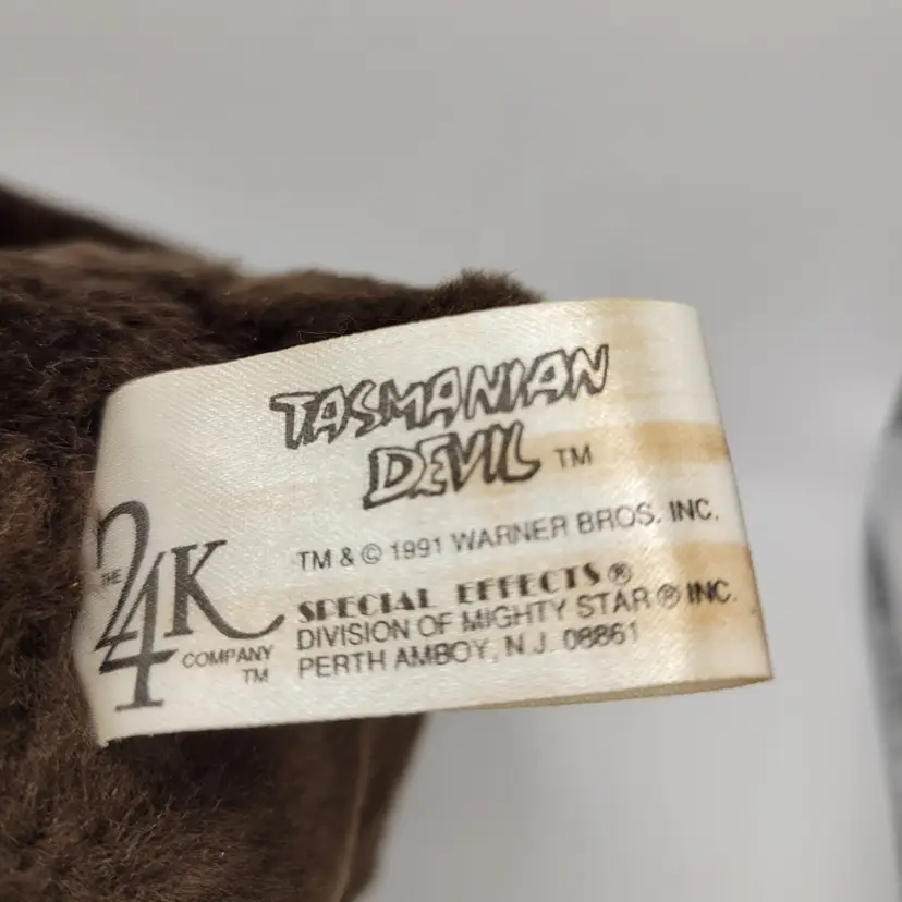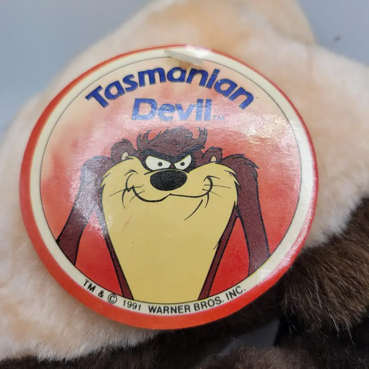 The product is a vintage 1991 Warner Bros. Looney Tunes Tasmanian Devil plush toy from Korea, measuring 8 inches in size. This collectible stuffed animal features the iconic character Taz from the Looney Tunes franchise, making it a must-have for fans of the series. The plush is a medium size and was manufactured in South Korea, adding a unique international touch to this classic Warner Bros. merchandise.