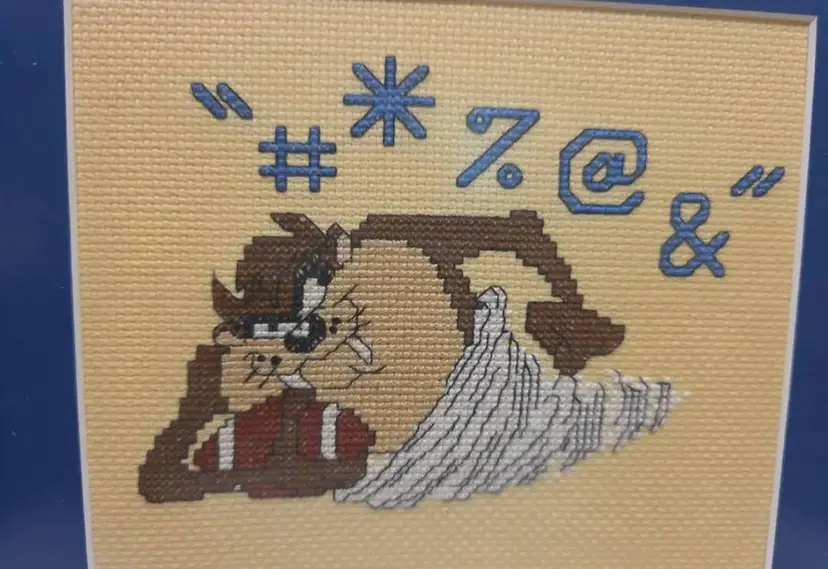This Looney Tunes Taz Tasmanian Devil Cross-Stitch features the iconic character Taz from the Warner Bros. Animation franchise. The framed 8 inch × 10 inch artwork showcases a colorful design that is perfect for fans of cartoon and TV characters. The multicolor cross stitch creation captures the essence of the Tasmanian Devil, making it a unique and eye-catching collectible item for enthusiasts of Looney Tunes.