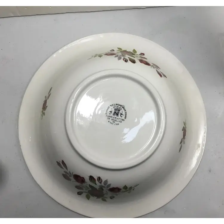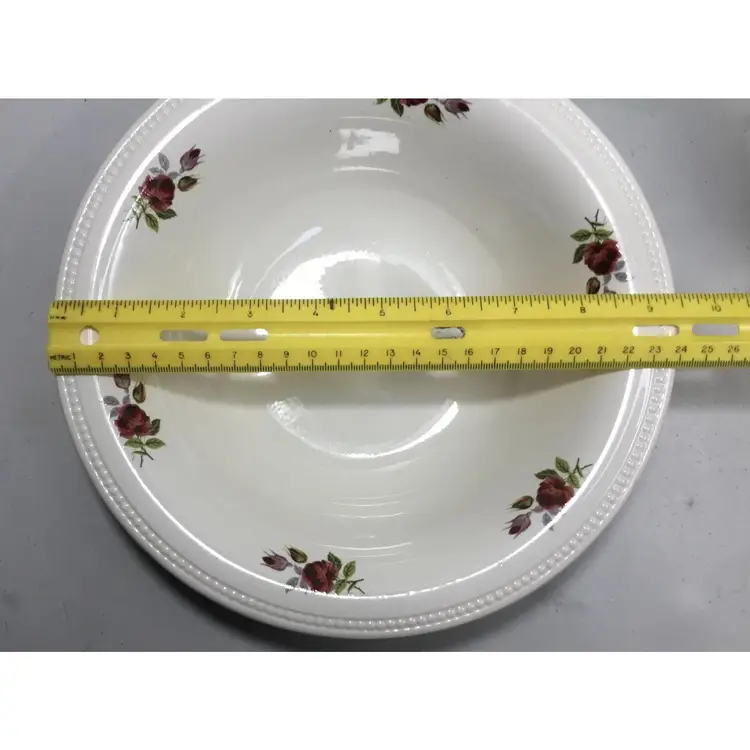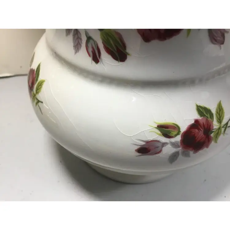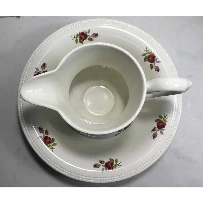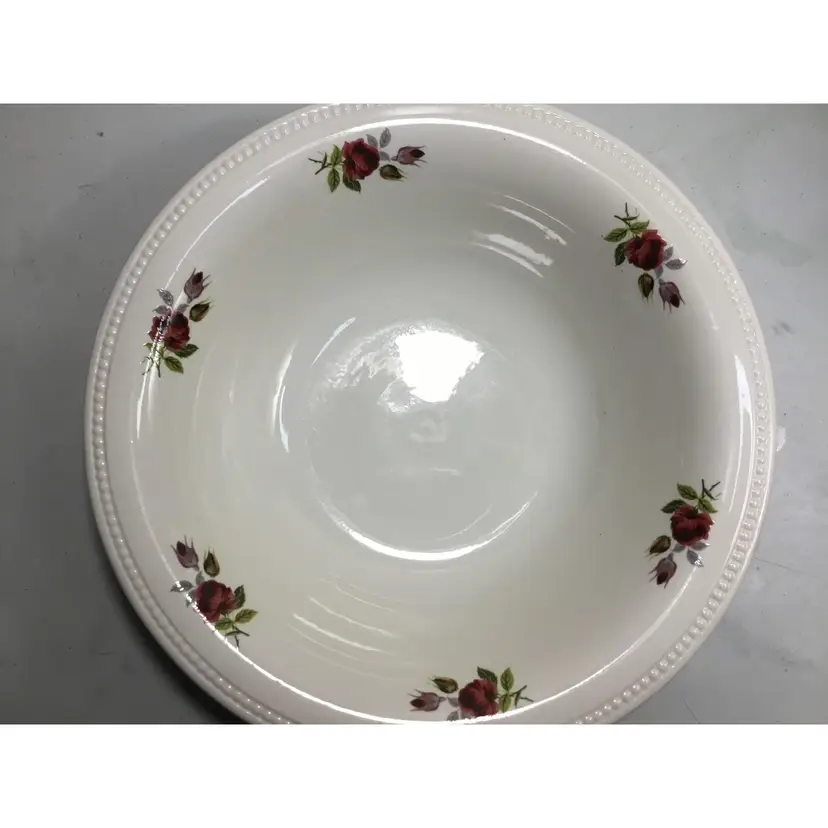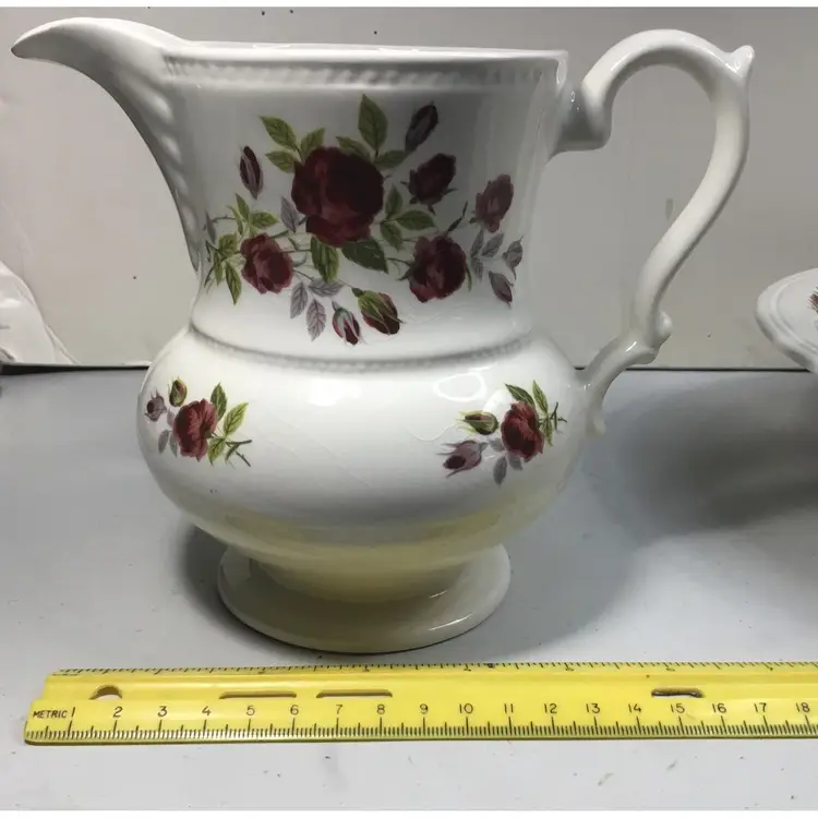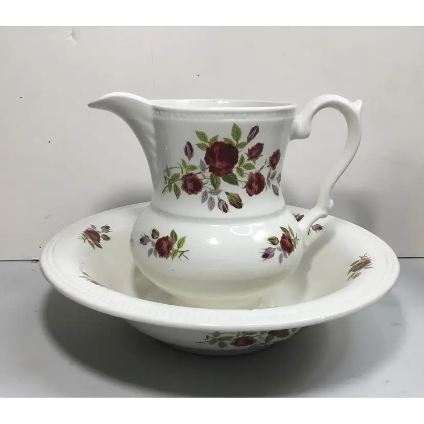 Victorian style basin and pitcher, smaller size, basin is 9.5 inches across, 2 inches tall, and holds 2 cups of liquid. Pitcher is 5.5 inches tall, 7.5 inches from tip of spout to wide part of handle, and holds 3 cups of liquid. Red rose transfers on outside of pitcher as well as inside AND outside of basin. Textured rim on basin and textured detail in 2 places on pitcher. Good condition, pitcher has some crazed glazing, and 2 tiny chips ( about 1 - 2 mm) in the rim) See all photos.