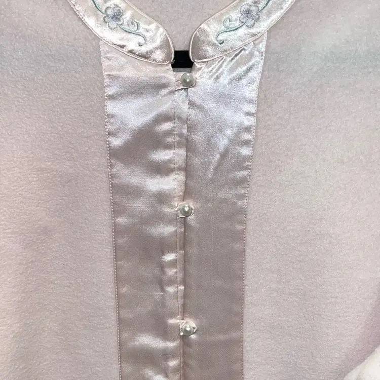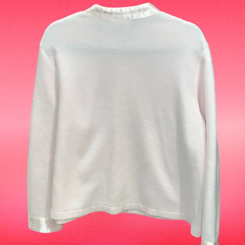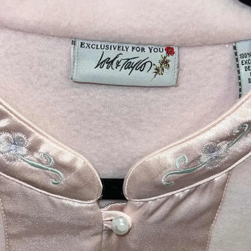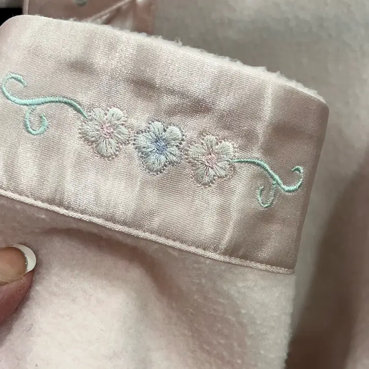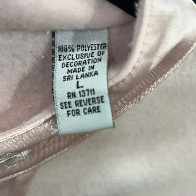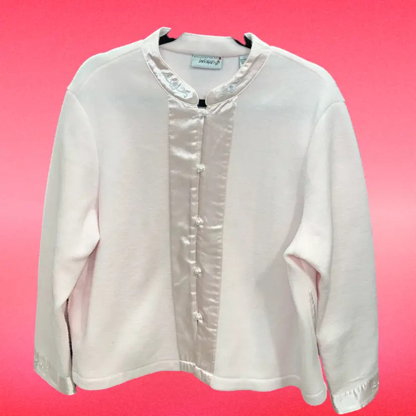 Pale pink fleecy loveliness will make you want to cuddle up with a good book, or movie. Bed jackets were standard fare back in the day. Today they are trending as outerwear with a camisole and jeans or a little black dress. Pearl buttons, embroidered satin trim and in excellent condition. Size L. PTP is 23”. 27”L.