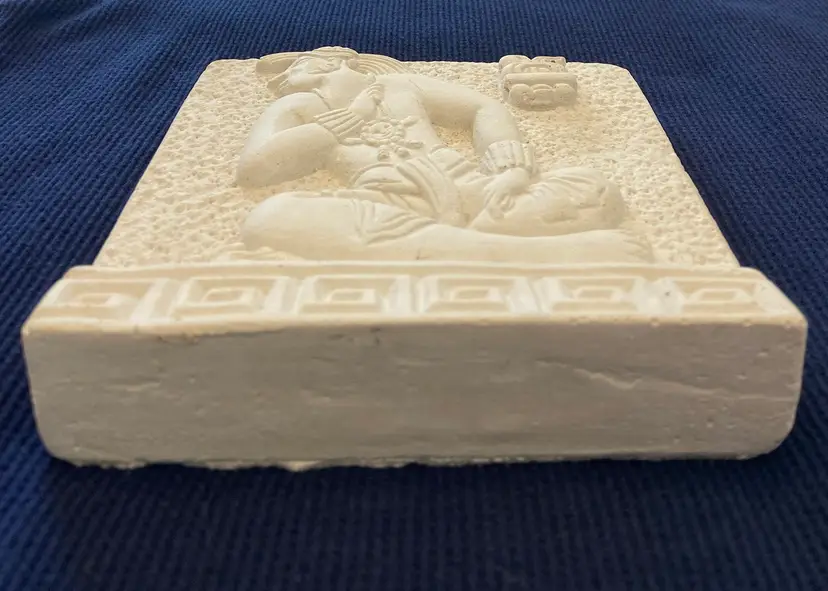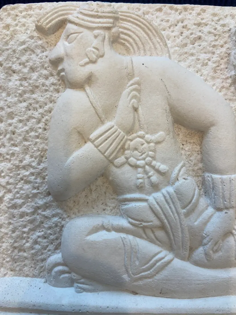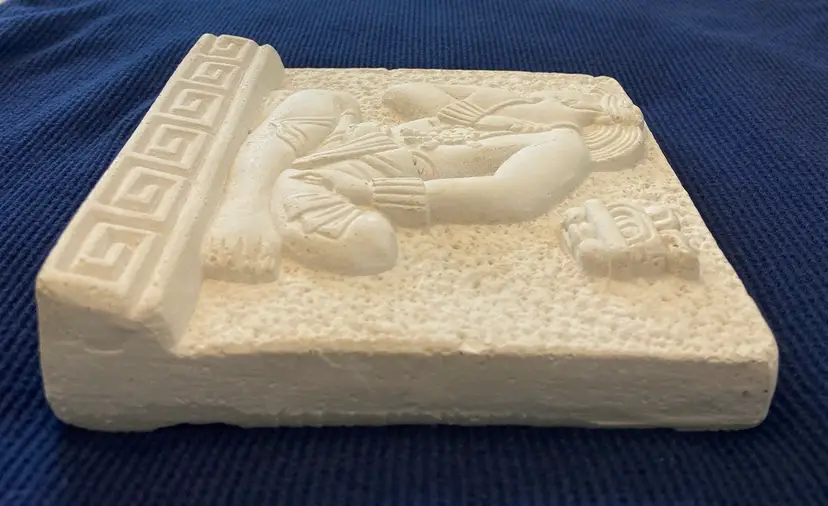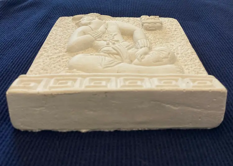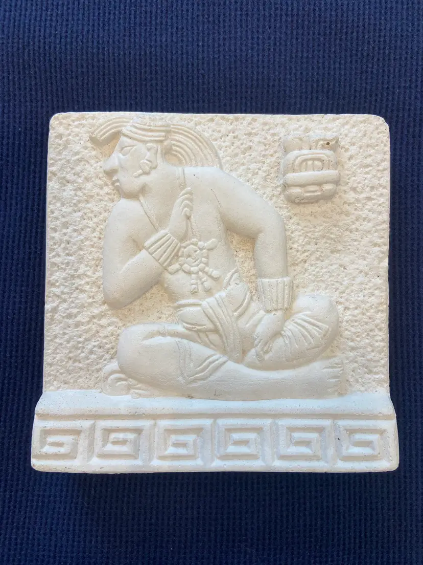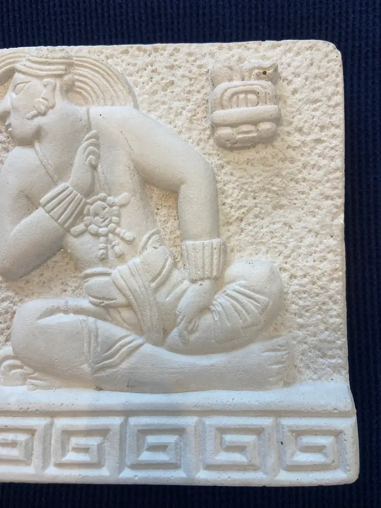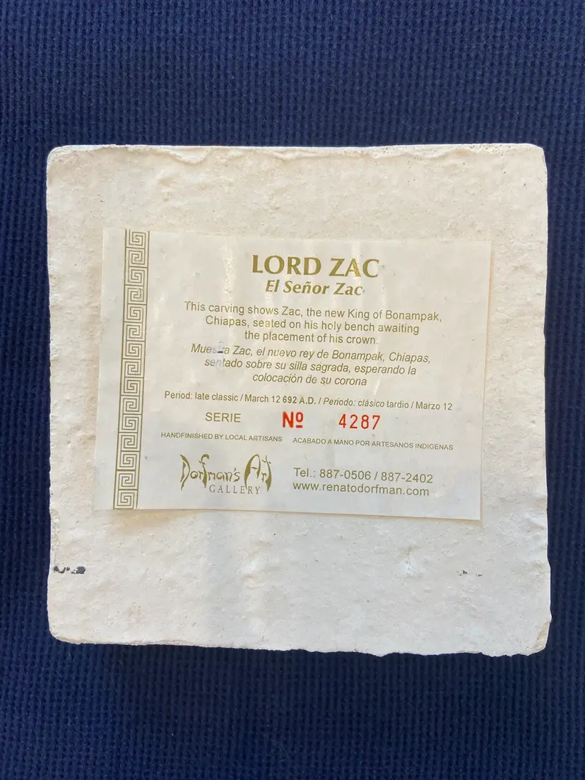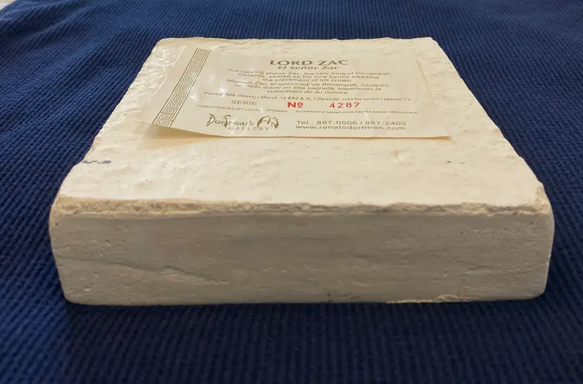 Lord Zac the new king of Bonampak Chiapas #4287, seated on his holy bench awaiting the placement of his crown by Dorfman's Art Gallery. This piece is a reproduction based on the Late Classic period, 692 A.D. This is a preowned piece in very good condition, no chips or cracks. Measures approximately 5" tall 5" wide and 3/4" thick.