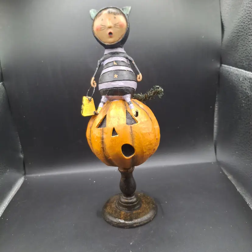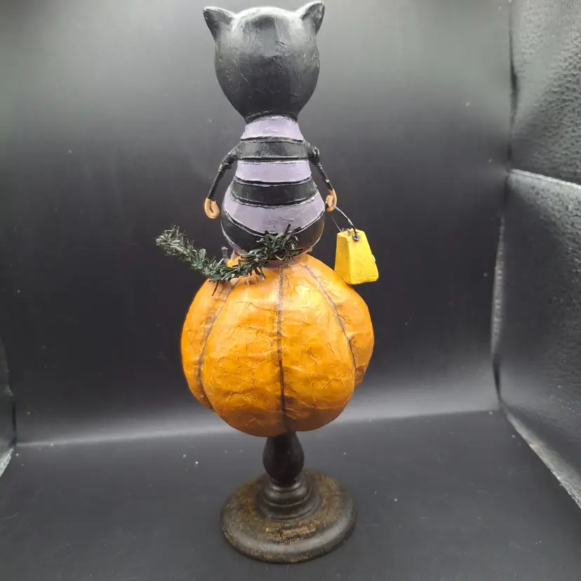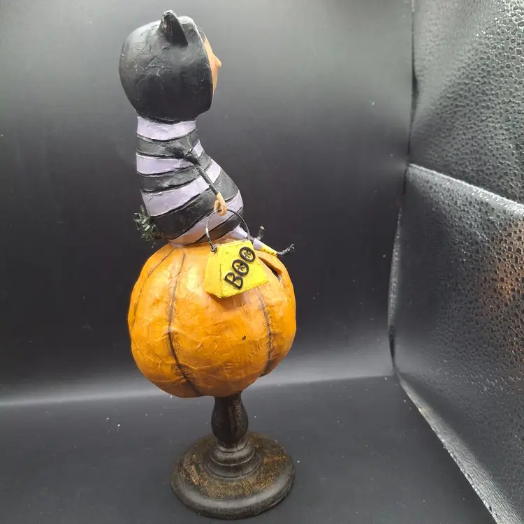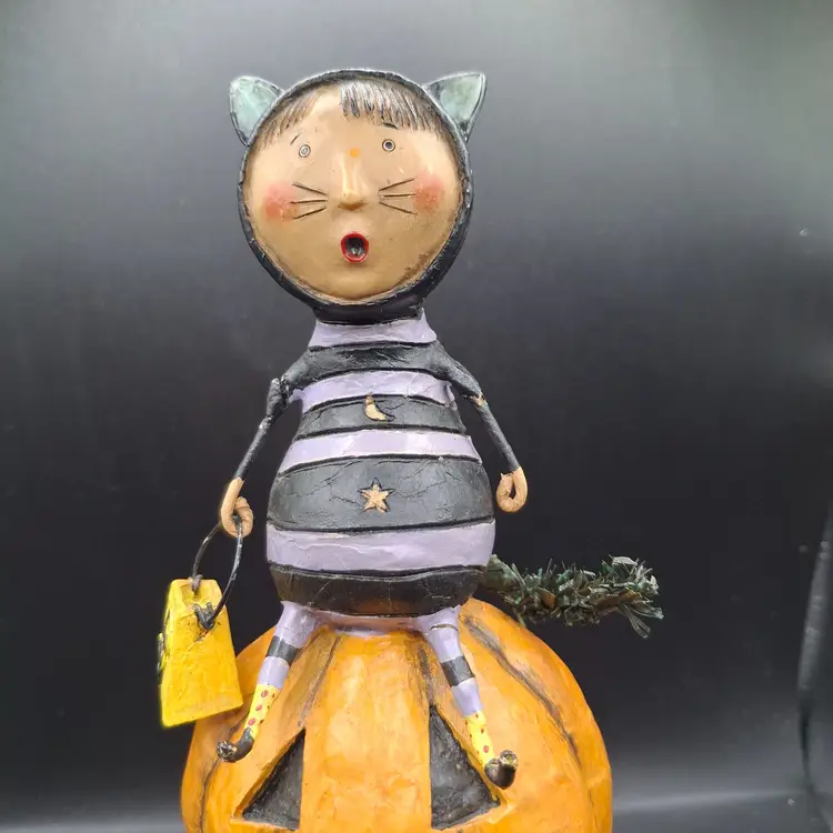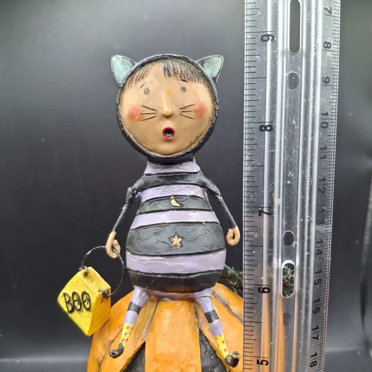 In the heart of Halloween, a little cat girl perches atop a pumpkin, casting a whimsical spell. Her striped attire, complete with a tiny tail and ears, invites onlookers into a playful, enchanting world. This delightful figurine, with its charming details, is a tale of Halloween magic and childlike wonder.