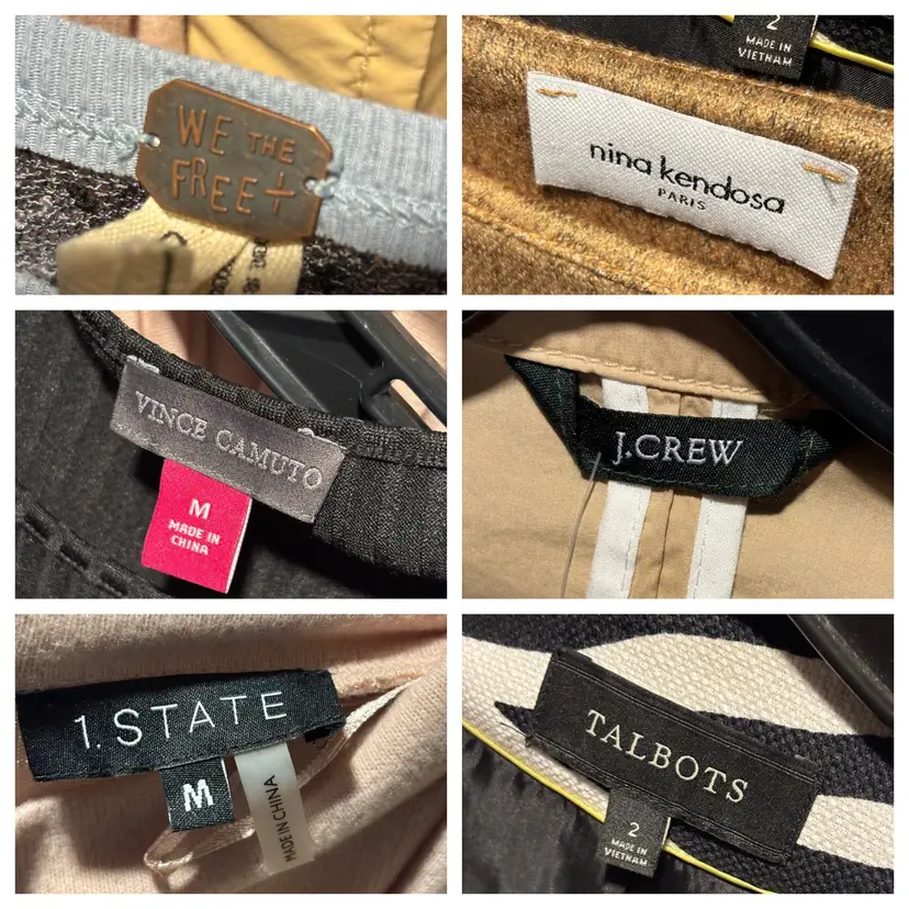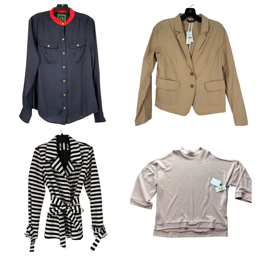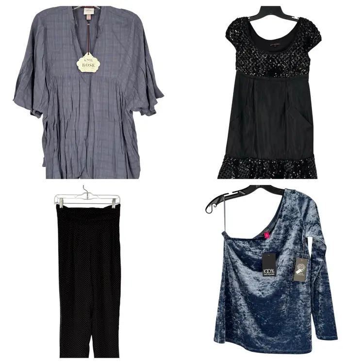 Lot of 12 5 NWT all others great condition no flaws Knox Rose NWT Nina Kendosa Paris mini dress mediu Vince Camuto ribbed top Medium NWT Vince Camuto crushed velvet one shoulder NWT XS Black White belted coat s/m (no label but very good quality ponte fabric, lined) J Crew jacket size 4 NWT Free People small Love H8 polka dot pant small