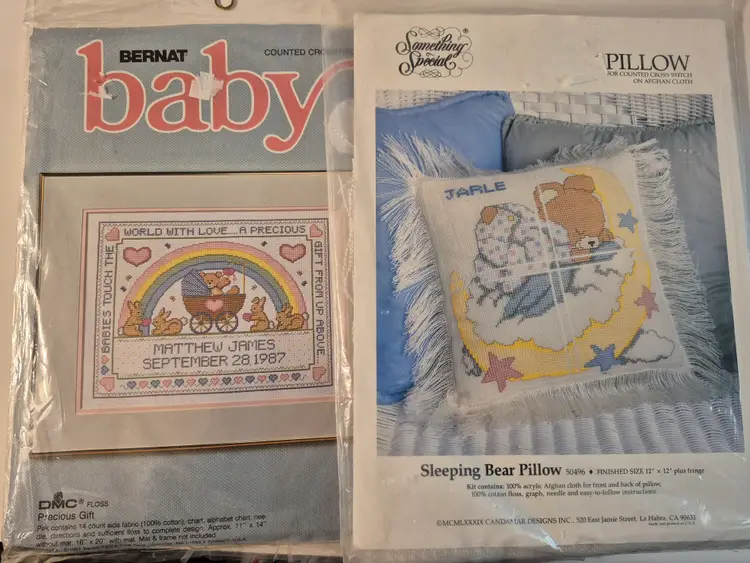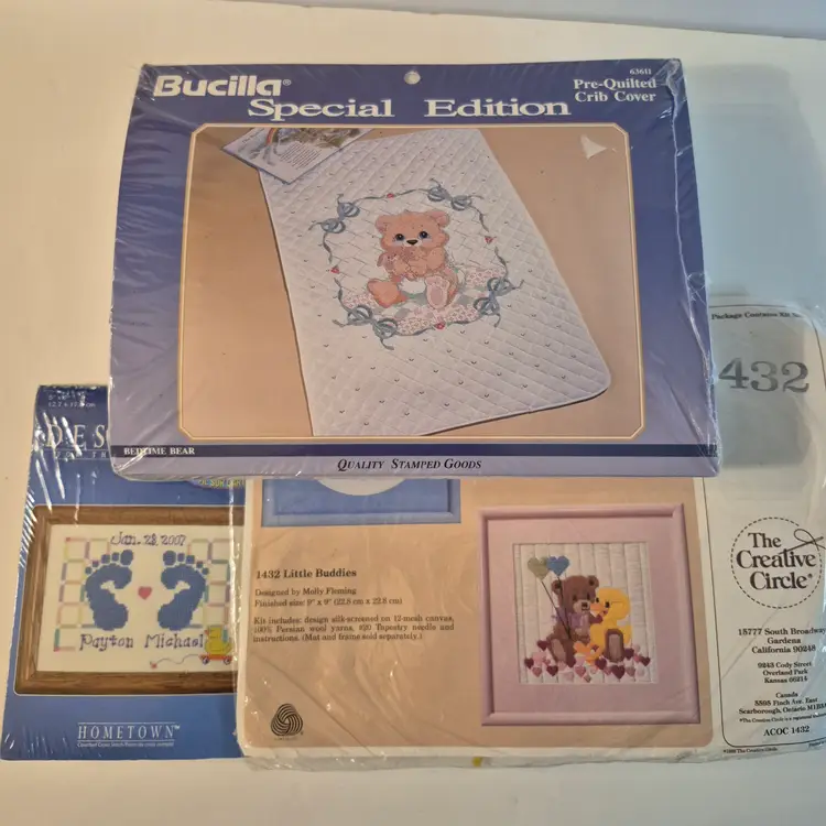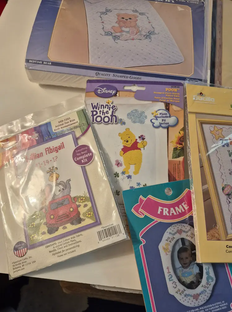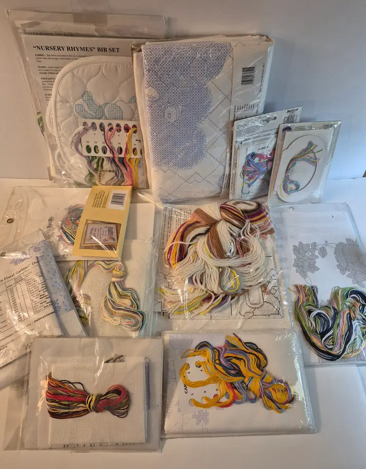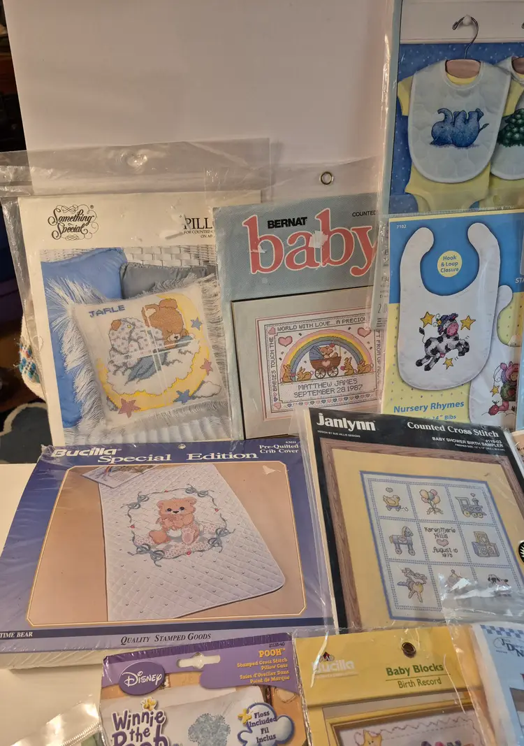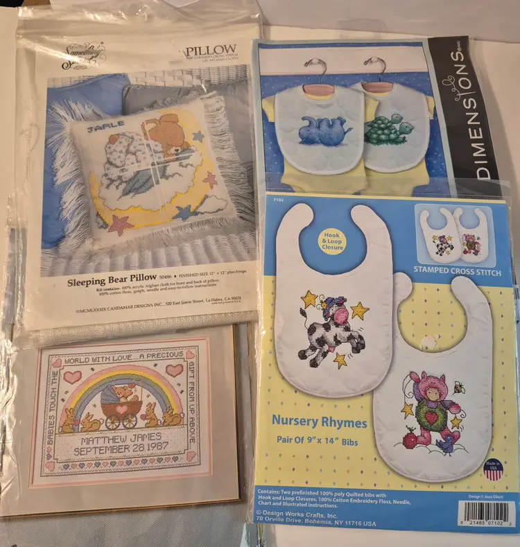 16 BABY THEME KITS New in package-only 2 have an opening 2 sets do not include the thread 1 with Persian wool yarn Sets includes: birth announcements, birth records, dresser scarf/doily set, crib cover, bibs, and more.
