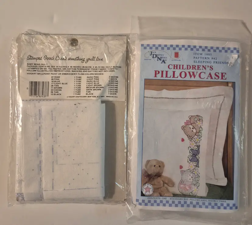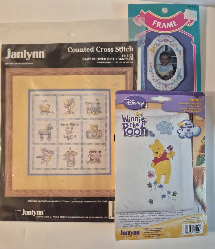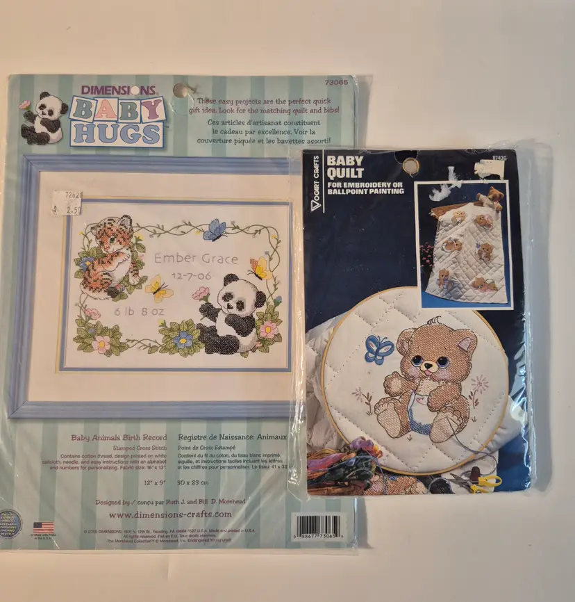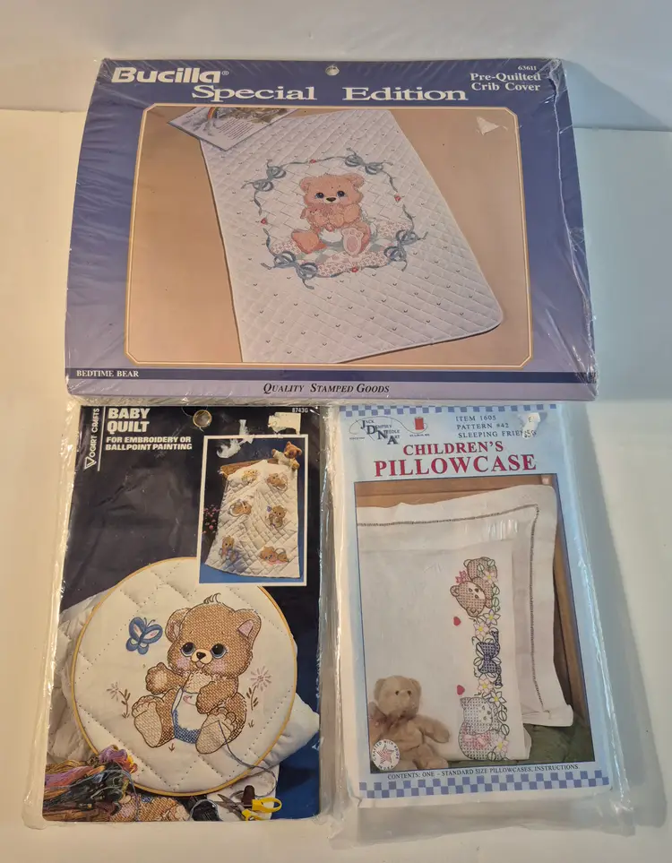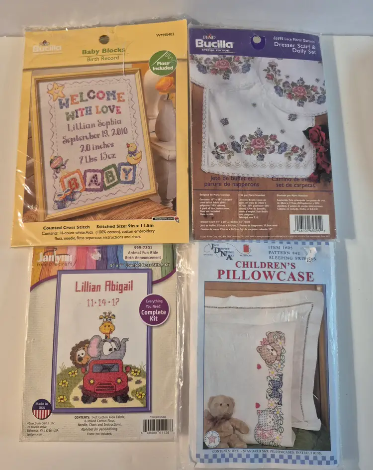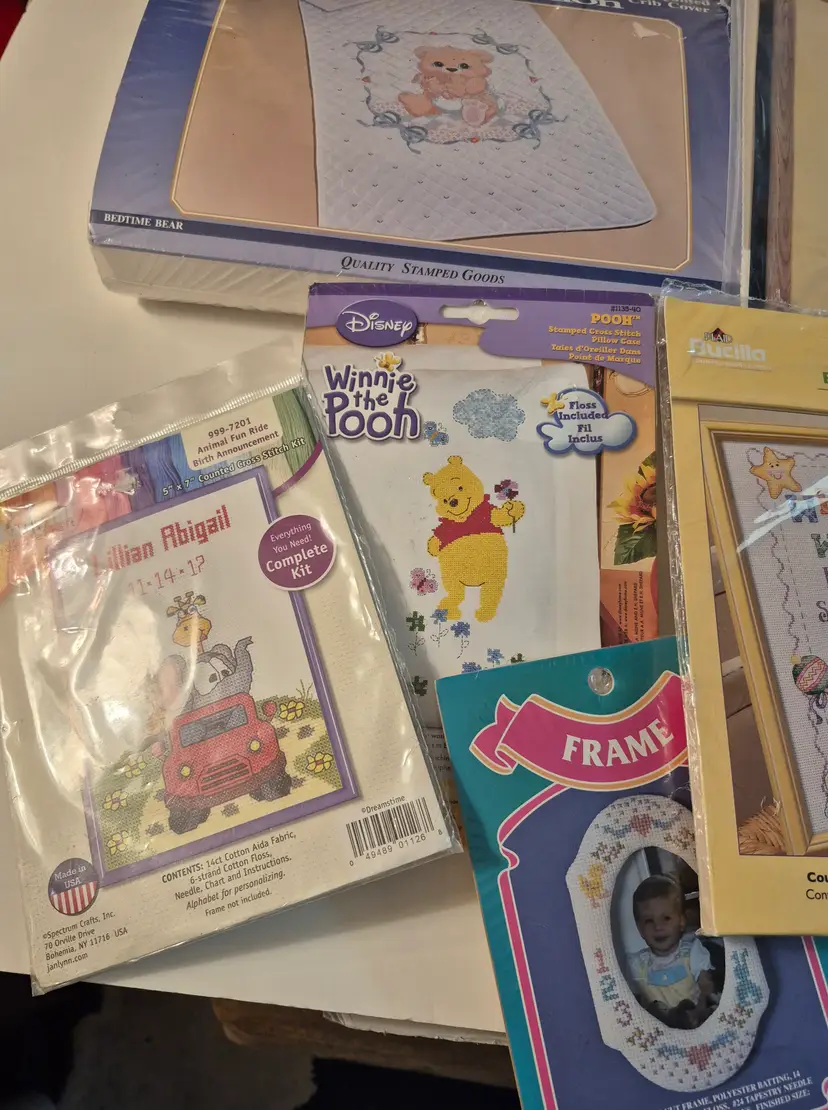 16 BABY THEME KITS New in package-only 2 have an opening 2 sets do not include the thread 1 with Persian wool yarn Sets includes: birth announcements, birth records, dresser scarf/doily set, crib cover, bibs, and more.