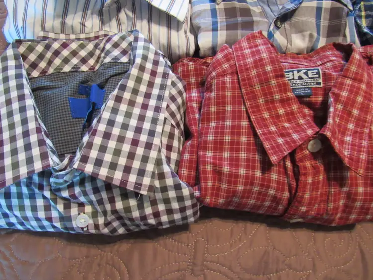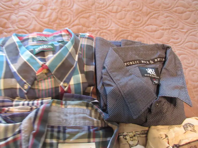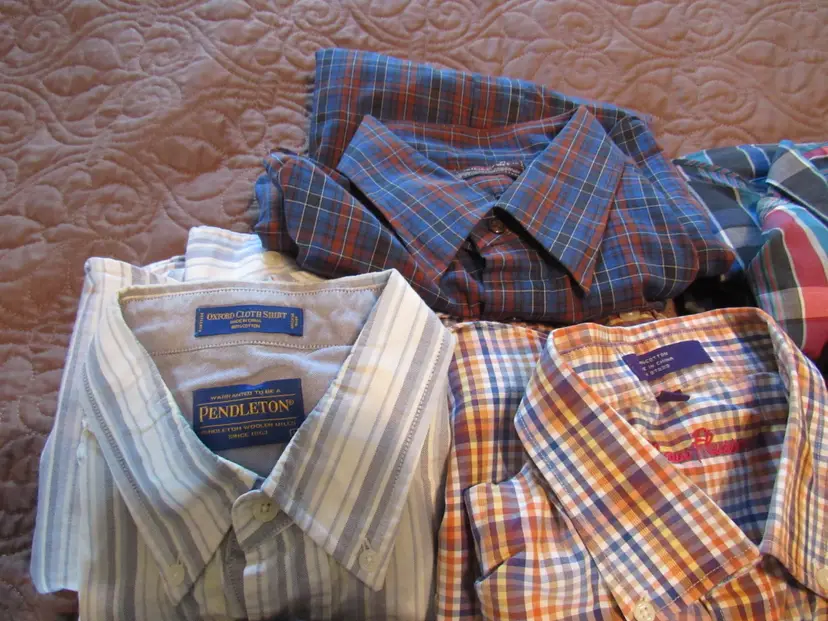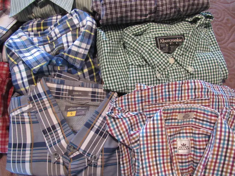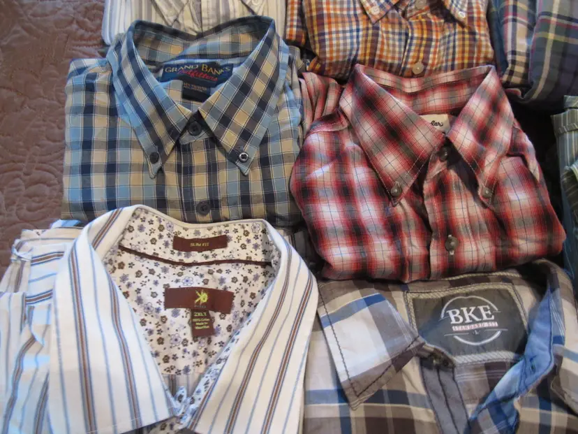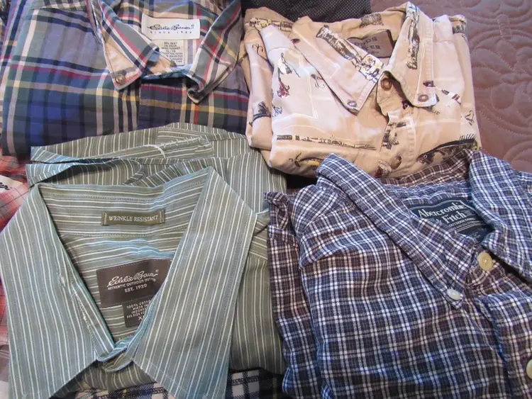 Lot of 19 long sleeve button shirts. Includes 4 Eddie Bauer, 2 Abercrombie & Fitch, 1 Peter Millar, 1 Woods & Water, 1 Rock Republic, 1 Saville Row, 1 Kingsport, 1 Grand Banks Outfitters, 1 Wrangler, 2 Egara and 2 BKE. Sizes are 3 medium, 7 large, 8 XL and 2 XLT. Nice condition.