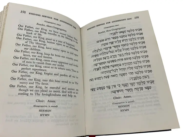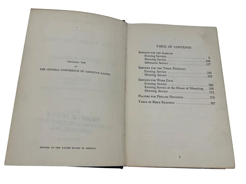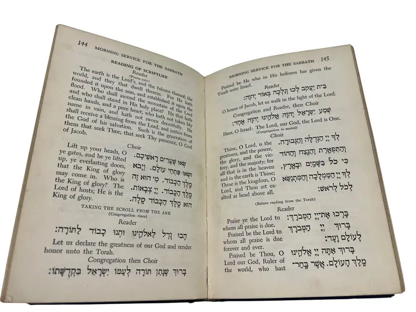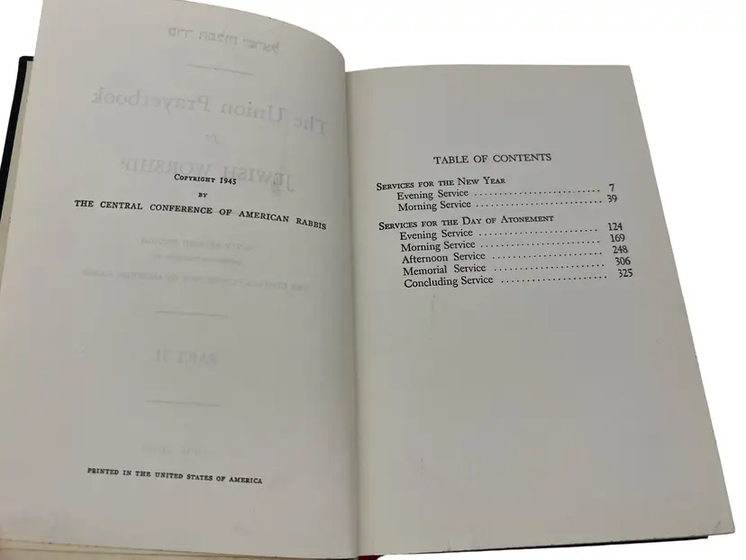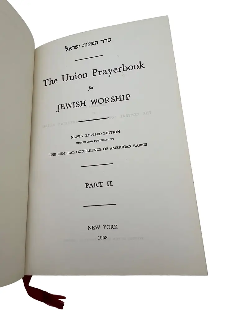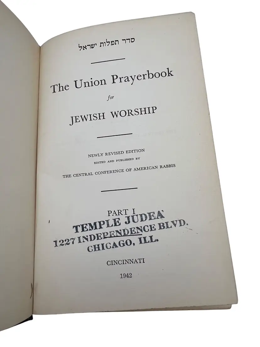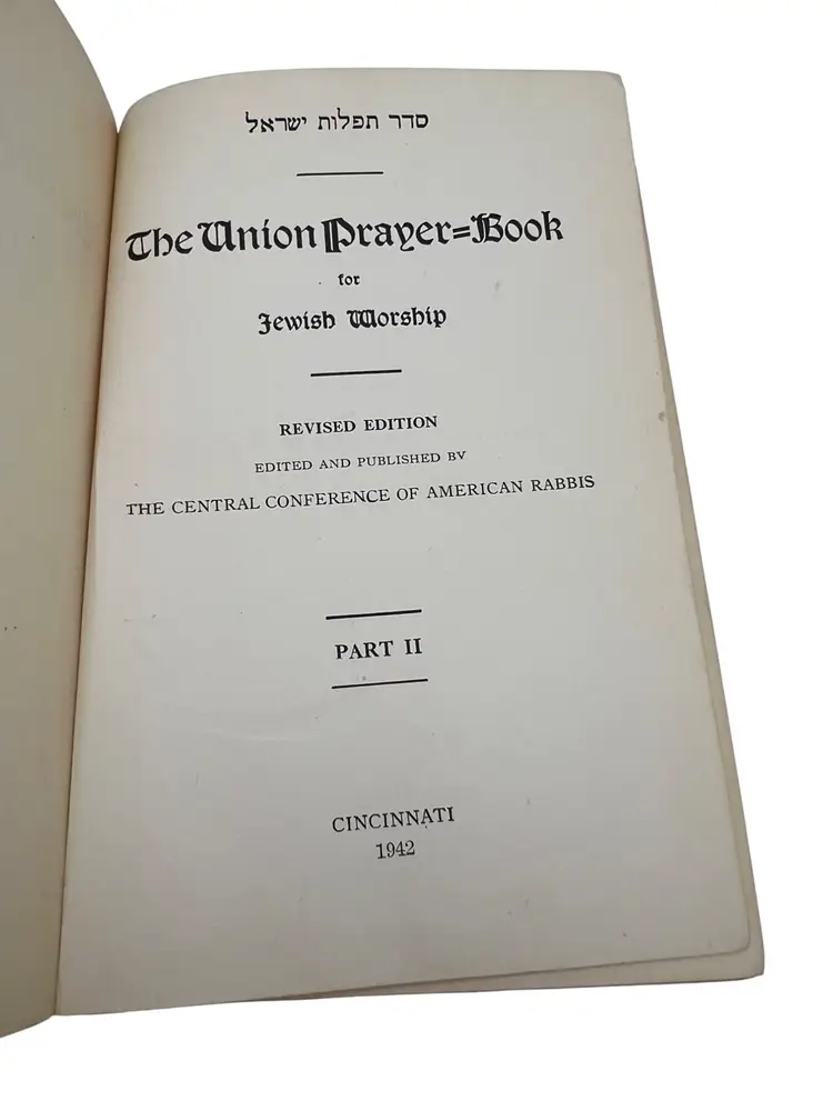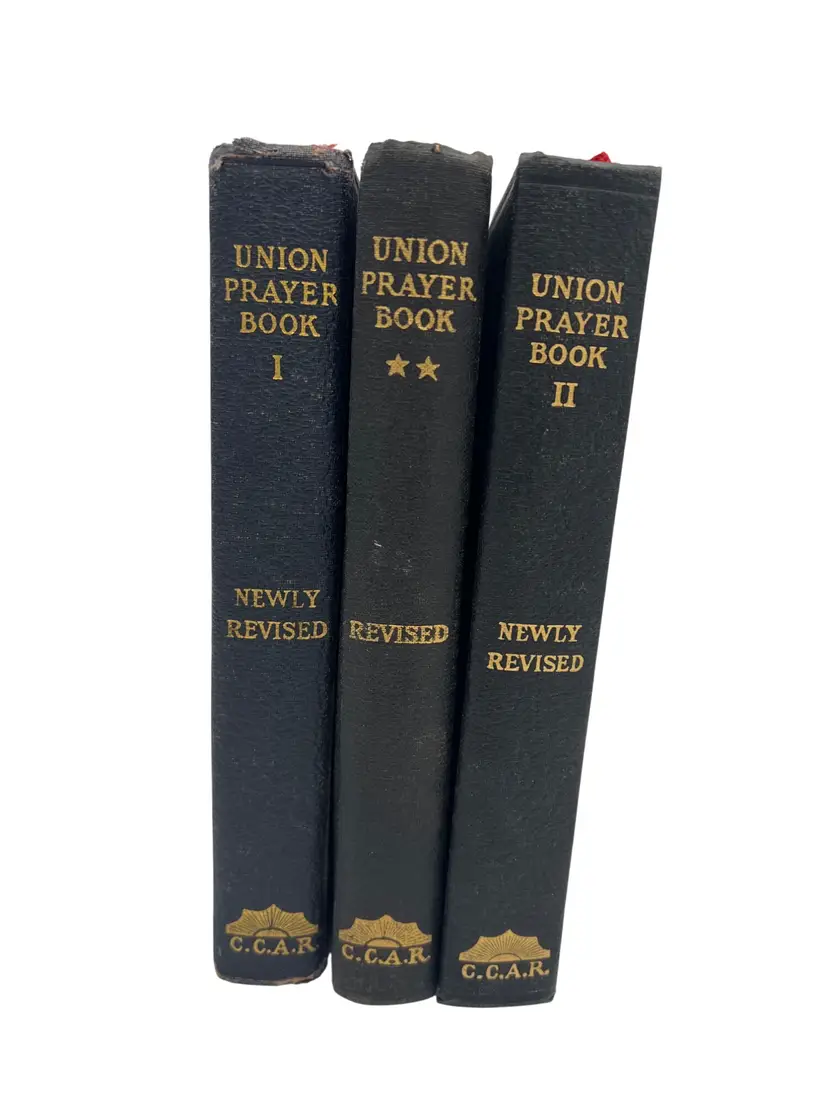 Lot of three vintage Hebrew/English Reform Jewish siddurim: The Union Prayer Book (CCAR) — one volume Part I (Newly Revised, 1942) + two copies of Part II (Newly Revised/1942 & Revised/1958) in hardcover, small format approximately 6.75″ × 4.5″. Published by the Central Conference of American Rabbis. Includes Hebrew and English text for Sabbath, festivals, weekdays, and the High Holy Days. A nice Judaica collectible set for Reform movement history.