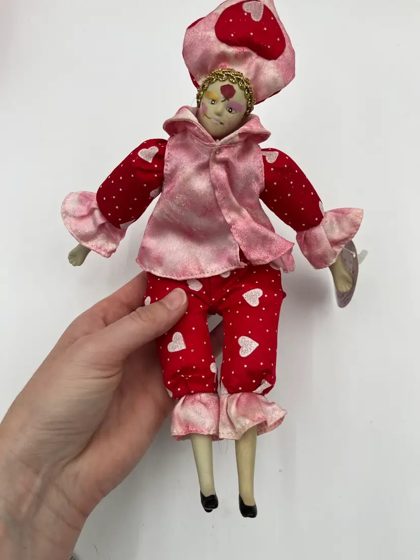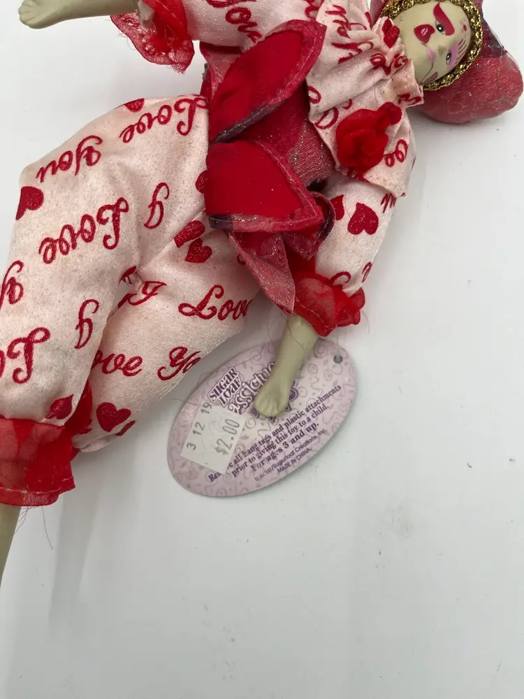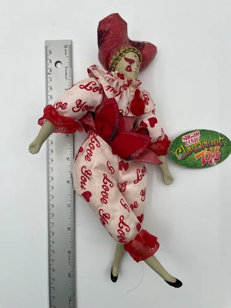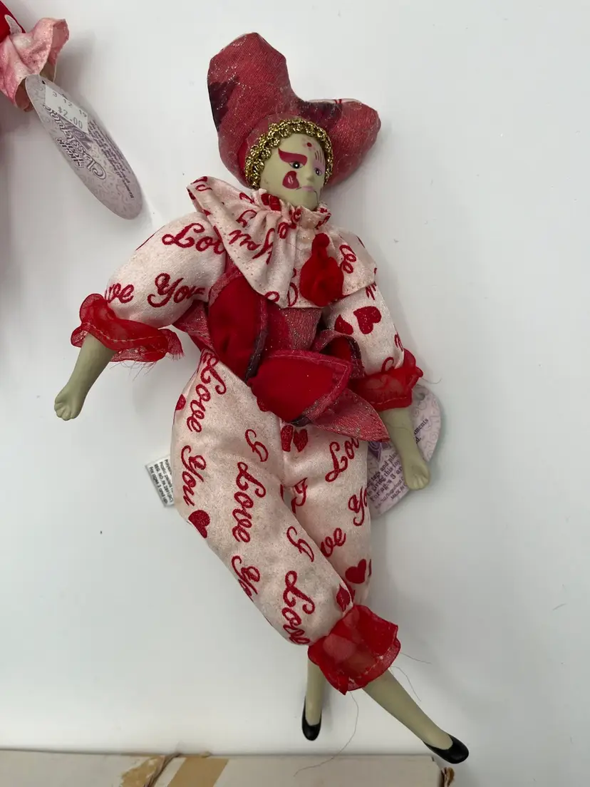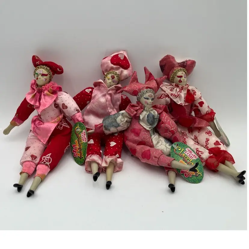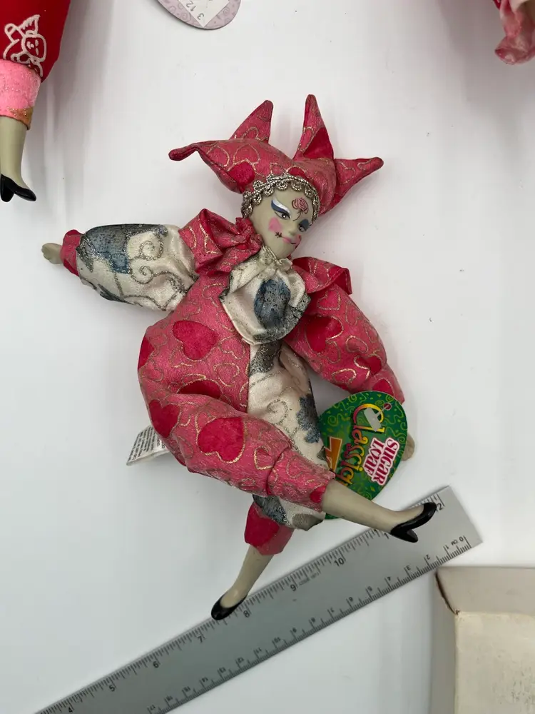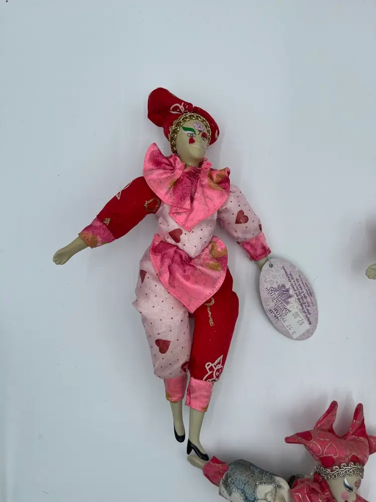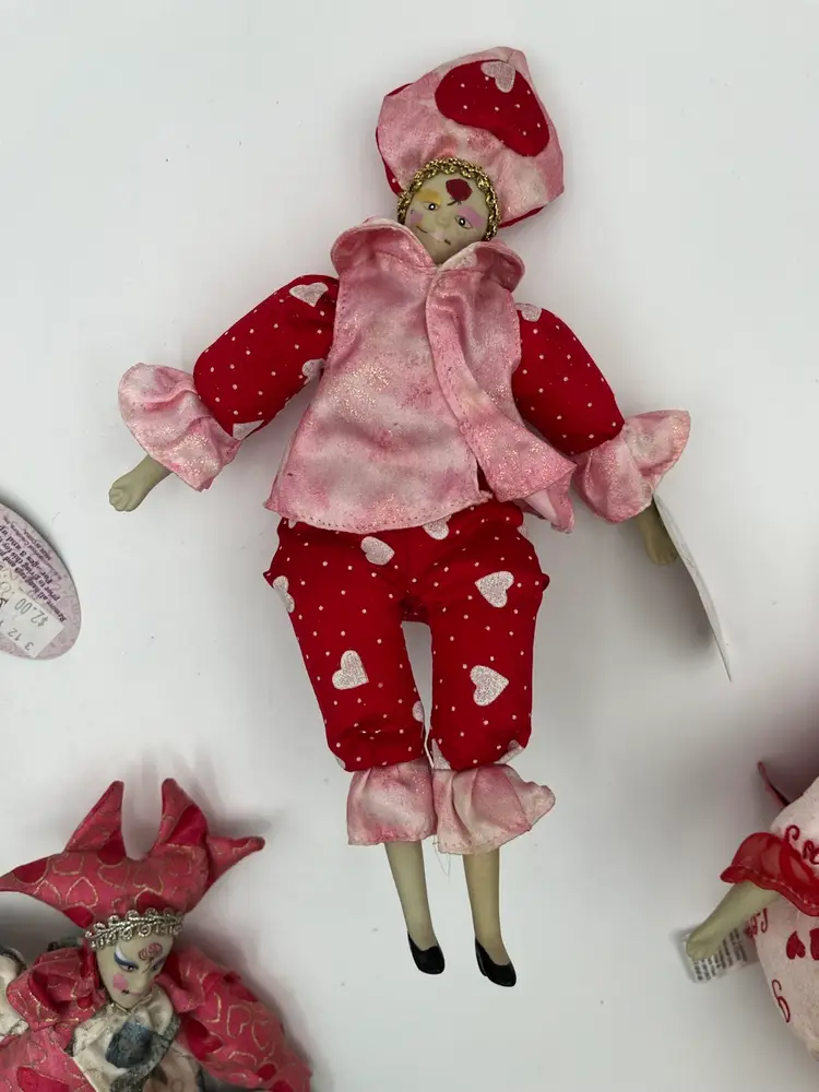 The lot includes four small Valentine-themed Sugar Loaf Classiques dolls, featuring a clown, jester, and harlequin in pink and red colors. These vintage artist dolls have a light complexion and are part of a set that also includes a larger doll. The Doll Size can be observed in the pictures provided, showcasing the intricate designs and charming details of these unique dolls. Perfect for collectors or those who appreciate artisan dolls with a playful and festive theme.