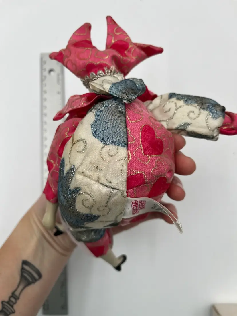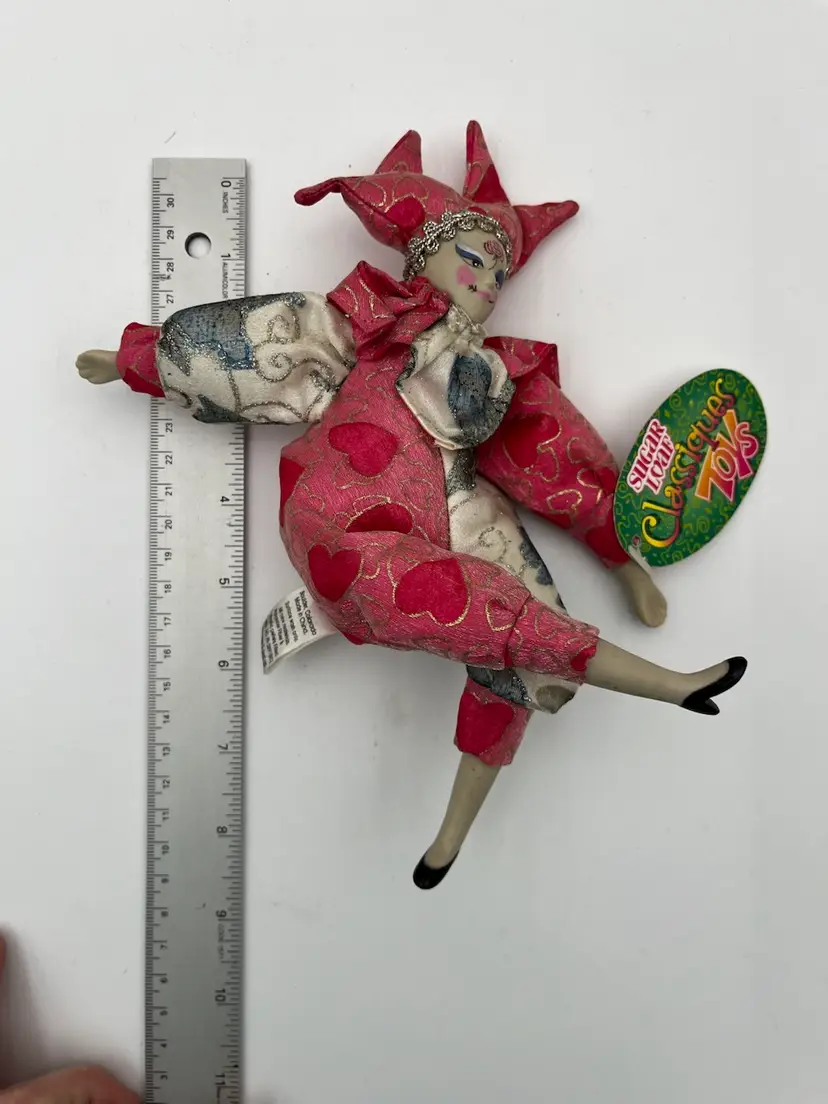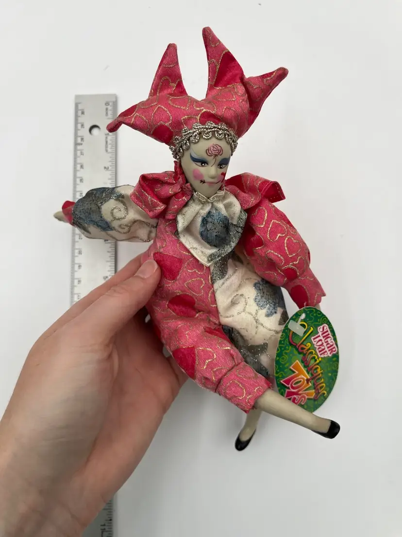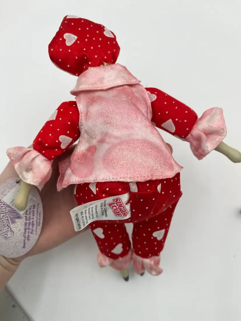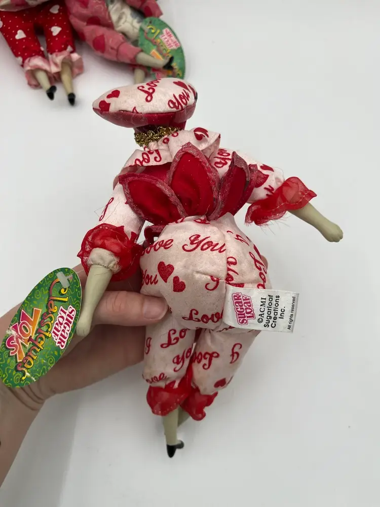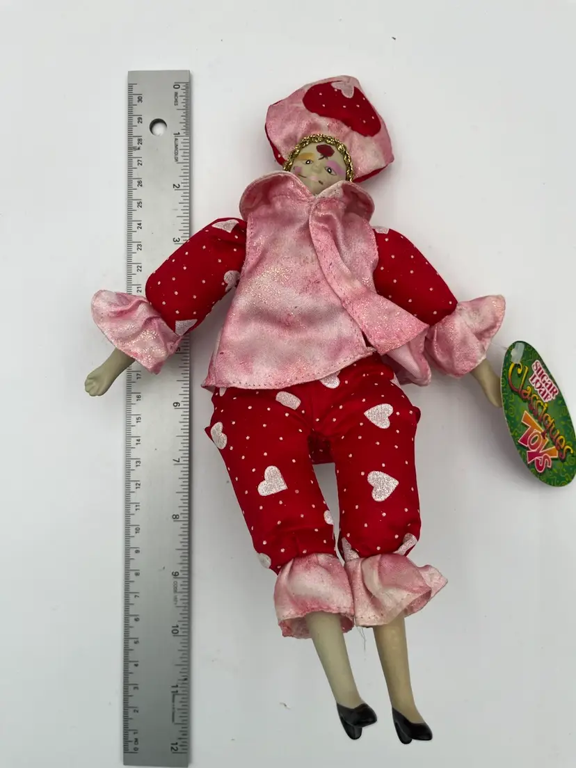The lot includes four small Valentine-themed Sugar Loaf Classiques dolls, featuring a clown, jester, and harlequin in pink and red colors. These vintage artist dolls have a light complexion and are part of a set that also includes a larger doll. The Doll Size can be observed in the pictures provided, showcasing the intricate designs and charming details of these unique dolls. Perfect for collectors or those who appreciate artisan dolls with a playful and festive theme.