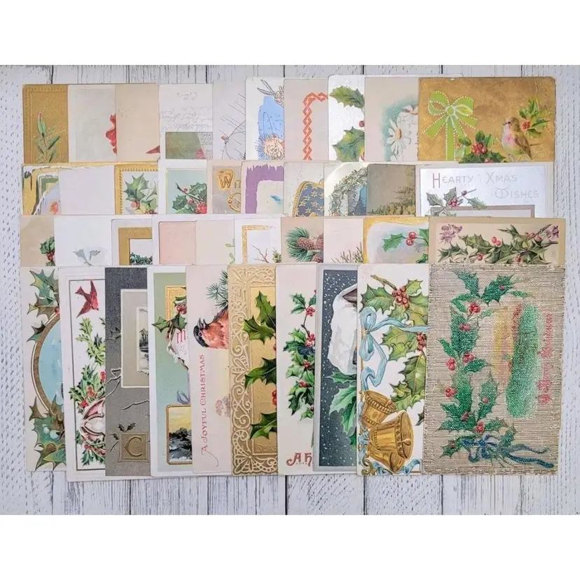 This lot of vintage postcards features 40 unique pieces, each with its own individual design and theme. The postcards are perfect for collectors or those interested in unique and historical items. The lot includes postcards with a variety of subjects, including birds, Christmas, and birthdays.