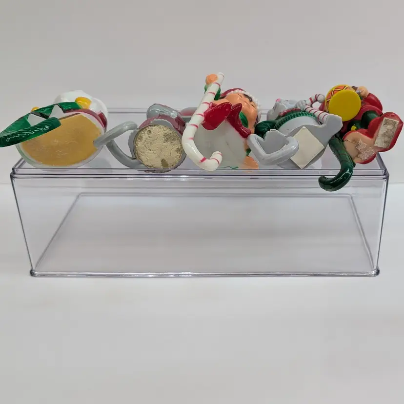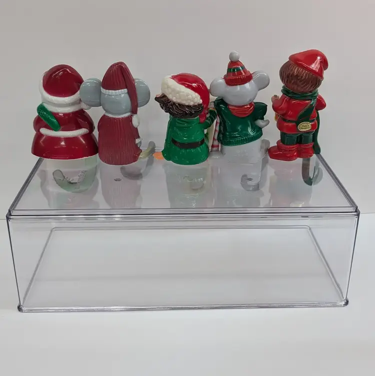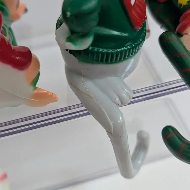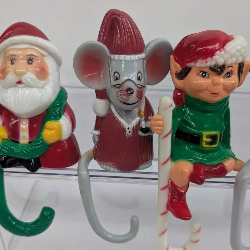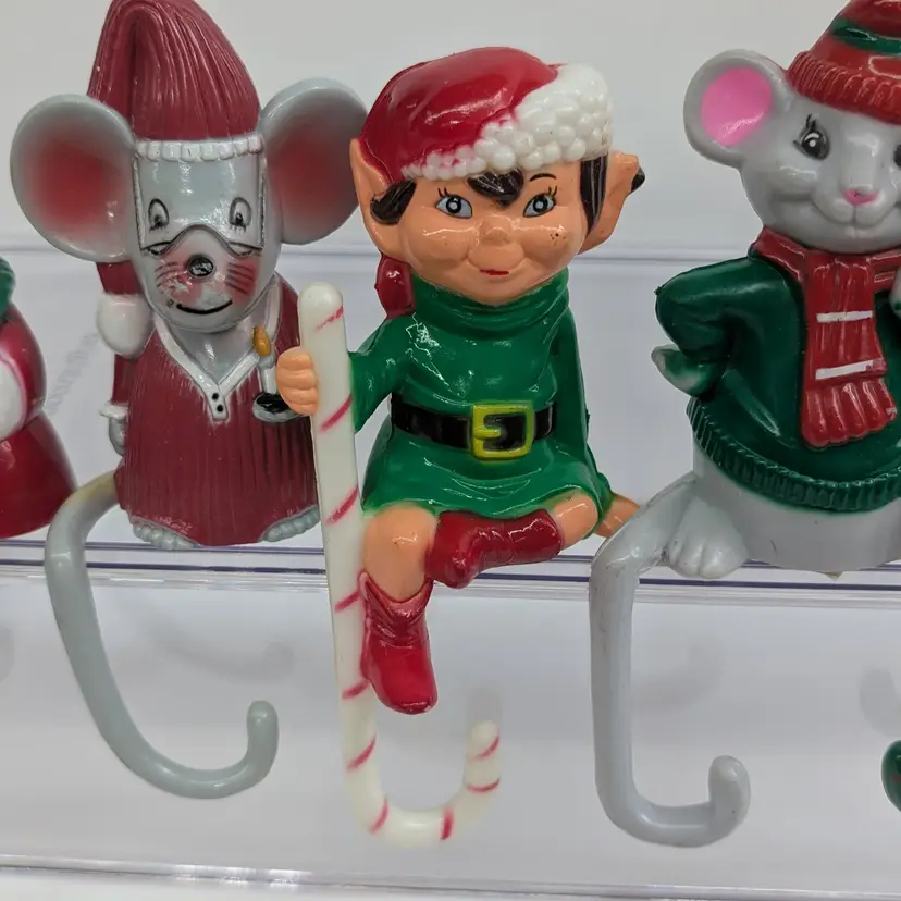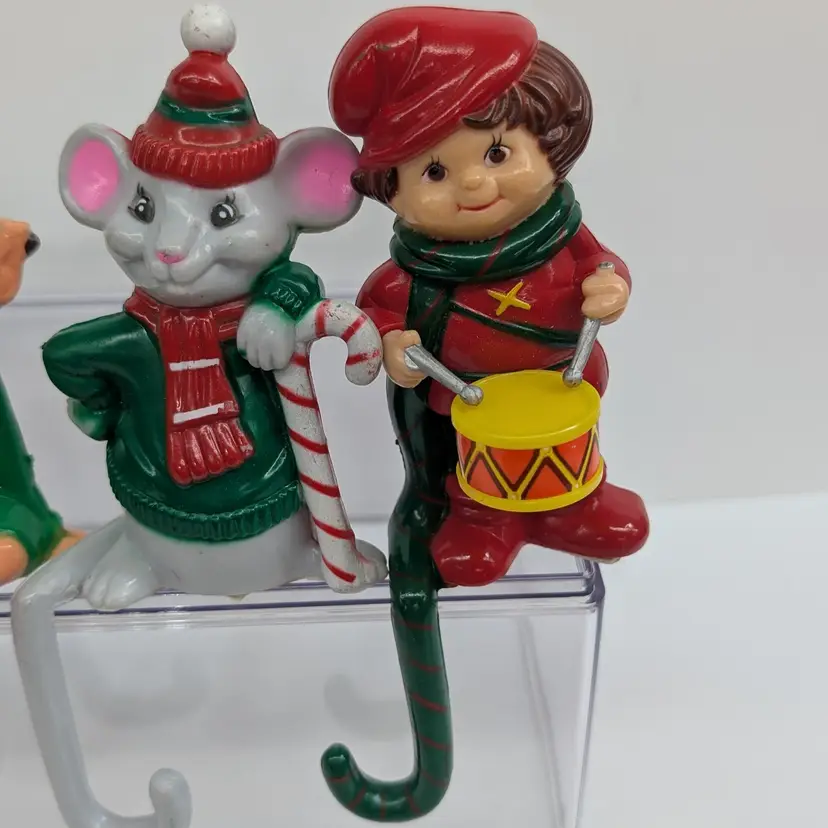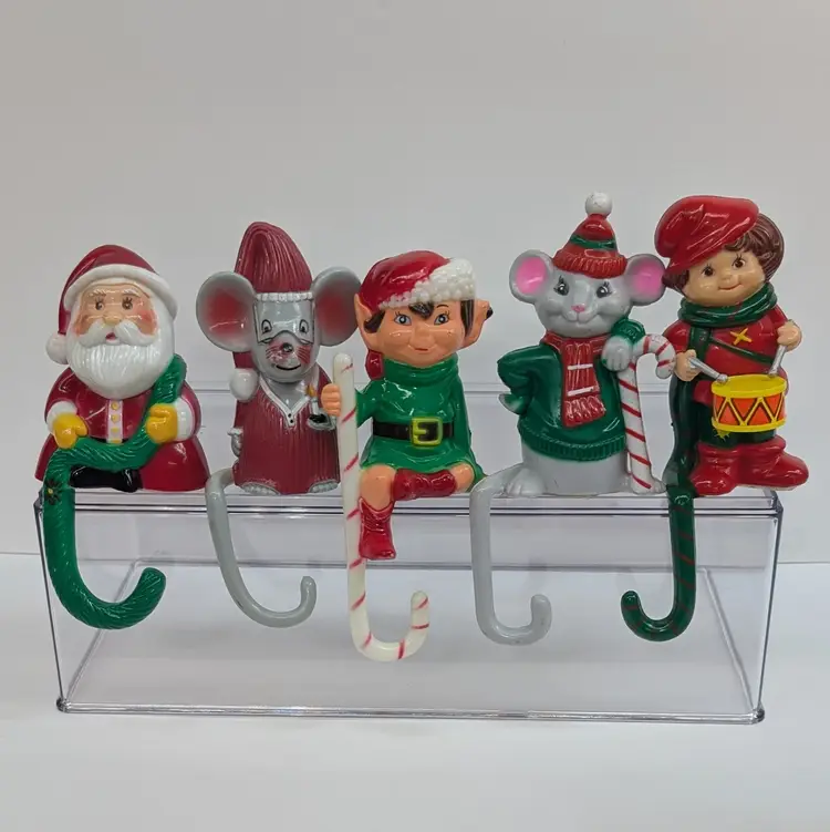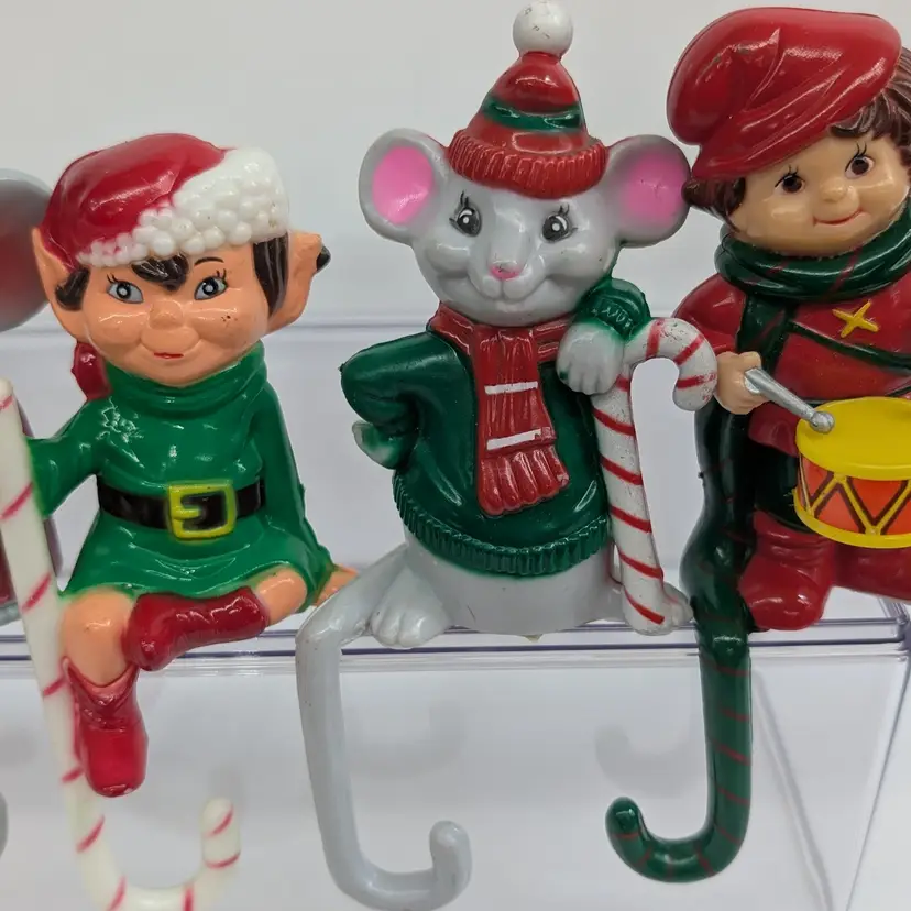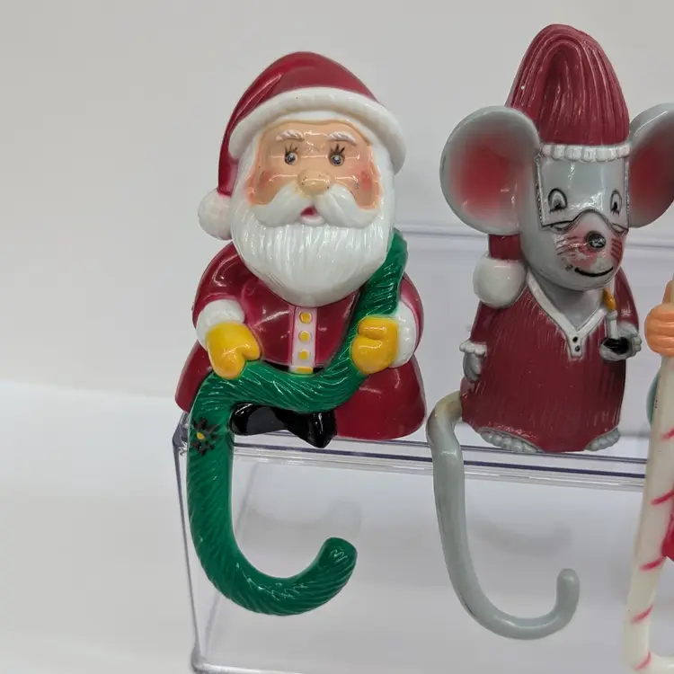 Set of 5 assorted Christmas plastic stocking holders. From both Sun Hill (Santa, Nightcap Mouse) and J.S.N.Y. (Elf, Mouse with Candy Cane & Drummer Boy). In used condition with some wear, yellowing, used stickers on bottom (see pictures). Perfect addition for a touch of vintage on your mantel. Measurements ~ 2.75-3.5 x 2.25-2.75 x 6-7"