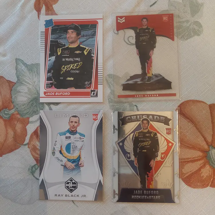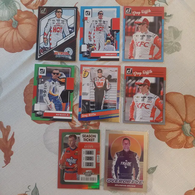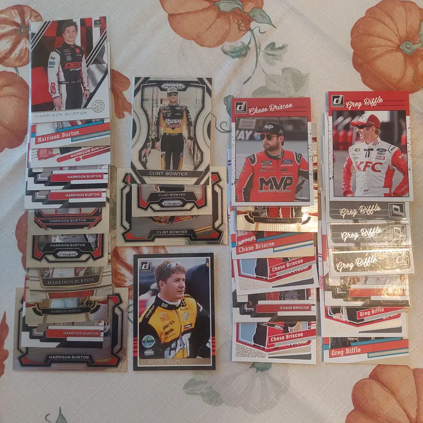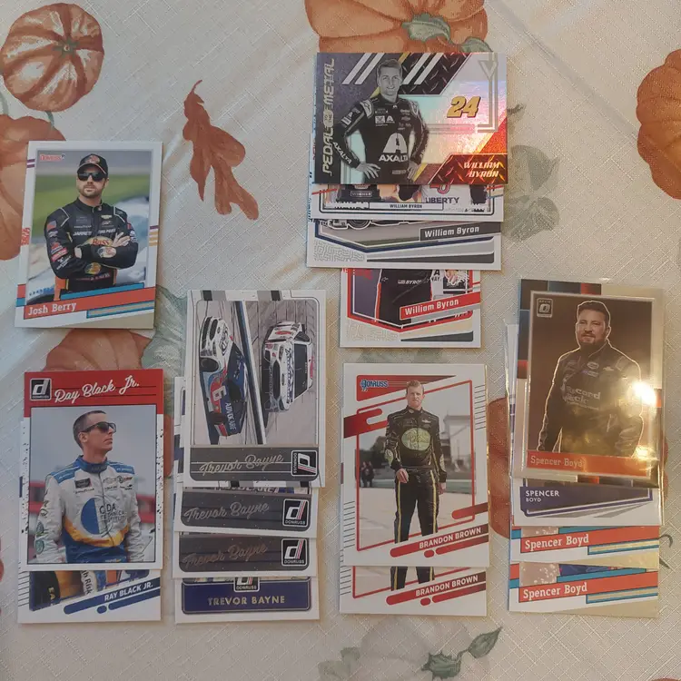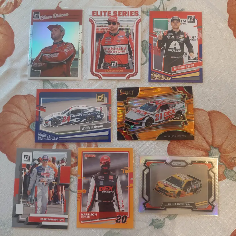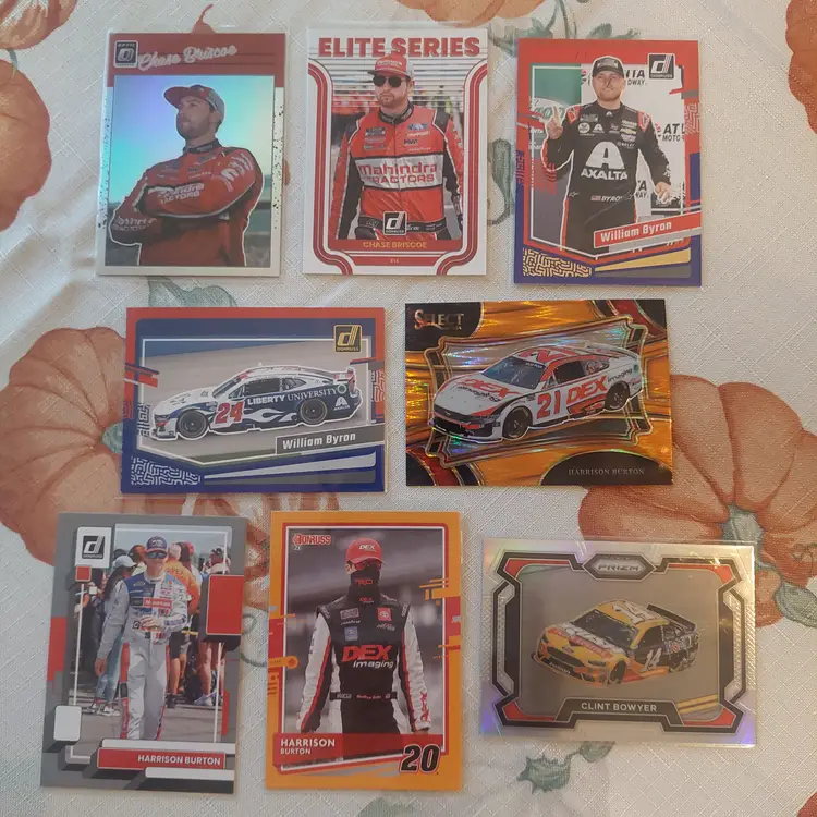 Chase Briscoe 2023 Donruss Optic silver Prizm. Chase Briscoe 2023 Donruss Elite Series Insert. William Byron 2024 Donruss Red Blue parallel. William Byron car 2024 Donruss Red Blue Parallel. Harrison Burton 2024 Panini Select orange flash Prizm. Harrison Burton 2023 Donruss silver Parallel. Harrison Burton 2021 Donruss orange parallel. Clint Bowyer 2024 Panini Prizm Silver Parallel. Greg Biffle 2024 Donruss Retro series Insert. Greg Biffle 2023 Donruss blue parallel. Greg Biffle 2023 Donruss Retro blue parallel. Ray Black, Jr. 2023 Donruss lime green Parallel. Greg Biffle 2024 Donruss Red Blue Parallel. Greg Biffle 2023 Donruss silver Parallel. Brandon Brown 2022 Panini Chronicles Contenders Optic green Parallel. Brandon Brown 2022 Panini Chronicles Overdrive.