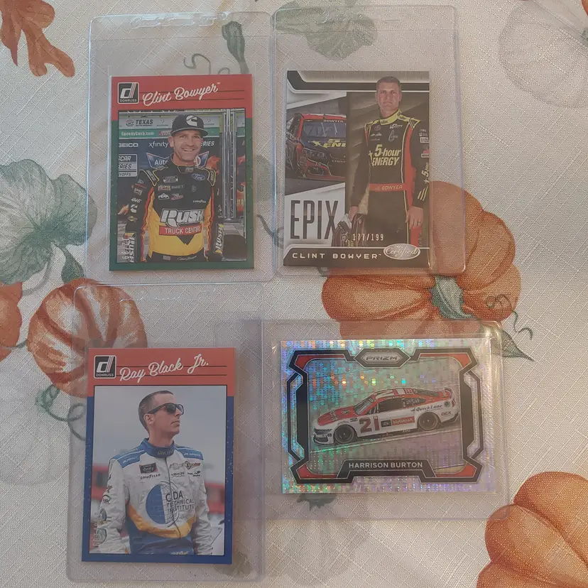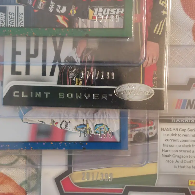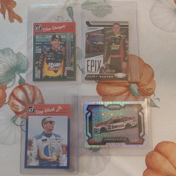 Clint Bowyer 2023 Donruss green Parallel #12/99. Clint Bowyer 2023 Panini certified epix #177/199. Ray Black, Jr. 2023 Donruss navy blue parallel #188/199. Harrison Burton 2024 Panini Prizm pulsar Prizm #201/399.